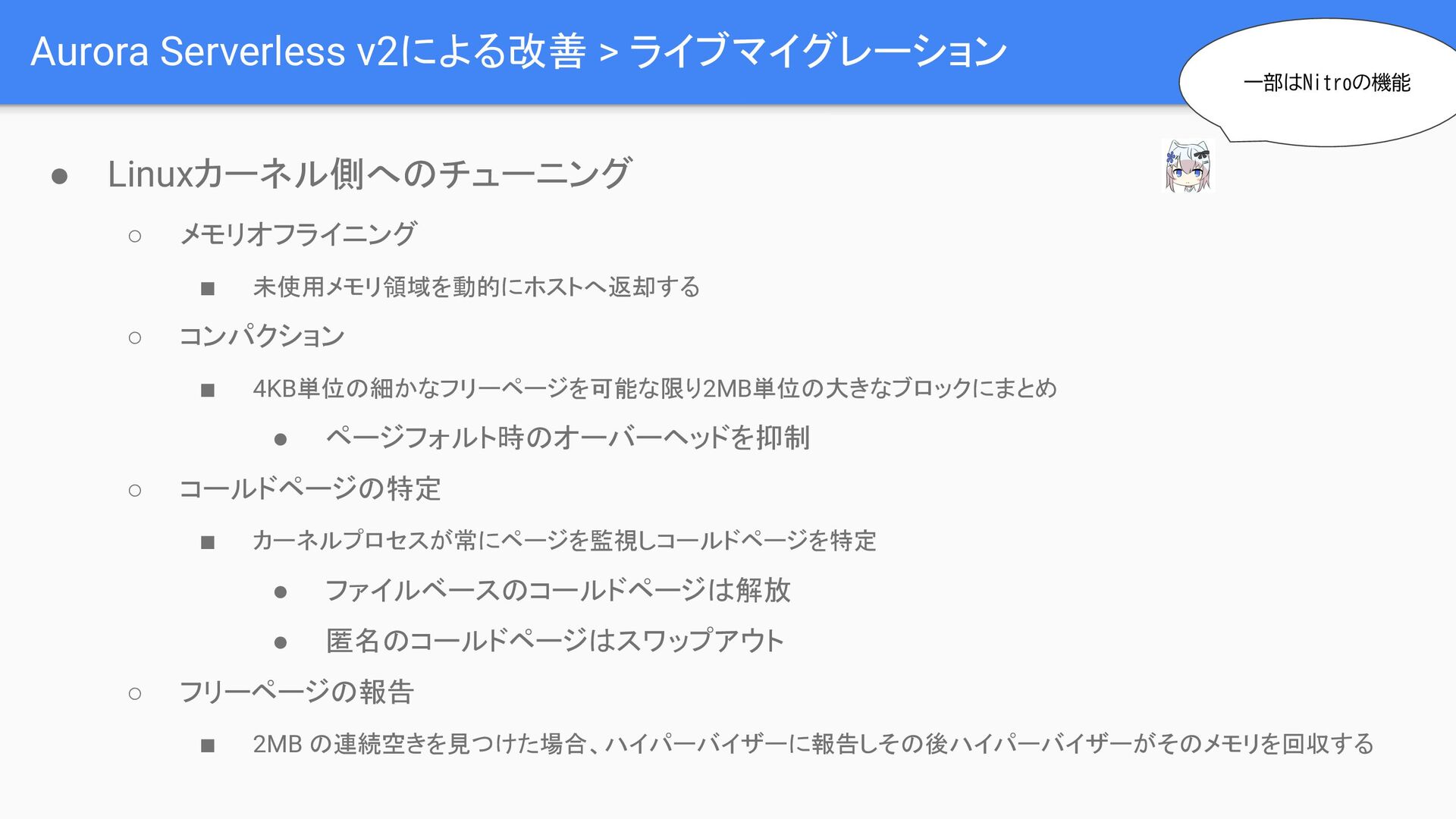 Aurora Serverless v2による改善 > ライブマイグレーション • Linuxカーネル側へのチューニング ◦ メモリオフライニング ▪