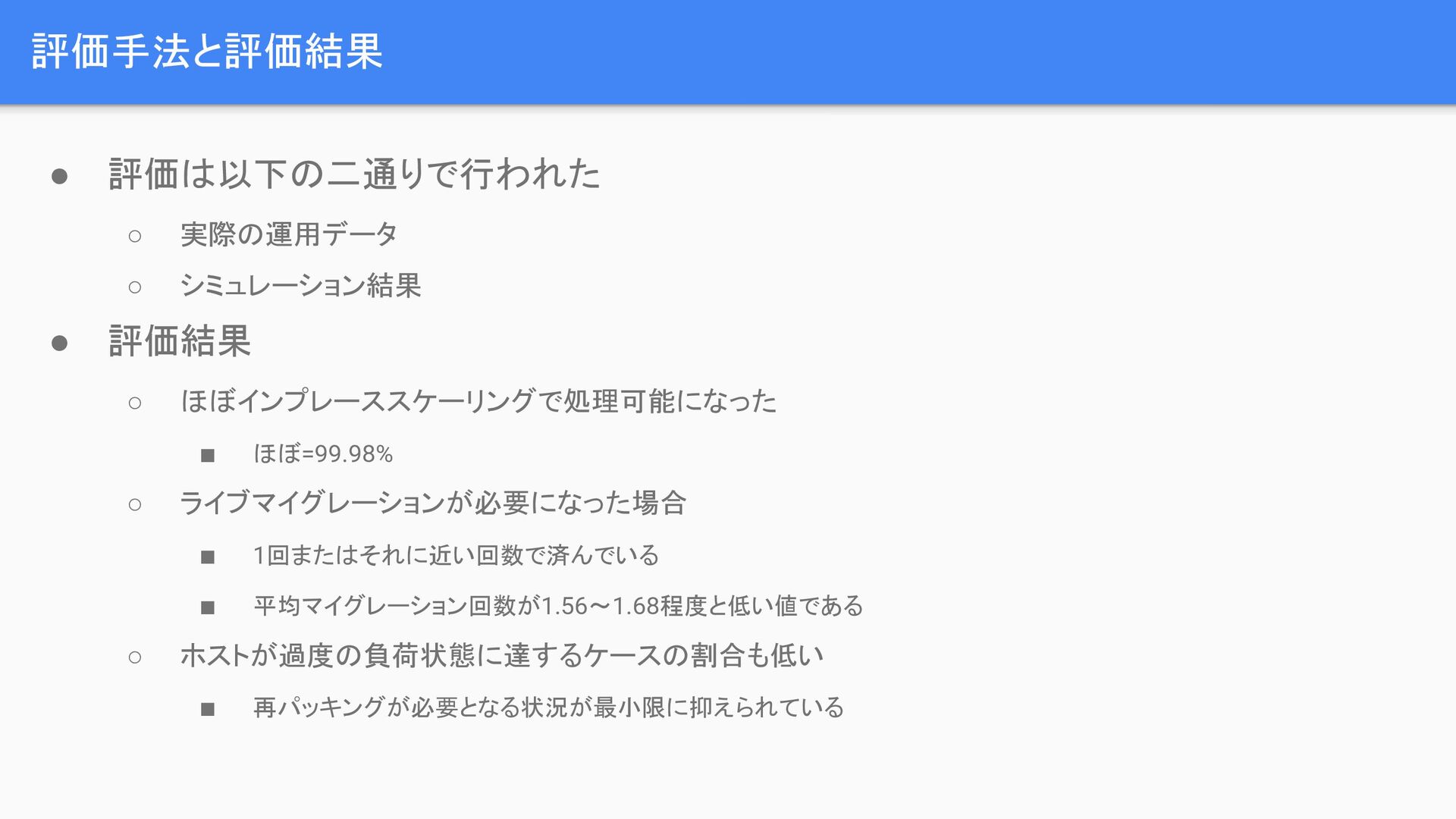 ホストを意図的にアンバランスに配置している ◦ リソースの空きがあるホストを用意し、ライブマイグレーション先を確保している ◦ 異なるワークロードを同一ホストに配置し、パッキング密度を上げている ▪ CPU集約型、メモリ集約型、ネットワーク集約型 • データベース内の内部メトリクスを用いて精度の高いマイグレーションが実現 ◦ バッファプール使用状況、最大値 ◦ ワーキングセットのサイズ推定値 • Linuxカーネル側へのチューニング ◦ メモリオフライニングとコンパクション ライブマイグレー ションはおそらくVM のライブマイグレー ション(明示はされ てないけど...)