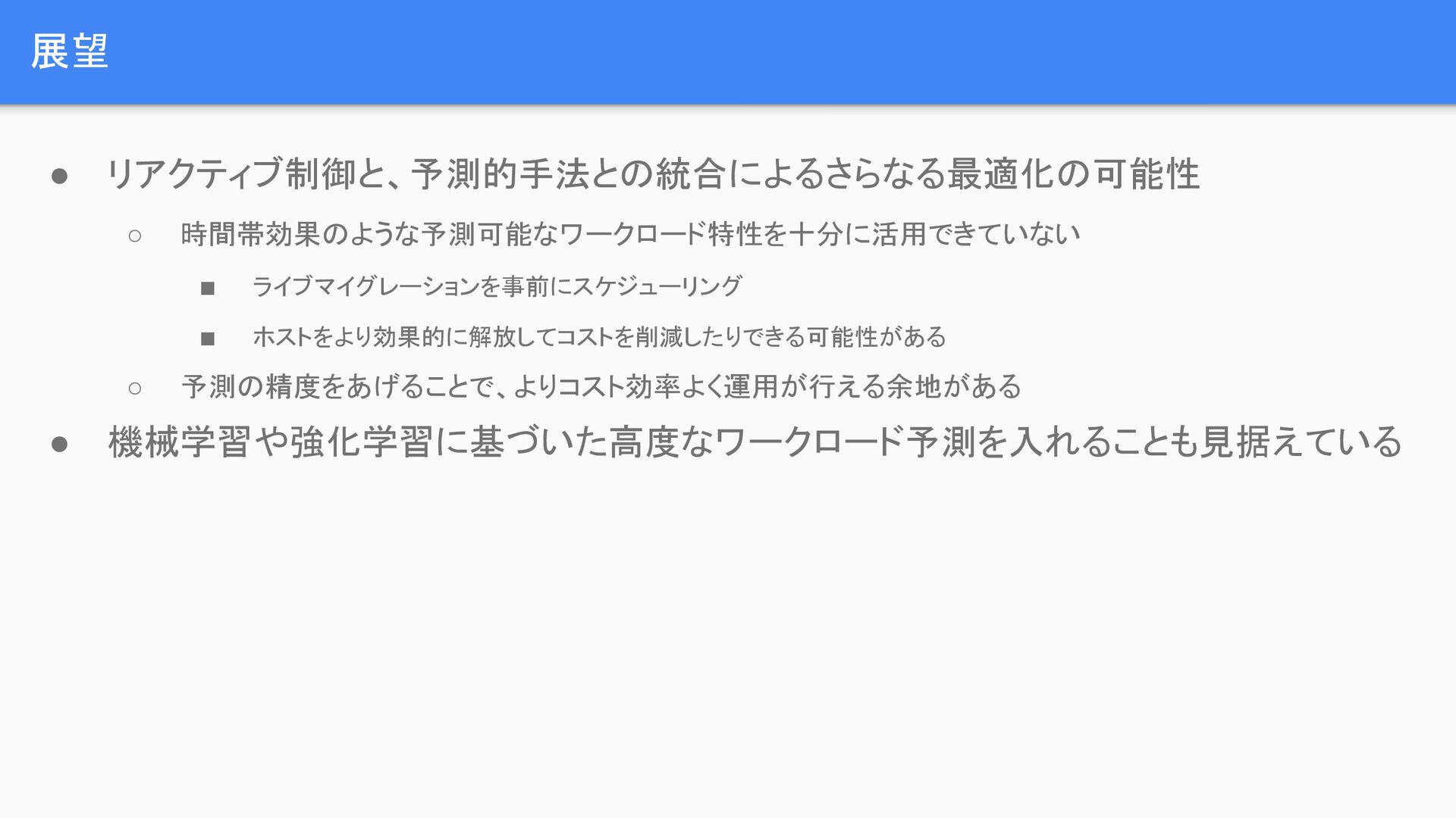 展望 • リアクティブ制御と、予測的手法との統合によるさらなる最適化の可能性 ◦ 時間帯効果のような予測可能なワークロード特性を十分に活用できていない ▪ ライブマイグレーションを事前にスケジューリング ▪ ホストをより効果的に解放してコストを削減したりできる可能性がある ◦