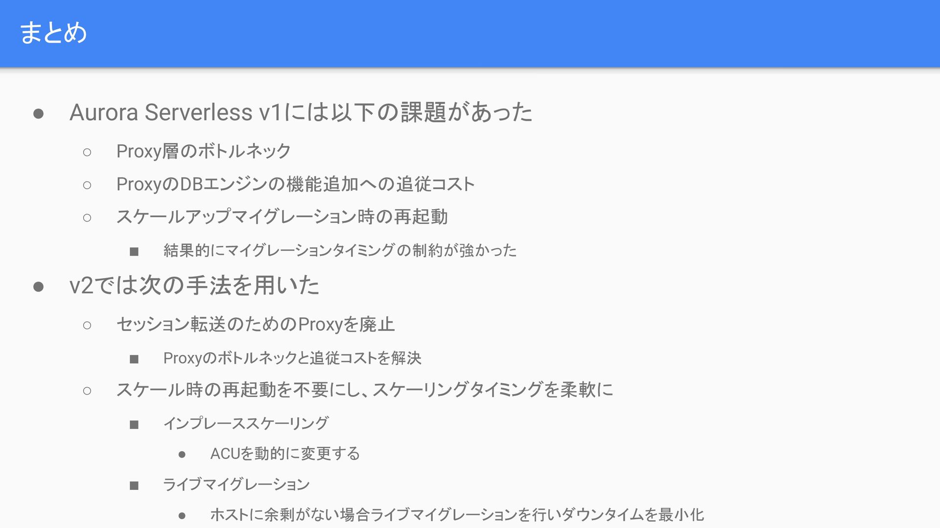 まとめ • Aurora Serverless v1には以下の課題があった ◦ Proxy層のボトルネック ◦ ProxyのDBエンジンの機能追加への追従コスト ◦