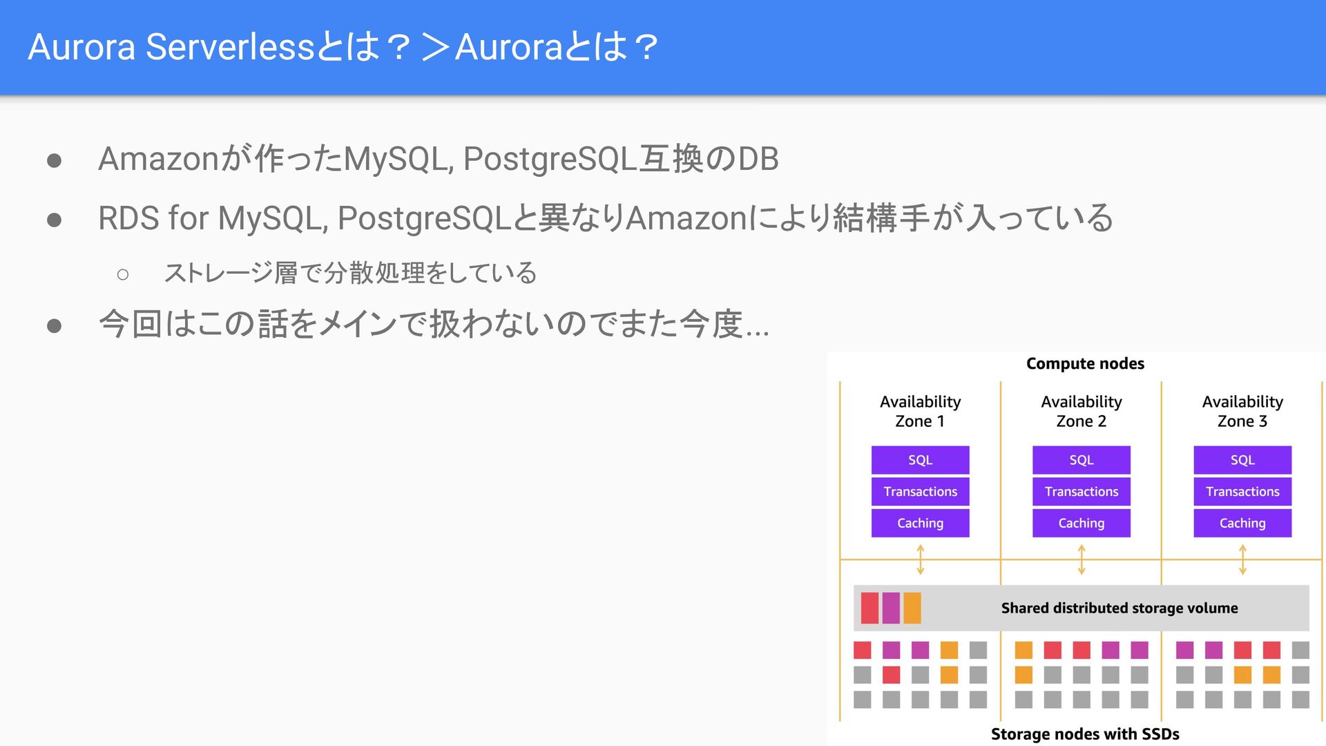Aurora Serverlessとは?>Auroraとは? • Amazonが作ったMySQL, PostgreSQL互換のDB • RDS for MySQL, PostgreSQLと異なりAmazonにより結構手が入っている