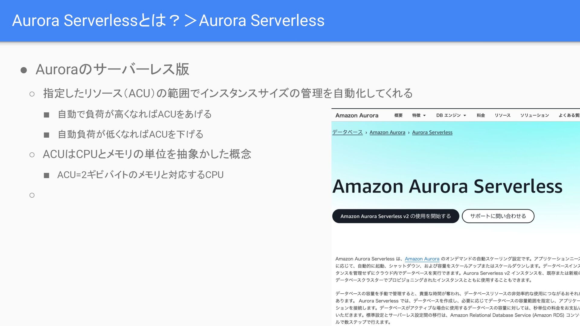 • Auroraのサーバーレス版 ◦ 指定したリソース(ACU)の範囲でインスタンスサイズの管理を自動化してくれる ▪ 自動で負荷が高くなればACUをあげる ▪ 自動負荷が低くなればACUを下げる ◦ ACUはCPUとメモリの単位を抽象かした概念