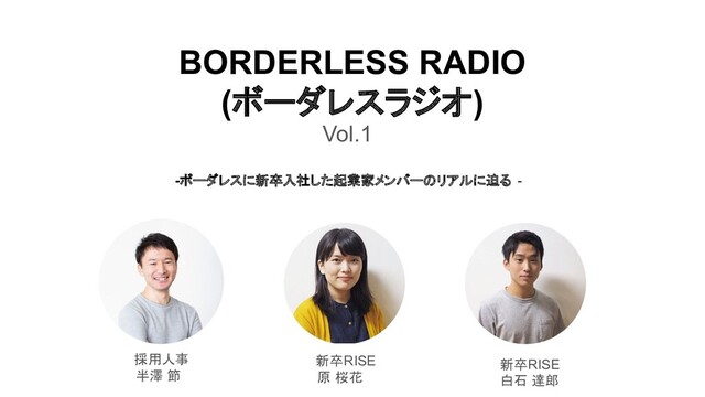 第一回BORDERLSS RADIO(ボーダレスラジオ)は、今年4月に入社し社会起業家を目指す二人(原桜花と白石達郎)に話を聞きました。2ヶ月間ボーダレスで過ごした彼らの日常に迫ります。