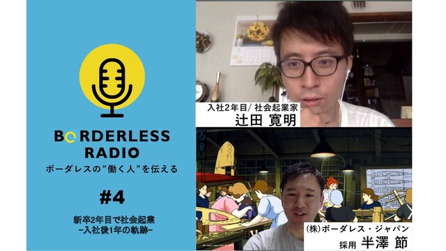 ボーダレスグループの"働く人"を伝えるBORDERLESS RADIO(ボーダレスラジオ)。 第四回目は新卒入社2年目、先日事業を正式にスタートした起業家・辻田寛明(じーつー)さんをゲストにお招きし学生時代~入社1年どんな日々を過ごしていたか、詳しくお聞きしました。パーソナリティーはボーダレス・ジャパン採用人事の半澤。 →https://anchor.fm/borderless-radio/episodes/4-1-BORDERLESS-RADIO4-1-eidegl