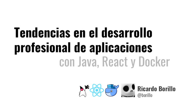 Durante la sesión examinaremos el conjunto de herramientas y prácticas que no deben faltar en mi entorno de desarrollo ágil, qué arquitectura y tecnologías deberían tener mis aplicaciones web ricas con Java y React, y cómo Docker y el Cloud pueden ayudarnos a tener éxito en entornos que necesitan ser flexibles y altamente escalables.
