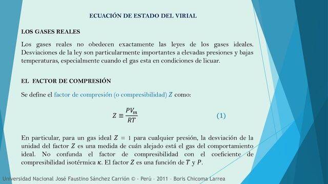 - Perú – 2011 – Boris Chicoma Larrea Los gases reales no obedecen exactamente las leyes de los gases ideales. Desviaciones de la ley son particularmente importantes a elevadas presiones y bajas temperaturas, especialmente cuando el gas esta en condiciones de licuar. EL FACTOR DE COMPRESIÓN Se define el factor de compresión (o compresibilidad) 𝑍 como: 𝑍 ≡ 𝑃𝑉 𝑚 𝑅𝑇 (1) En particular, para un gas ideal 𝑍 = 1 para cualquier presión, la desviación de la unidad del factor 𝑍 es una medida de cuán alejado está el gas del comportamiento ideal. No confunda el factor de compresibilidad con el coeficiente de compresibilidad isotérmica 𝜅. El factor 𝑍 es una función de 𝑇 y 𝑃. ECUACIÓN DE ESTADO DEL VIRIAL