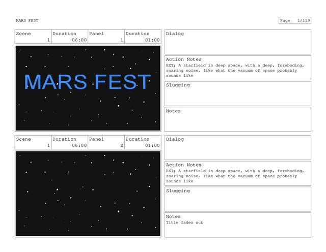 What the fuck? Fuck you man, I didn?t go into space to work for your ass! Action Notes Slugging Notes Scene 7_A. Duration 35:00 Panel 31 Duration 01:00 Dialog HUSK: But keep calm, listen to the Party Mates, and we?ll all have a great time in space! Otherwise, I dunno, masks will drop from the overhead, keep your tray tables stowed, seat backs in the upright position and life jackets are under the seat in front of you, yadda yadda? Action Notes Slugging Notes MARS FEST Page 52/119