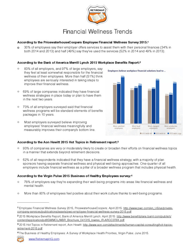 Wellness Survey 2015: 1 o 30% of employees say their employer offers services to assist them with their personal finances (34% in both 2014 and 2013) and half (49%) say they’ve used the services (52% in 2014 and 49% in 2013). According to the Bank of America Merrill Lynch 2015 Workplace Benefits Report: 2 o 83% of all employers, and 97% of large employers, say they feel at least somewhat responsible for the financial wellness of their employees. More than half (51%) think employees are seriously interested in taking steps to improve their financial wellness. o 69% of large companies indicated they have financial wellness strategies in place today or plan to have them in the next two years. o 73% of all employers surveyed said that financial wellness programs will be standard elements of benefits packages in 10 years. o Most employers surveyed believe improving employees’ financial wellness meaningfully and measurably improves their company’s bottom line. According to the Aon Hewitt 2015 Hot Topics in Retirement report: 3 o 93% of companies are very or moderately likely to create or broaden their efforts on financial wellness topics in a manner that extends beyond retirement decisions. o 62% of all respondents indicated that they have a financial wellness strategy, with a majority of plan sponsors having separate financial wellness and physical well-being approaches. One-quarter of all employers include financial wellness as a pillar of a broader wellness program that includes physical health. According to the Virgin Pulse 2015 Business of Healthy Employees survey: 4 o 78% of employers say they’re expanding their well-being programs into areas like financial wellness and mental health. o More than 80% of employees feel positive about their work culture thanks to well-being programs. Employee Financial Wellness Survey 2015, PricewaterhouseCoopers; April 2015: http://www.pwc.com/en_US/us/private- 1 company-services/publications/assets/pwc-employee-financial-wellness-survey-2015.pdf 2015 Workplace Benefits Report, Bank of America Merrill Lynch; April 2015: http://www.benefitplans.baml.com/publish/ 2 content/application/pdf/GWMOL/WBR_Brochure_041315_lowres_IR-ARCC3T6K.pdf 2015 Hot Topics in Retirement report, Aon Hewitt: http://www.aon.com/attachments/human-capital-consulting/hot-topics- 3 retirement-2015.pdf The Business of Healthy Employees: A Survey of Workplace Health Priorities, Virgin Pulse; June 2015. 4 www.RetiremapHQ.com