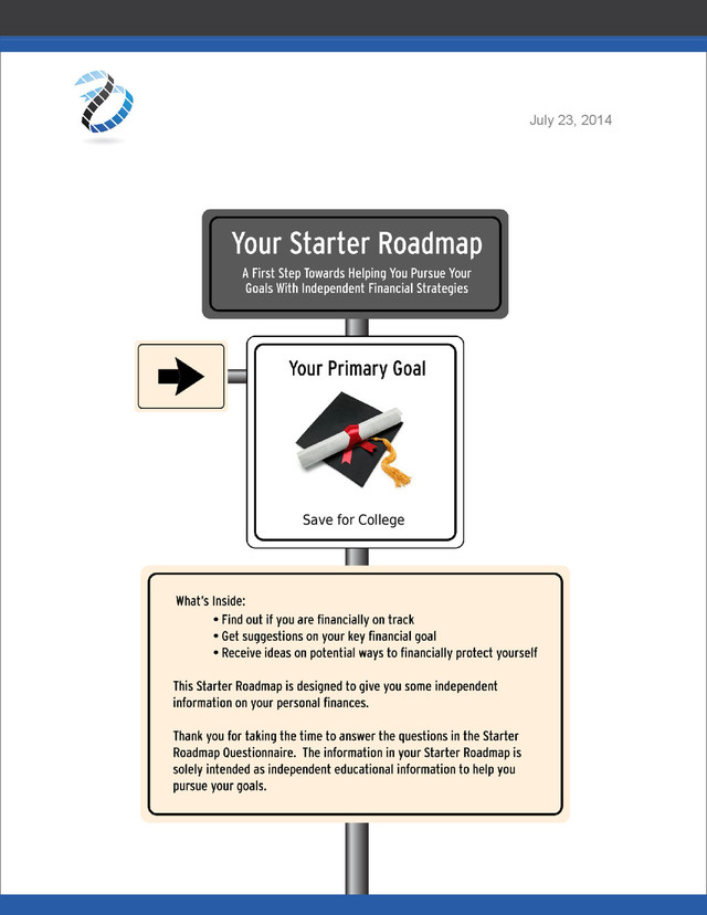 Roadmap: The Next Step To Reach Your Goal Your next step If you're really serious about reaching your goals and a financially strong future, here is one action you should consider completing in the next week. First step for Save for College Evaluate the personal importance you place on saving for college. Disclaimer IMPORTANT: The projections or other information generated by Boulevard R regarding the likelihood of various investment outcomes are hypothetical in nature, do not reflect actual investment results and are not guarantees of future results. The results generated may vary with each use and over time. Certain assets (e.g., exchange-traded funds) carry risks, including, but not limited to, loss in value. These risks are important to consider when investing. Every effort has been made to assure the highest reasonable degree of accuracy in your Starter Roadmap, based on the information you provided. This Roadmap is only as good as the information supplied by you, and if there is incorrect data, this document will reflect these inaccuracies. Due to the changing nature of laws and financial markets this Roadmap will become increasingly inaccurate over time. Please consult a tax or legal advisor prior to implementing any of the recommendations set forth within your Roadmap. This Roadmap is not to be construed as offering investment, legal, tax or accounting advice. The content that is provided is for educational purposes only. Please consult a qualified professional when making financial, legal or tax decisions. This Roadmap should not be interpreted as endorsing or promoting specific investments and consumers should be cautioned to exercise good judgment and diligence when investing. Neither financial advisor nor the service provider are under any obligation to notify you of changes or updates. Partly because your tax returns are not taken into account and your information is not verified through official records or statements, no warranties are made that your Roadmap is 100% complete. A best effort has been made based on the quality and accuracy of the information available. Hopefully, you will benefit from the educational content provided in your Roadmap. Page 5