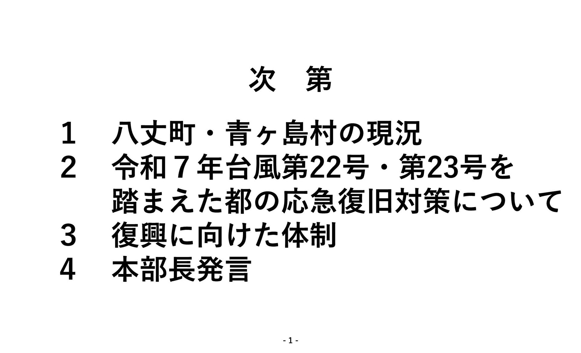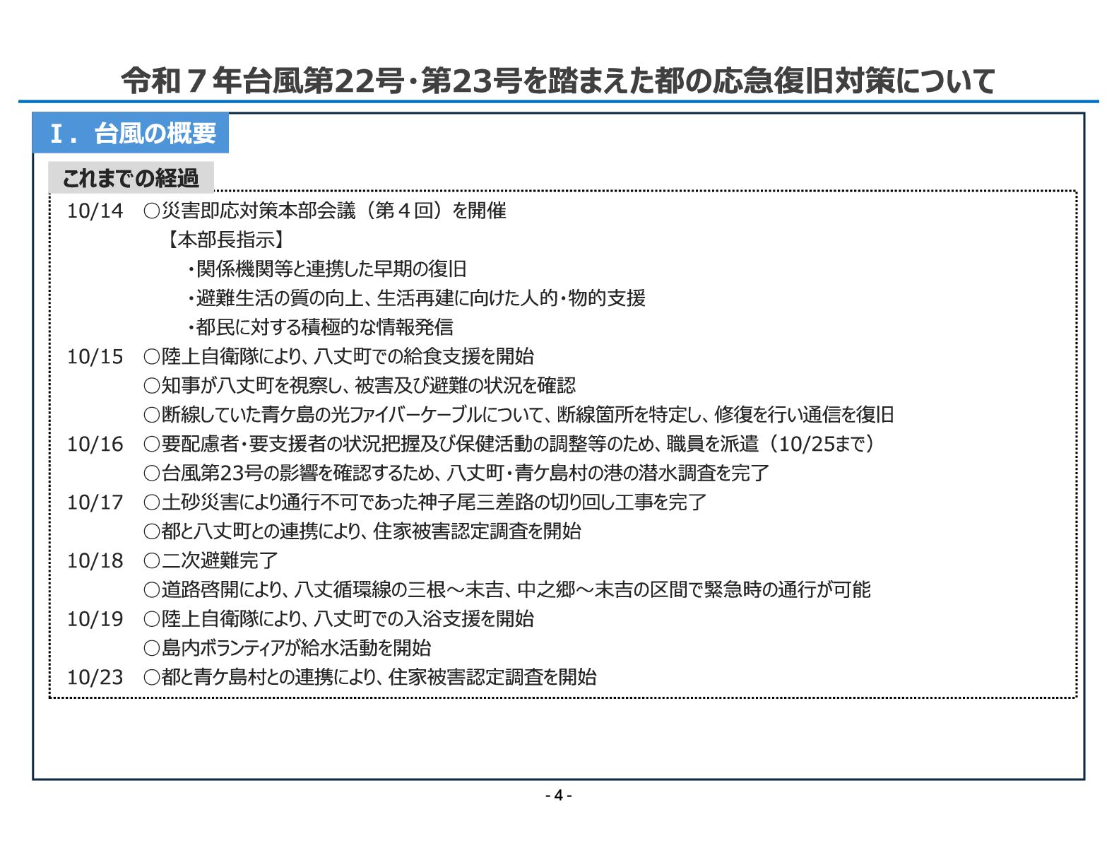 局 令和7年台風第22号・第23号を踏まえた都の応急復旧対策について Ⅰ.台風の概要 10/14 ◦災害即応対策本部会議(第4回)を開催 【本部長指示】 ・関係機関等と連携した早期の復旧 ・避難生活の質の向上、生活再建に向けた人的・物的支援 ・都民に対する積極的な情報発信 10/15 ◦陸上自衛隊により、八丈町での給食支援を開始 ◦知事が八丈町を視察し、被害及び避難の状況を確認 ◦断線していた青ケ島の光ファイバーケーブルについて、断線箇所を特定し、修復を行い通信を復旧 10/16 ◦要配慮者・要支援者の状況把握及び保健活動の調整等のため、職員を派遣(10/25まで) ◦台風第23号の影響を確認するため、八丈町・青ケ島村の港の潜水調査を完了 10/17 ◦土砂災害により通行不可であった神子尾三差路の切り回し工事を完了 ◦都と八丈町との連携により、住家被害認定調査を開始 10/18 ◦二次避難完了 ◦道路啓開により、八丈循環線の三根〜末吉、中之郷〜末吉の区間で緊急時の通行が可能 10/19 ◦陸上自衛隊により、八丈町での入浴支援を開始 ◦島内ボランティアが給水活動を開始 10/23 ◦都と青ケ島村との連携により、住家被害認定調査を開始 これまでの経過