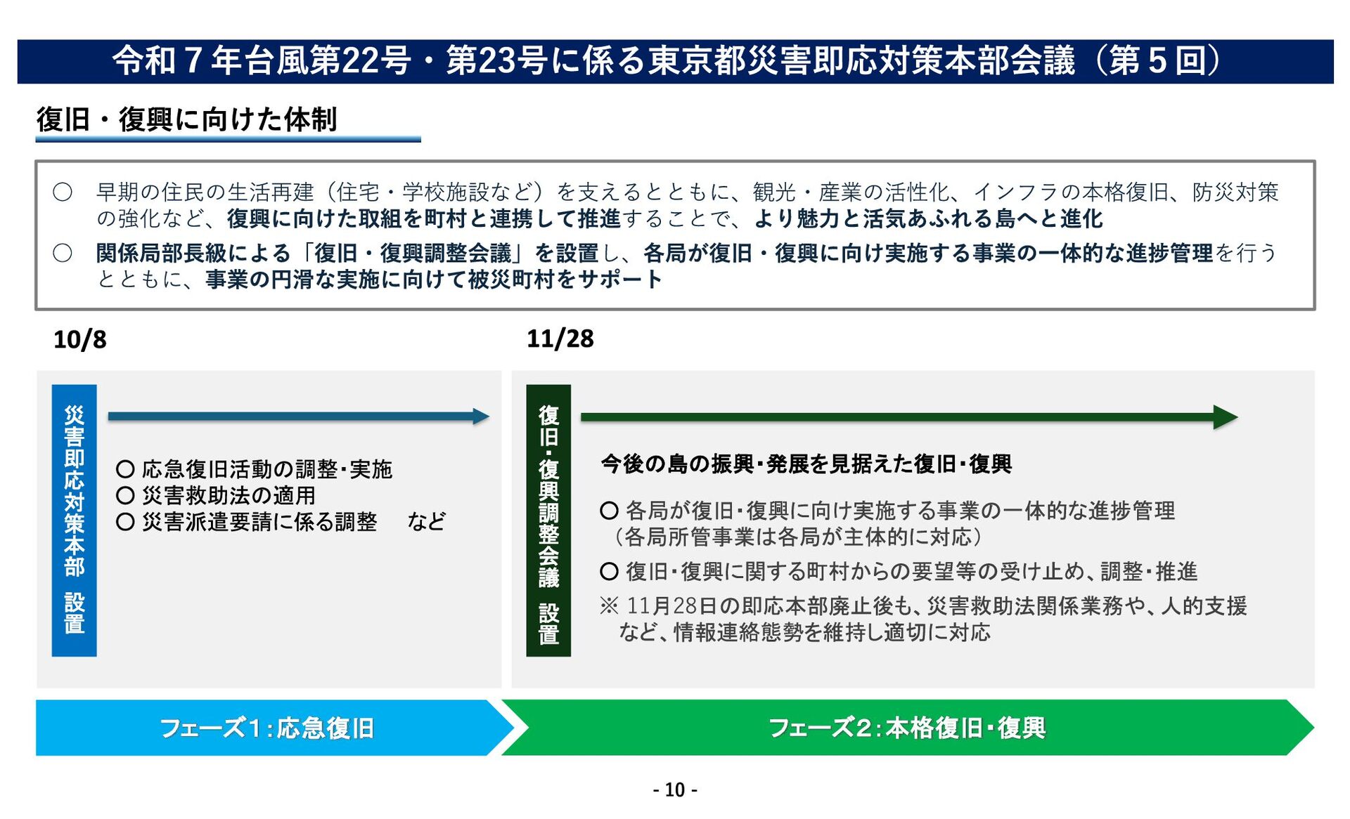 議 設 置 フェーズ1:応急復旧 フェーズ2:本格復旧・復興 ◦ 応急復旧活動の調整・実施 ◦ 災害救助法の適用 ◦ 災害派遣要請に係る調整 など 今後の島の振興・発展を見据えた復旧・復興 災 害 即 応 対 策 本 部 設 置 ◦ 各局が復旧・復興に向け実施する事業の一体的な進捗管理 (各局所管事業は各局が主体的に対応) ◦ 復旧・復興に関する町村からの要望等の受け止め、調整・推進 ※ 11月28日の即応本部廃止後も、災害救助法関係業務や、人的支援 など、情報連絡態勢を維持し適切に対応 ◦ 早期の住民の生活再建(住宅・学校施設など)を支えるとともに、観光・産業の活性化、インフラの本格復旧、防災対策 の強化など、復興に向けた取組を町村と連携して推進することで、より魅力と活気あふれる島へと進化 ◦ 関係局部長級による「復旧・復興調整会議」を設置し、各局が復旧・復興に向け実施する事業の一体的な進捗管理を行う とともに、事業の円滑な実施に向けて被災町村をサポート 令和7年台風第22号・第23号に係る東京都災害即応対策本部会議(第5回) 復旧・復興に向けた体制 - 10 -