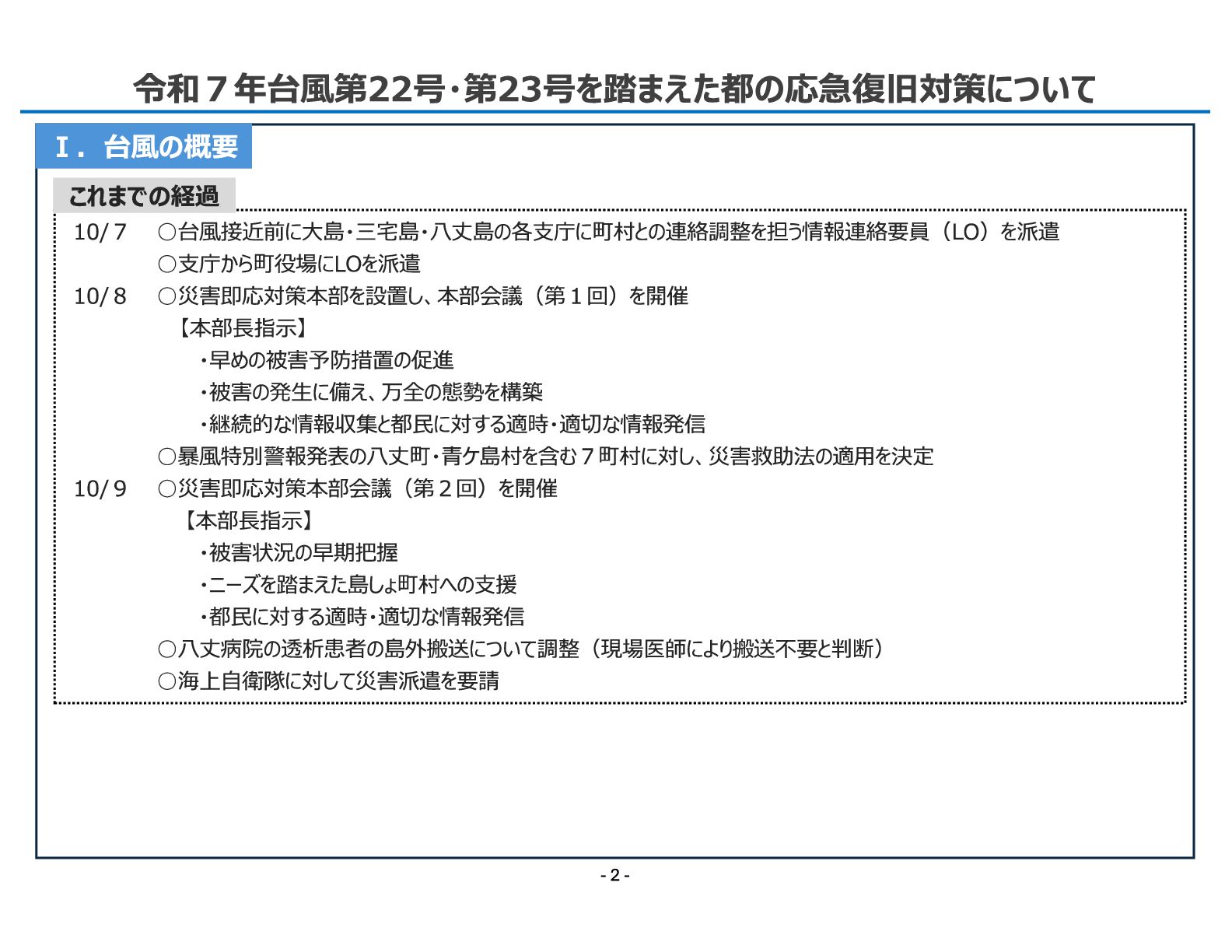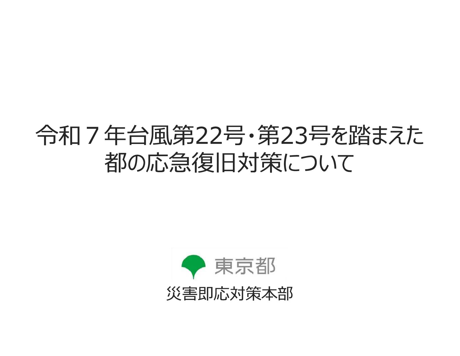 局 令和7年台風第22号・第23号を踏まえた都の応急復旧対策について Ⅰ.台風の概要 10/7 ◦台風接近前に大島・三宅島・八丈島の各支庁に町村との連絡調整を担う情報連絡要員(LO)を派遣 ◦支庁から町役場にLOを派遣 10/8 ◦災害即応対策本部を設置し、本部会議(第1回)を開催 【本部長指示】 ・早めの被害予防措置の促進 ・被害の発生に備え、万全の態勢を構築 ・継続的な情報収集と都民に対する適時・適切な情報発信 ◦暴風特別警報発表の八丈町・青ケ島村を含む7町村に対し、災害救助法の適用を決定 10/9 ◦災害即応対策本部会議(第2回)を開催 【本部長指示】 ・被害状況の早期把握 ・ニーズを踏まえた島しょ町村への支援 ・都民に対する適時・適切な情報発信 ◦八丈病院の透析患者の島外搬送について調整(現場医師により搬送不要と判断) ◦海上自衛隊に対して災害派遣を要請 これまでの経過
