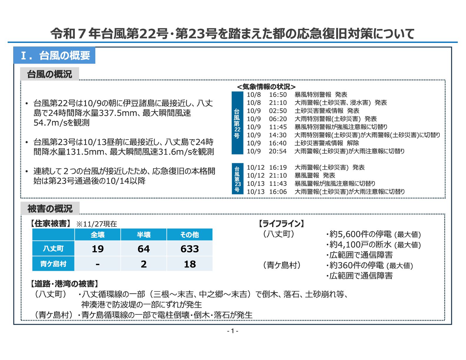 土砂災害警戒情報 発表 10/9 06:20 大雨特別警報(土砂災害) 発表 10/9 11:45 暴風特別警報が強風注意報に切替り 10/9 14:30 大雨特別警報(土砂災害)が大雨警報(土砂災害)に切替り 10/9 16:40 土砂災害警戒情報 解除 10/9 20:54 大雨警報(土砂災害)が大雨注意報に切替り 10/12 16:19 大雨警報(土砂災害) 発表 10/12 21:10 暴風警報 発表 10/13 11:43 暴風警報が強風注意報に切替り 10/13 16:06 大雨警報(土砂災害)が大雨注意報に切替り 台 風 第 号 22 台 風 第 号 23 令和7年11月12日 総 務 局 令和7年台風第22号・第23号を踏まえた都の応急復旧対策について • 台風第22号は10/9の朝に伊豆諸島に最接近し、八丈 島で24時間降水量337.5mm、最大瞬間風速 54.7m/sを観測 • 台風第23号は10/13昼前に最接近し、八丈島で24時 間降水量131.5mm、最大瞬間風速31.6m/sを観測 • 連続して2つの台風が接近したため、応急復旧の本格開 始は第23号通過後の10/14以降 <気象情報の状況> 【ライフライン】 (八丈町) ・約5,600件の停電 (最大値) ・約4,100戸の断水 (最大値) ・広範囲で通信障害 (青ケ島村) ・約360件の停電 (最大値) ・広範囲で通信障害 【住家被害】 ※11/27現在 全壊 半壊 その他 八丈町 19 64 633 青ケ島村 - 2 18 被害の概況 台風の概況 - 1 - Ⅰ.台風の概要 【道路・港湾の被害】 (八丈町) ・八丈循環線の一部(三根〜末吉、中之郷〜末吉)で倒木、落石、土砂崩れ等、 神湊港で防波堤の一部にずれが発生 (青ケ島村)・青ケ島循環線の一部で電柱倒壊・倒木・落石が発生