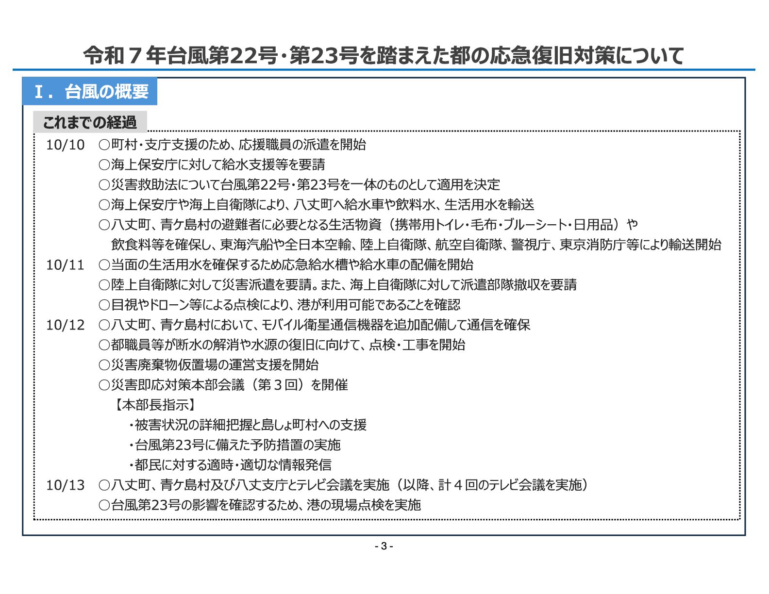 局 令和7年台風第22号・第23号を踏まえた都の応急復旧対策について Ⅰ.台風の概要 10/10 ◦町村・支庁支援のため、応援職員の派遣を開始 ◦海上保安庁に対して給水支援等を要請 ◦災害救助法について台風第22号・第23号を一体のものとして適用を決定 ◦海上保安庁や海上自衛隊により、八丈町へ給水車や飲料水、生活用水を輸送 ◦八丈町、青ケ島村の避難者に必要となる生活物資(携帯用トイレ・毛布・ブルーシート・日用品)や 飲食料等を確保し、東海汽船や全日本空輸、陸上自衛隊、航空自衛隊、警視庁、東京消防庁等により輸送開始 10/11 ◦当面の生活用水を確保するため応急給水槽や給水車の配備を開始 ◦陸上自衛隊に対して災害派遣を要請。また、海上自衛隊に対して派遣部隊撤収を要請 ◦目視やドローン等による点検により、港が利用可能であることを確認 10/12 ◦八丈町、青ケ島村において、モバイル衛星通信機器を追加配備して通信を確保 ◦都職員等が断水の解消や水源の復旧に向けて、点検・工事を開始 ◦災害廃棄物仮置場の運営支援を開始 ◦災害即応対策本部会議(第3回)を開催 【本部長指示】 ・被害状況の詳細把握と島しょ町村への支援 ・台風第23号に備えた予防措置の実施 ・都民に対する適時・適切な情報発信 10/13 ◦八丈町、青ケ島村及び八丈支庁とテレビ会議を実施(以降、計4回のテレビ会議を実施) ◦台風第23号の影響を確認するため、港の現場点検を実施 これまでの経過