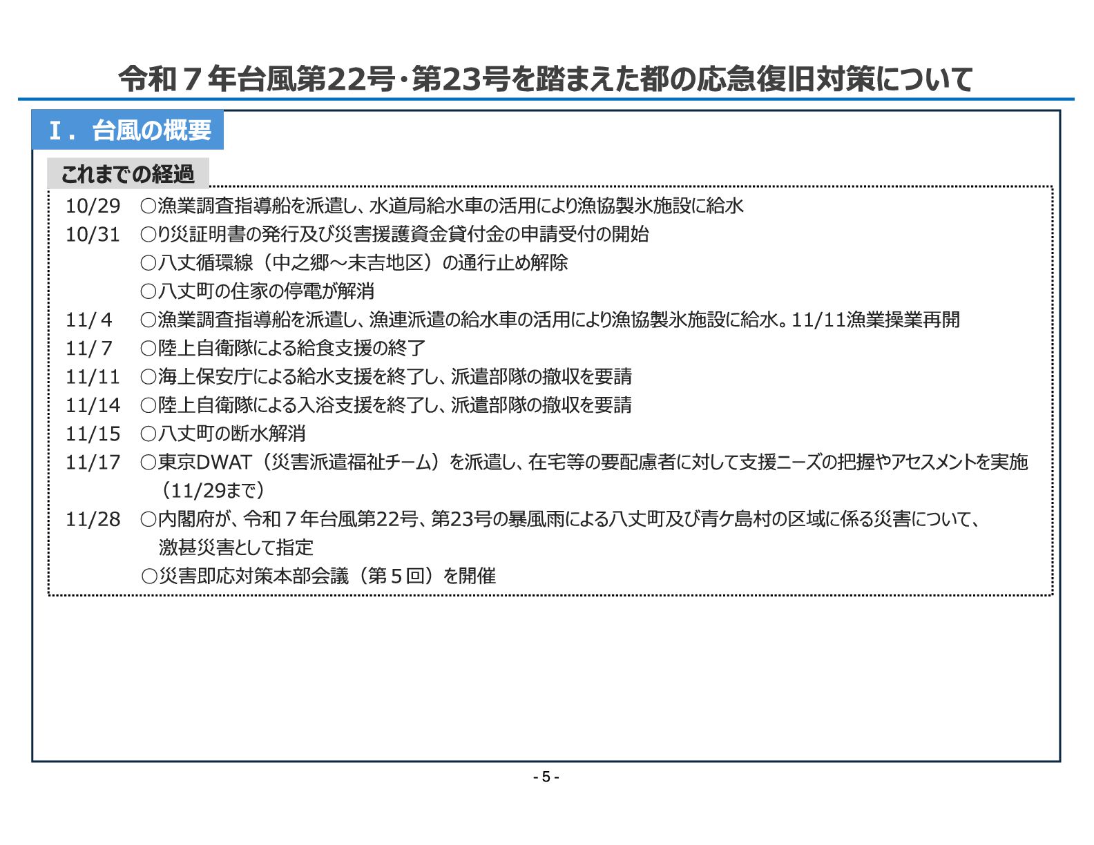 局 令和7年台風第22号・第23号を踏まえた都の応急復旧対策について Ⅰ.台風の概要 10/29 ◦漁業調査指導船を派遣し、水道局給水車の活用により漁協製氷施設に給水 10/31 ◦り災証明書の発行及び災害援護資金貸付金の申請受付の開始 ◦八丈循環線(中之郷〜末吉地区)の通行止め解除 ◦八丈町の住家の停電が解消 11/4 ◦漁業調査指導船を派遣し、漁連派遣の給水車の活用により漁協製氷施設に給水。11/11漁業操業再開 11/7 ◦陸上自衛隊による給食支援の終了 11/11 ◦海上保安庁による給水支援を終了し、派遣部隊の撤収を要請 11/14 ◦陸上自衛隊による入浴支援を終了し、派遣部隊の撤収を要請 11/15 ◦八丈町の断水解消 11/17 ◦東京DWAT(災害派遣福祉チーム)を派遣し、在宅等の要配慮者に対して支援ニーズの把握やアセスメントを実施 (11/29まで) 11/28 ◦内閣府が、令和7年台風第22号、第23号の暴風雨による八丈町及び青ケ島村の区域に係る災害について、 激甚災害として指定 ◦災害即応対策本部会議(第5回)を開催 これまでの経過