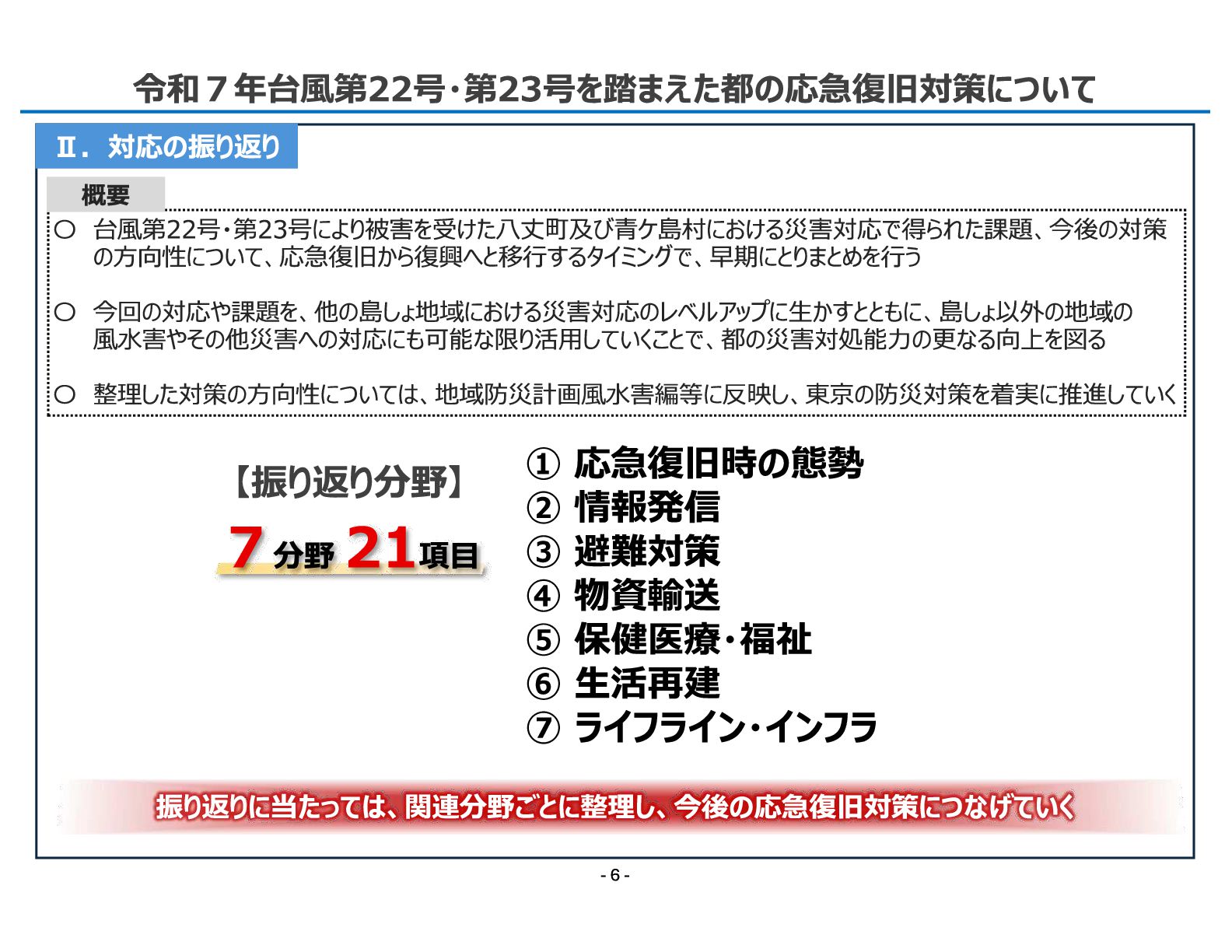 12. 令和7年11月12日 総 務 局 令和7年台風第22号・第23号を踏まえた都の応急復旧対策について 振り返りに当たっては、関連分野ごとに整理し、今後の応急復旧対策につなげていく Ⅱ.対応の振り返り - 6 -