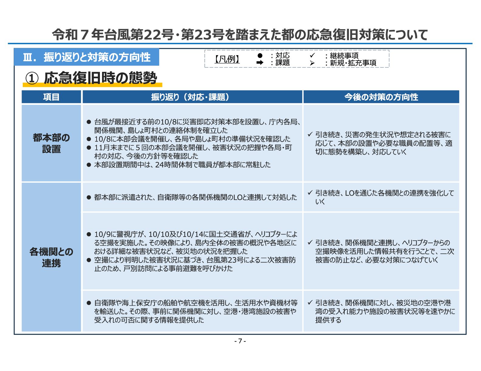 13. 令和7年11月12日 総 務 局 令和7年台風第22号・第23号を踏まえた都の応急復旧対策について - 7 - Ⅲ.振り返りと対策の方向性 項目