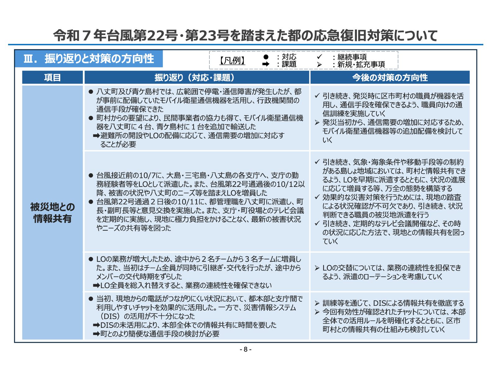 振り返り(対応・課題) 今後の対策の方向性 被災地との 情報共有 ⚫ 八丈町及び青ケ島村では、広範囲で停電・通信障害が発生したが、都 が事前に配備していたモバイル衛星通信機器を活用し、行政機関間の 通信手段が確保できた ⚫ 町村からの要望により、民間事業者の協力も得て、モバイル衛星通信機 器を八丈町に4台、青ケ島村に1台を追加で輸送した 避難所の開設やLOの配備に応じて、通信需要の増加に対応す ることが必要 ✓ 引き続き、発災時に区市町村の職員が機器を活 用し、通信手段を確保できるよう、職員向けの通 信訓練を実施していく ➢発災当初から、通信需要の増加に対応するため、 モバイル衛星通信機器等の追加配備を検討して いく ⚫ 台風接近前の10/7に、大島・三宅島・八丈島の各支庁へ、支庁の勤 務経験者等をLOとして派遣した。また、台風第22号通過後の10/12以 降、被害の状況や八丈町のニーズ等を踏まえLOを増員した ⚫ 台風第22号通過2日後の10/11に、都管理職を八丈町に派遣し、町 長・副町長等と意見交換を実施した。また、支庁・町役場とのテレビ会議 を定期的に実施し、現地に極力負担をかけることなく、最新の被害状況 やニーズの共有等を図った ✓ 引き続き、気象・海象条件や移動手段等の制約 がある島しょ地域においては、町村と情報共有でき るよう、LOを早期に派遣するとともに、状況の進展 に応じて増員する等、万全の態勢を構築する ✓ 効果的な災害対策を行うためには、現地の踏査 による状況確認が不可欠であり、引き続き、状況 判断できる職員の被災地派遣を行う ✓ 引き続き、定期的なテレビ会議開催など、その時 の状況に応じた方法で、現地との情報共有を図っ ていく ⚫ LOの業務が増大したため、途中から2名チームから3名チームに増員し た。また、当初はチーム全員が同時に引継ぎ・交代を行ったが、途中から メンバーの交代時期をずらした LO全員を総入れ替えすると、業務の連続性を確保できない ➢LOの交替については、業務の連続性を担保でき るよう、派遣のローテーションを考慮していく ⚫ 当初、現地からの電話がつながりにくい状況において、都本部と支庁間で 利用しやすいチャットを効果的に活用した。一方で、災害情報システム (DIS)の活用が不十分になった DISの未活用により、本部全体での情報共有に時間を要した 町とのより簡便な通信手段の検討が必要 ➢訓練等を通じて、DISによる情報共有を徹底する ➢今回有効性が確認されたチャットについては、本部 全体での活用ルールを明確化するとともに、区市 町村との情報共有の仕組みも検討していく 【凡例】 ✓ ︓継続事項 ➢ ︓新規・拡充事項 • ︓対応 ︓課題