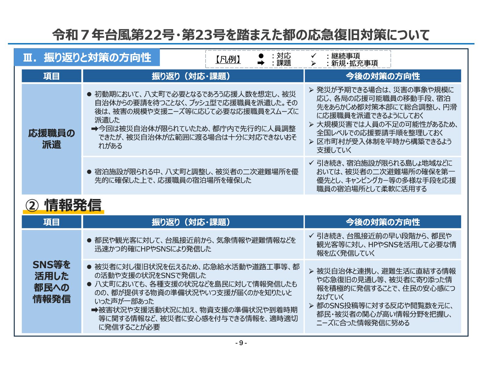 振り返り(対応・課題) 今後の対策の方向性 応援職員の 派遣 ⚫ 初動期において、八丈町で必要となるであろう応援人数を想定し、被災 自治体からの要請を待つことなく、プッシュ型で応援職員を派遣した。その 後は、被害の規模や支援ニーズ等に応じて必要な応援職員をスムーズに 派遣した 今回は被災自治体が限られていたため、都庁内で先行的に人員調整 できたが、被災自治体が広範囲に渡る場合は十分に対応できないおそ れがある ➢発災が予期できる場合は、災害の事象や規模に 応じ、各局の応援可能職員の移動手段、宿泊 先をあらかじめ都対策本部にて総合調整し、円滑 に応援職員を派遣できるようにしておく ➢大規模災害では人員の不足の可能性があるため、 全国レベルでの応援要請手順を整理しておく ➢区市町村が受入体制を平時から構築できるよう 支援していく ⚫ 宿泊施設が限られる中、八丈町と調整し、被災者の二次避難場所を優 先的に確保した上で、応援職員の宿泊場所を確保した ✓ 引き続き、宿泊施設が限られる島しょ地域などに おいては、被災者の二次避難場所の確保を第一 優先とし、キャンピングカー等の多様な手段を応援 職員の宿泊場所として柔軟に活用する ② 情報発信 項目 振り返り(対応・課題) 今後の対策の方向性 SNS等を 活用した 都民への 情報発信 ⚫ 都民や観光客に対して、台風接近前から、気象情報や避難情報などを 迅速かつ的確にHPやSNSにより発信した ✓ 引き続き、台風接近前の早い段階から、都民や 観光客等に対し、HPやSNSを活用して必要な情 報を広く発信していく ⚫ 被災者に対し復旧状況を伝えるため、応急給水活動や道路工事等、都 の活動や支援の状況をSNSで発信した ⚫ 八丈町においても、各種支援の状況などを島民に対して情報発信したも のの、都が提供する物資の準備状況やいつ支援が届くのかを知りたいと いった声が一部あった 被害状況や支援活動状況に加え、物資支援の準備状況や到着時期 等に関する情報など、被災者に安心感を付与できる情報を、適時適切 に発信することが必要 ➢被災自治体と連携し、避難生活に直結する情報 や応急復旧の見通し等、被災者に寄り添った情 報を積極的に発信することで、住民の安心感につ なげていく ➢都のSNS投稿等に対する反応や閲覧数を元に、 都民・被災者の関心が高い情報分野を把握し、 ニーズに合った情報発信に努める 【凡例】 ✓ ︓継続事項 ➢ ︓新規・拡充事項 • ︓対応 ︓課題
