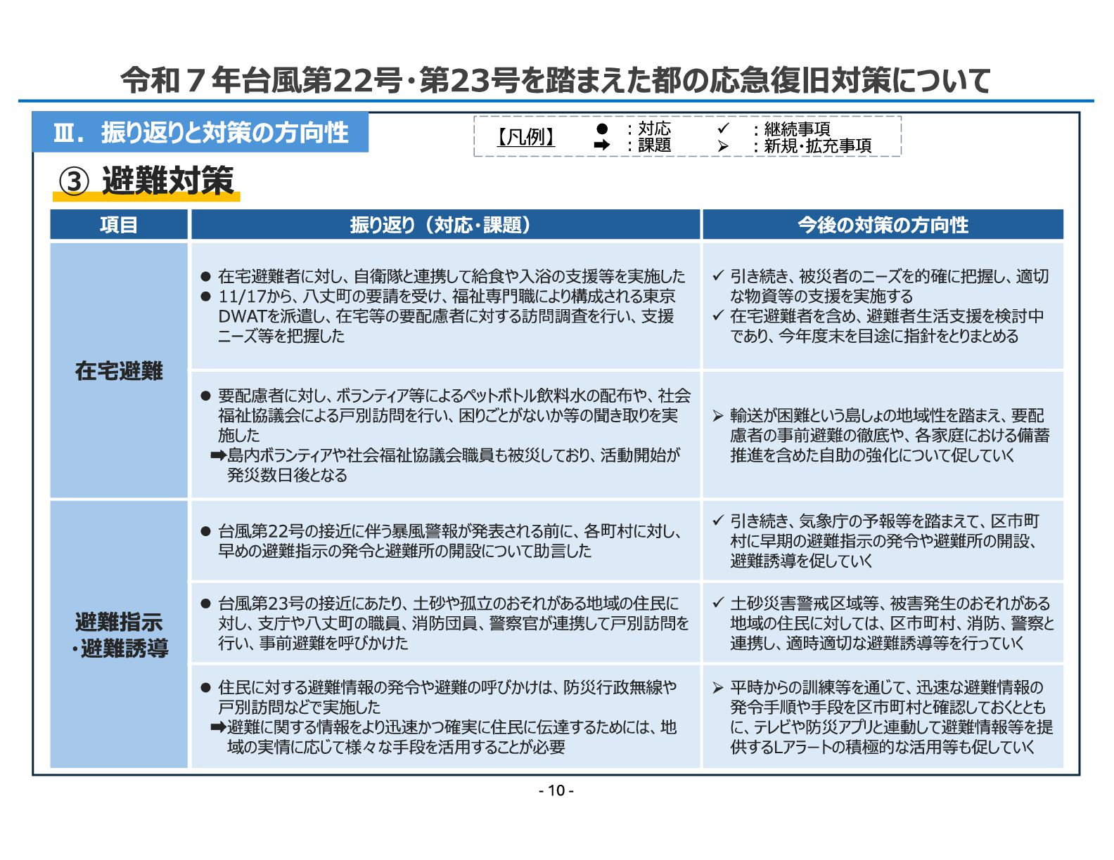 16. 令和7年11月12日 総 務 局 令和7年台風第22号・第23号を踏まえた都の応急復旧対策について - 10 - Ⅲ.振り返りと対策の方向性 項目