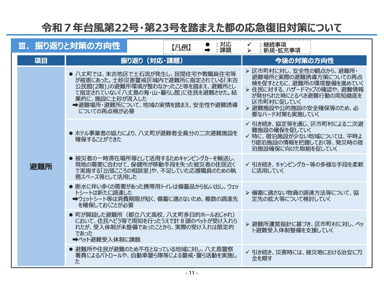 17. 令和7年11月12日 総 務 局 令和7年台風第22号・第23号を踏まえた都の応急復旧対策について - 11 - Ⅲ.振り返りと対策の方向性 項目