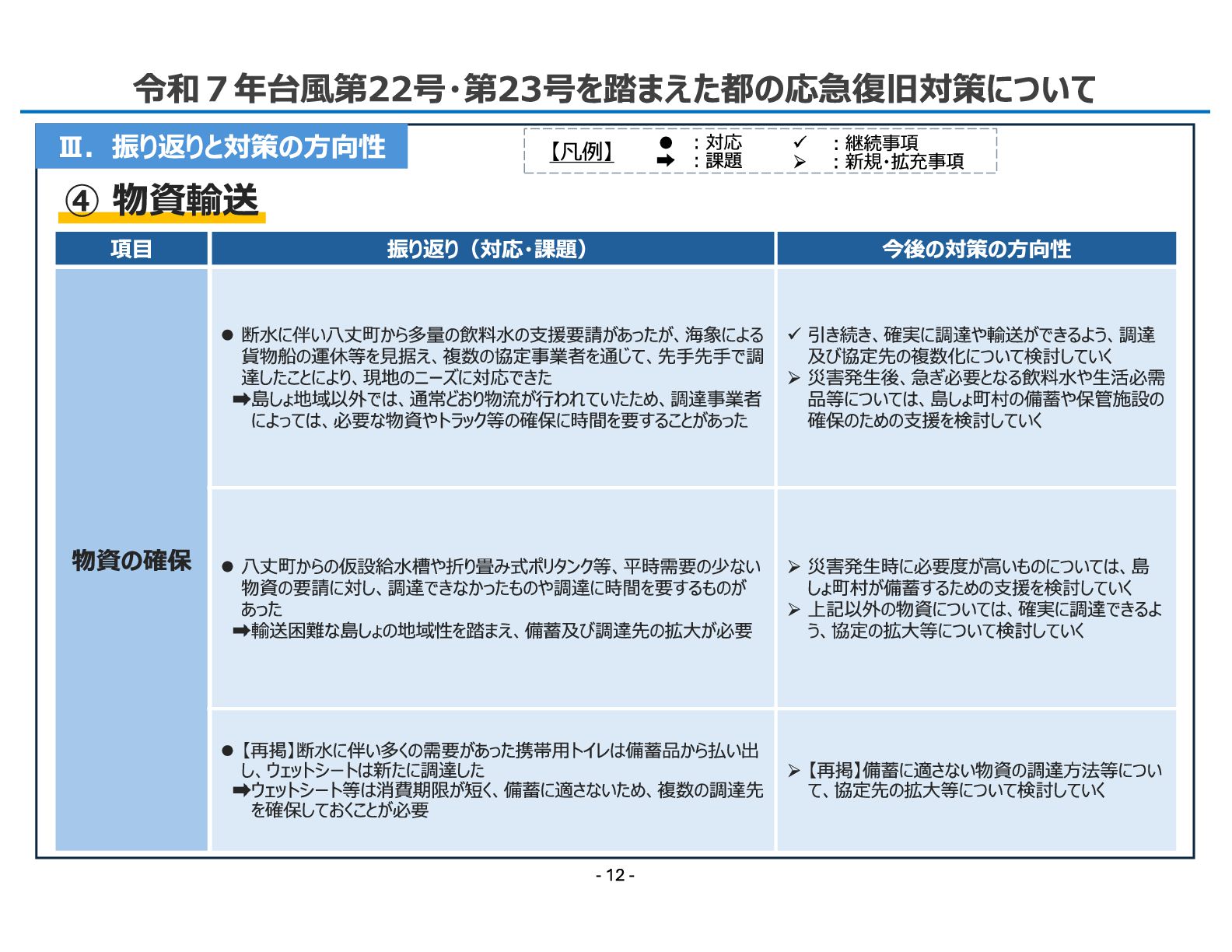Ⅲ.振り返りと対策の方向性 項目 振り返り(対応・課題) 今後の対策の方向性 物資の確保 ⚫ 断水に伴い八丈町から多量の飲料水の支援要請があったが、海象による 貨物船の運休等を見据え、複数の協定事業者を通じて、先手先手で調 達したことにより、現地のニーズに対応できた 島しょ地域以外では、通常どおり物流が行われていたため、調達事業者 によっては、必要な物資やトラック等の確保に時間を要することがあった ✓ 引き続き、確実に調達や輸送ができるよう、調達 及び協定先の複数化について検討していく ➢災害発生後、急ぎ必要となる飲料水や生活必需 品等については、島しょ町村の備蓄や保管施設の 確保のための支援を検討していく ⚫ 八丈町からの仮設給水槽や折り畳み式ポリタンク等、平時需要の少ない 物資の要請に対し、調達できなかったものや調達に時間を要するものが あった 輸送困難な島しょの地域性を踏まえ、備蓄及び調達先の拡大が必要 ➢災害発生時に必要度が高いものについては、島 しょ町村が備蓄するための支援を検討していく ➢上記以外の物資については、確実に調達できるよ う、協定の拡大等について検討していく ⚫ 【再掲】断水に伴い多くの需要があった携帯用トイレは備蓄品から払い出 し、ウェットシートは新たに調達した ウェットシート等は消費期限が短く、備蓄に適さないため、複数の調達先 を確保しておくことが必要 ➢【再掲】備蓄に適さない物資の調達方法等につい て、協定先の拡大等について検討していく 【凡例】 ✓ ︓継続事項 ➢ ︓新規・拡充事項 • ︓対応 ︓課題