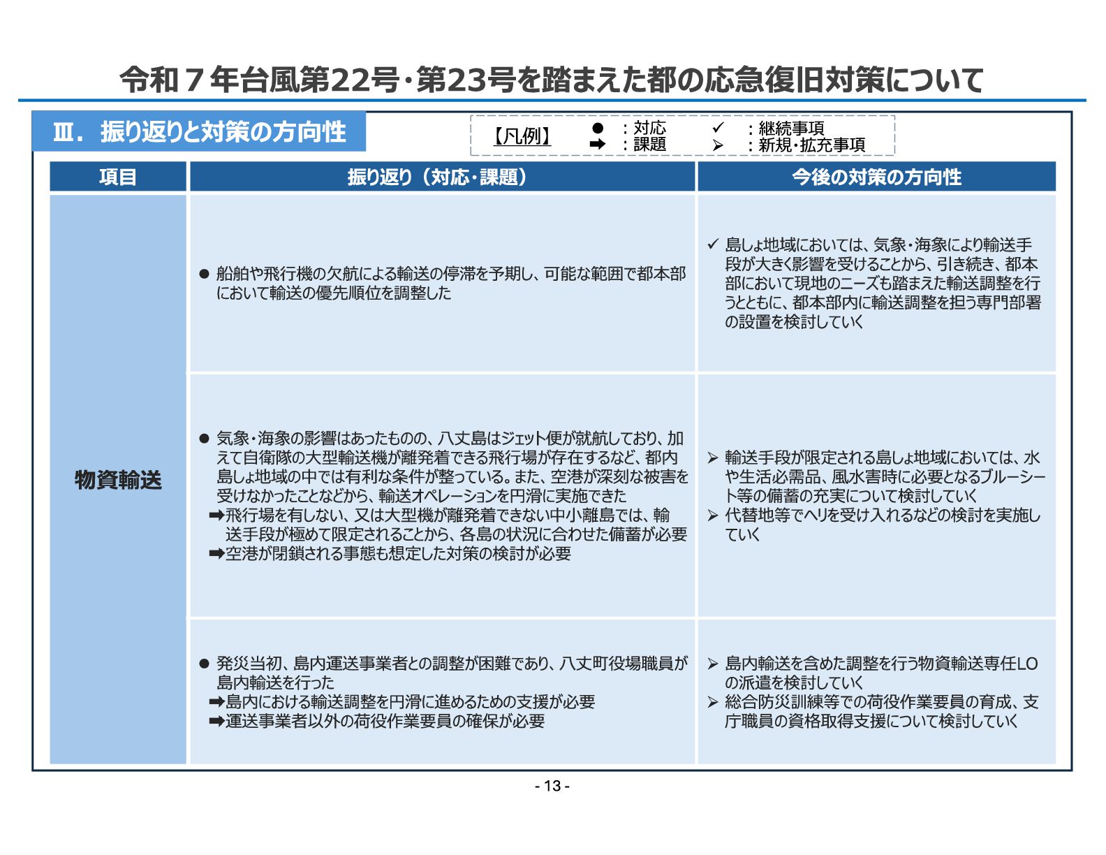 19. 令和7年11月12日 総 務 局 令和7年台風第22号・第23号を踏まえた都の応急復旧対策について - 13 - Ⅲ.振り返りと対策の方向性 項目