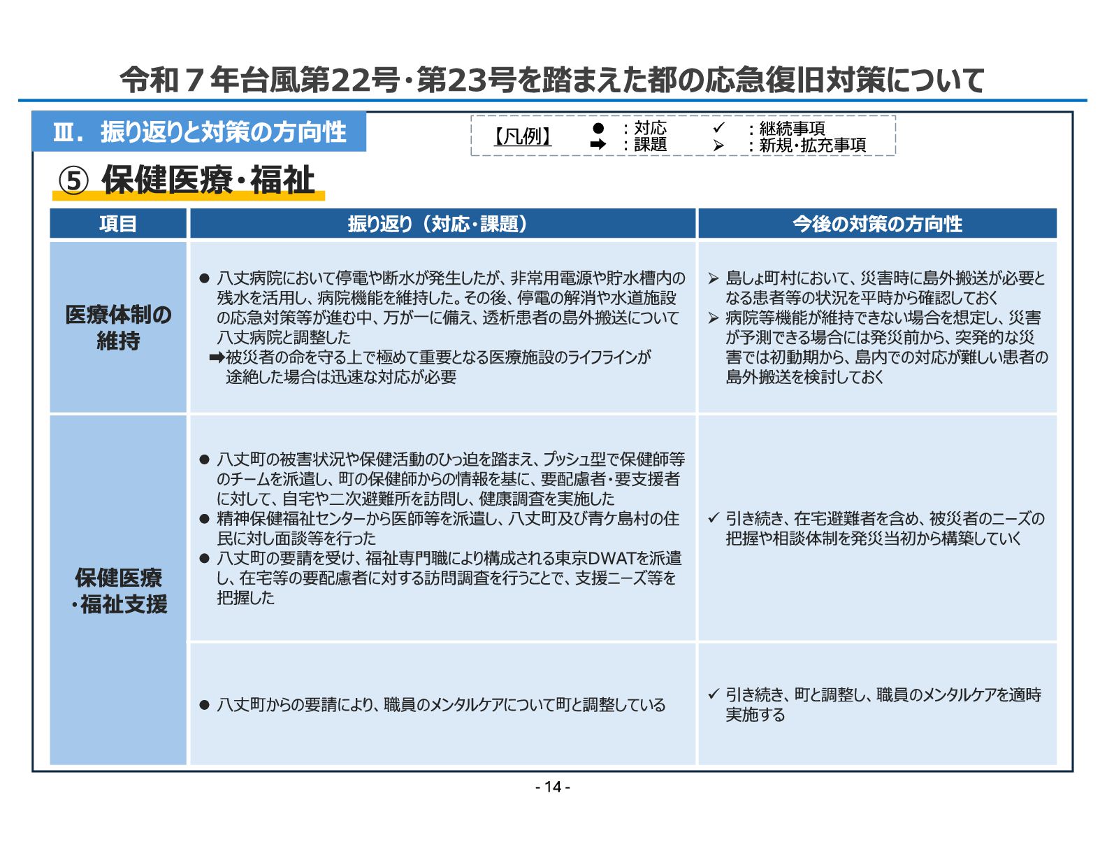 振り返り(対応・課題) 今後の対策の方向性 医療体制の 維持 ⚫ 八丈病院において停電や断水が発生したが、非常用電源や貯水槽内の 残水を活用し、病院機能を維持した。その後、停電の解消や水道施設 の応急対策等が進む中、万が一に備え、透析患者の島外搬送について 八丈病院と調整した 被災者の命を守る上で極めて重要となる医療施設のライフラインが 途絶した場合は迅速な対応が必要 ➢島しょ町村において、災害時に島外搬送が必要と なる患者等の状況を平時から確認しておく ➢病院等機能が維持できない場合を想定し、災害 が予測できる場合には発災前から、突発的な災 害では初動期から、島内での対応が難しい患者の 島外搬送を検討しておく 保健医療 ・福祉支援 ⚫ 八丈町の被害状況や保健活動のひっ迫を踏まえ、プッシュ型で保健師等 のチームを派遣し、町の保健師からの情報を基に、要配慮者・要支援者 に対して、自宅や二次避難所を訪問し、健康調査を実施した ⚫ 精神保健福祉センターから医師等を派遣し、八丈町及び青ケ島村の住 民に対し面談等を行った ⚫ 八丈町の要請を受け、福祉専門職により構成される東京DWATを派遣 し、在宅等の要配慮者に対する訪問調査を行うことで、支援ニーズ等を 把握した ✓ 引き続き、在宅避難者を含め、被災者のニーズの 把握や相談体制を発災当初から構築していく ⚫ 八丈町からの要請により、職員のメンタルケアについて町と調整している ✓ 引き続き、町と調整し、職員のメンタルケアを適時 実施する ⑤ 保健医療・福祉 【凡例】 ✓ ︓継続事項 ➢ ︓新規・拡充事項 • ︓対応 ︓課題