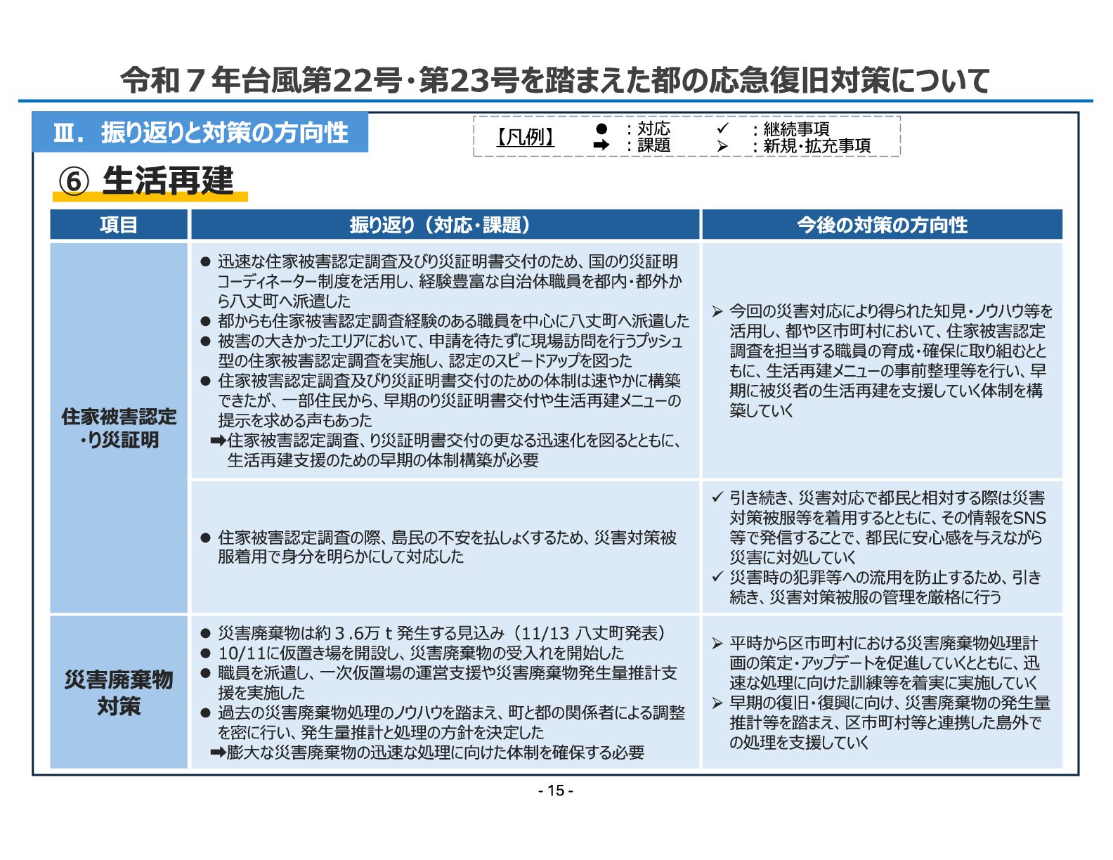 振り返り(対応・課題) 今後の対策の方向性 住家被害認定 ・り災証明 ⚫ 迅速な住家被害認定調査及びり災証明書交付のため、国のり災証明 コーディネーター制度を活用し、経験豊富な自治体職員を都内・都外か ら八丈町へ派遣した ⚫ 都からも住家被害認定調査経験のある職員を中心に八丈町へ派遣した ⚫ 被害の大きかったエリアにおいて、申請を待たずに現場訪問を行うプッシュ 型の住家被害認定調査を実施し、認定のスピードアップを図った ⚫ 住家被害認定調査及びり災証明書交付のための体制は速やかに構築 できたが、一部住民から、早期のり災証明書交付や生活再建メニューの 提示を求める声もあった 住家被害認定調査、り災証明書交付の更なる迅速化を図るとともに、 生活再建支援のための早期の体制構築が必要 ➢今回の災害対応により得られた知見・ノウハウ等を 活用し、都や区市町村において、住家被害認定 調査を担当する職員の育成・確保に取り組むとと もに、生活再建メニューの事前整理等を行い、早 期に被災者の生活再建を支援していく体制を構 築していく ⚫ 住家被害認定調査の際、島民の不安を払しょくするため、災害対策被 服着用で身分を明らかにして対応した ✓ 引き続き、災害対応で都民と相対する際は災害 対策被服等を着用するとともに、その情報をSNS 等で発信することで、都民に安心感を与えながら 災害に対処していく ✓ 災害時の犯罪等への流用を防止するため、引き 続き、災害対策被服の管理を厳格に行う 災害廃棄物 対策 ⚫ 災害廃棄物は約3.6万t発生する見込み(11/13 八丈町発表) ⚫ 10/11に仮置き場を開設し、災害廃棄物の受入れを開始した ⚫ 職員を派遣し、一次仮置場の運営支援や災害廃棄物発生量推計支 援を実施した ⚫ 過去の災害廃棄物処理のノウハウを踏まえ、町と都の関係者による調整 を密に行い、発生量推計と処理の方針を決定した 膨大な災害廃棄物の迅速な処理に向けた体制を確保する必要 ➢平時から区市町村における災害廃棄物処理計 画の策定・アップデートを促進していくとともに、迅 速な処理に向けた訓練等を着実に実施していく ➢早期の復旧・復興に向け、災害廃棄物の発生量 推計等を踏まえ、区市町村等と連携した島外で の処理を支援していく ⑥ 生活再建 【凡例】 ✓ ︓継続事項 ➢ ︓新規・拡充事項 • ︓対応 ︓課題