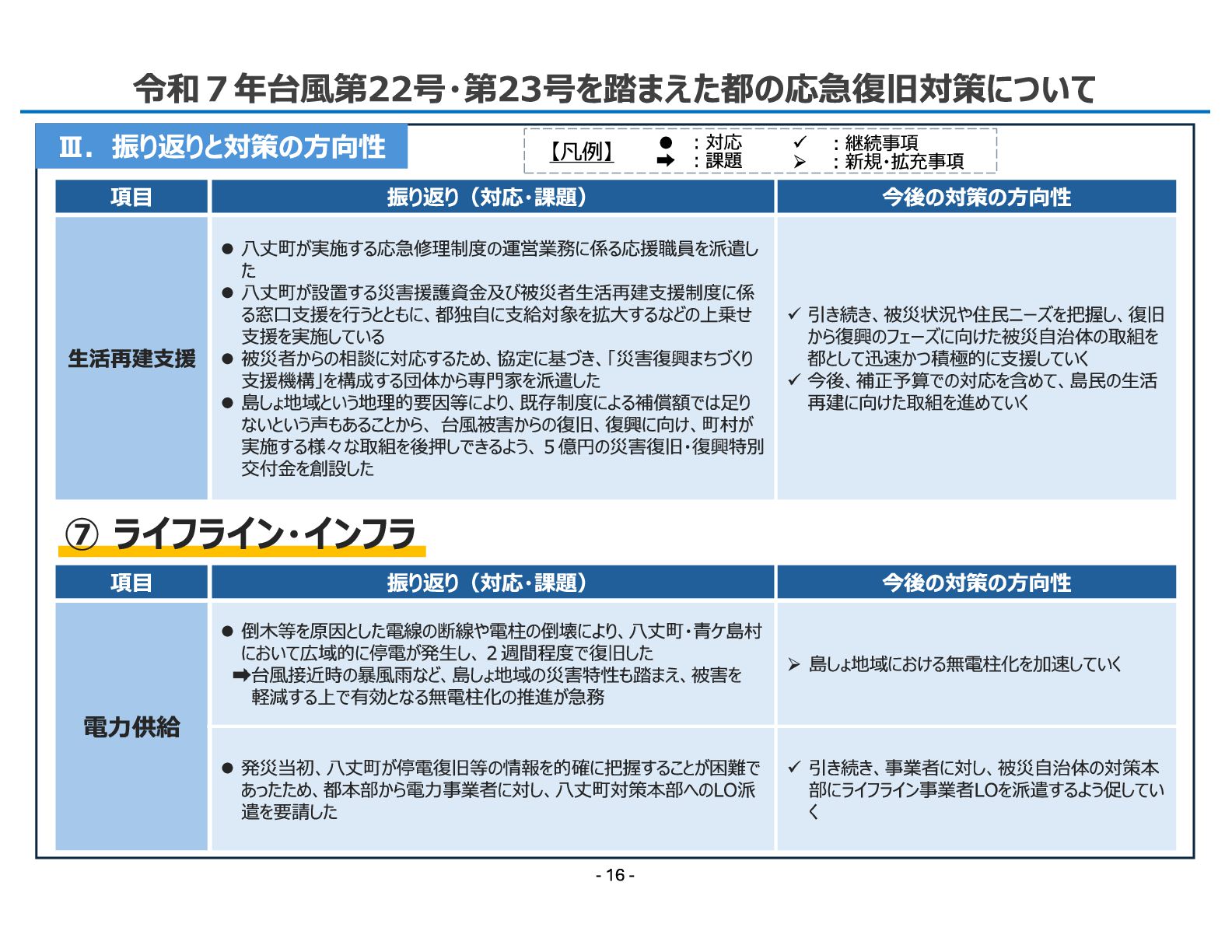 振り返り(対応・課題) 今後の対策の方向性 生活再建支援 ⚫ 八丈町が実施する応急修理制度の運営業務に係る応援職員を派遣し た ⚫ 八丈町が設置する災害援護資金及び被災者生活再建支援制度に係 る窓口支援を行うとともに、都独自に支給対象を拡大するなどの上乗せ 支援を実施している ⚫ 被災者からの相談に対応するため、協定に基づき、「災害復興まちづくり 支援機構」を構成する団体から専門家を派遣した ⚫ 島しょ地域という地理的要因等により、既存制度による補償額では足り ないという声もあることから、 台風被害からの復旧、復興に向け、町村が 実施する様々な取組を後押しできるよう、5億円の災害復旧・復興特別 交付金を創設した ✓ 引き続き、被災状況や住民ニーズを把握し、復旧 から復興のフェーズに向けた被災自治体の取組を 都として迅速かつ積極的に支援していく ✓ 今後、補正予算での対応を含めて、島民の生活 再建に向けた取組を進めていく ⑦ ライフライン・インフラ 項目 振り返り(対応・課題) 今後の対策の方向性 電力供給 ⚫ 倒木等を原因とした電線の断線や電柱の倒壊により、八丈町・青ケ島村 において広域的に停電が発生し、2週間程度で復旧した 台風接近時の暴風雨など、島しょ地域の災害特性も踏まえ、被害を 軽減する上で有効となる無電柱化の推進が急務 ➢ 島しょ地域における無電柱化を加速していく ⚫ 発災当初、八丈町が停電復旧等の情報を的確に把握することが困難で あったため、都本部から電力事業者に対し、八丈町対策本部へのLO派 遣を要請した ✓ 引き続き、事業者に対し、被災自治体の対策本 部にライフライン事業者LOを派遣するよう促してい く 【凡例】 ✓ ︓継続事項 ➢ ︓新規・拡充事項 • ︓対応 ︓課題