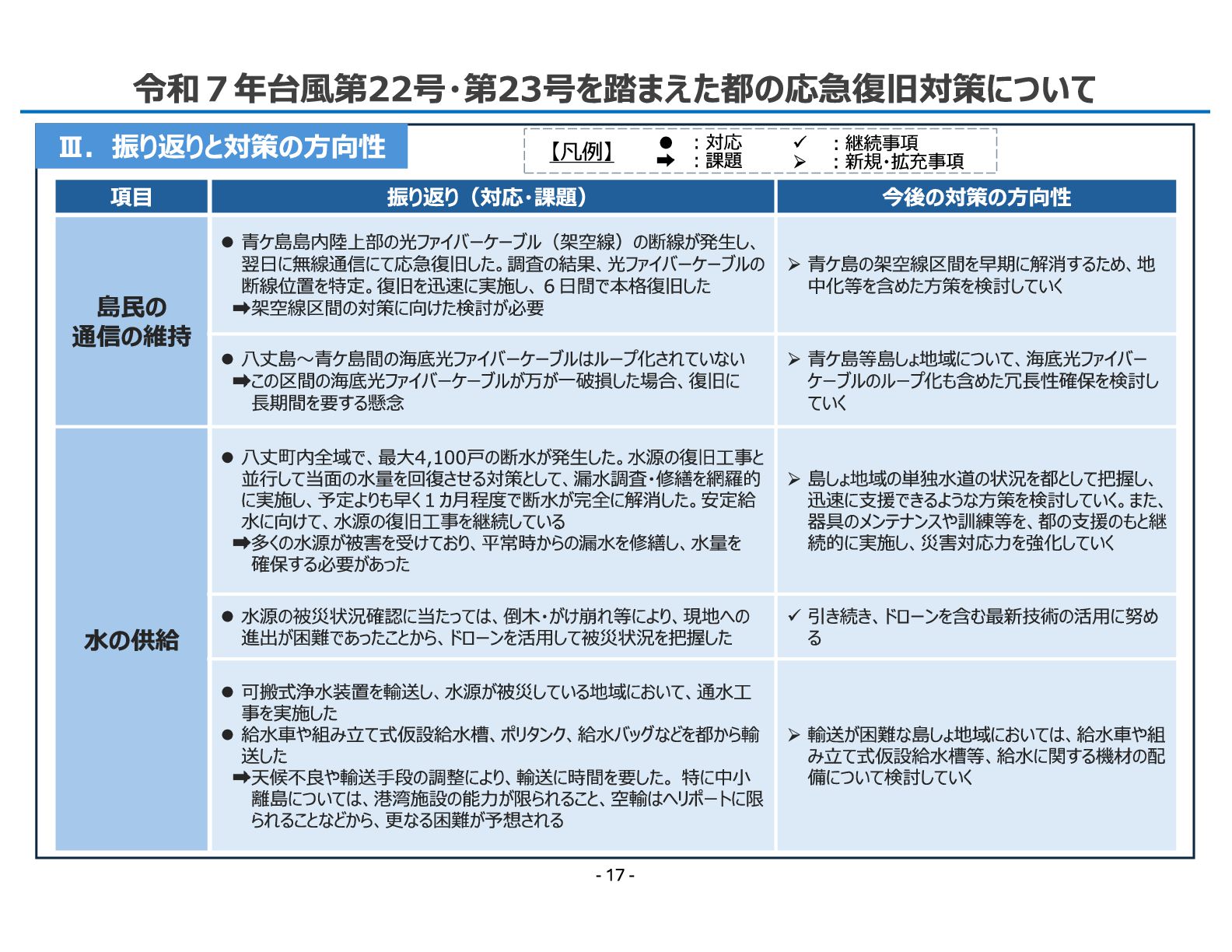 振り返り(対応・課題) 今後の対策の方向性 島民の 通信の維持 ⚫ 青ケ島島内陸上部の光ファイバーケーブル(架空線)の断線が発生し、 翌日に無線通信にて応急復旧した。調査の結果、光ファイバーケーブルの 断線位置を特定。復旧を迅速に実施し、6日間で本格復旧した 架空線区間の対策に向けた検討が必要 ➢青ケ島の架空線区間を早期に解消するため、地 中化等を含めた方策を検討していく ⚫ 八丈島〜青ケ島間の海底光ファイバーケーブルはループ化されていない この区間の海底光ファイバーケーブルが万が一破損した場合、復旧に 長期間を要する懸念 ➢青ケ島等島しょ地域について、海底光ファイバー ケーブルのループ化も含めた冗長性確保を検討し ていく 水の供給 ⚫ 八丈町内全域で、最大4,100戸の断水が発生した。水源の復旧工事と 並行して当面の水量を回復させる対策として、漏水調査・修繕を網羅的 に実施し、予定よりも早く1カ月程度で断水が完全に解消した。安定給 水に向けて、水源の復旧工事を継続している 多くの水源が被害を受けており、平常時からの漏水を修繕し、水量を 確保する必要があった ➢島しょ地域の単独水道の状況を都として把握し、 迅速に支援できるような方策を検討していく。また、 器具のメンテナンスや訓練等を、都の支援のもと継 続的に実施し、災害対応力を強化していく ⚫ 水源の被災状況確認に当たっては、倒木・がけ崩れ等により、現地への 進出が困難であったことから、ドローンを活用して被災状況を把握した ✓ 引き続き、ドローンを含む最新技術の活用に努め る ⚫ 可搬式浄水装置を輸送し、水源が被災している地域において、通水工 事を実施した ⚫ 給水車や組み立て式仮設給水槽、ポリタンク、給水バッグなどを都から輸 送した 天候不良や輸送手段の調整により、輸送に時間を要した。 特に中小 離島については、港湾施設の能力が限られること、空輸はヘリポートに限 られることなどから、更なる困難が予想される ➢輸送が困難な島しょ地域においては、給水車や組 み立て式仮設給水槽等、給水に関する機材の配 備について検討していく 【凡例】 ✓ ︓継続事項 ➢ ︓新規・拡充事項 • ︓対応 ︓課題