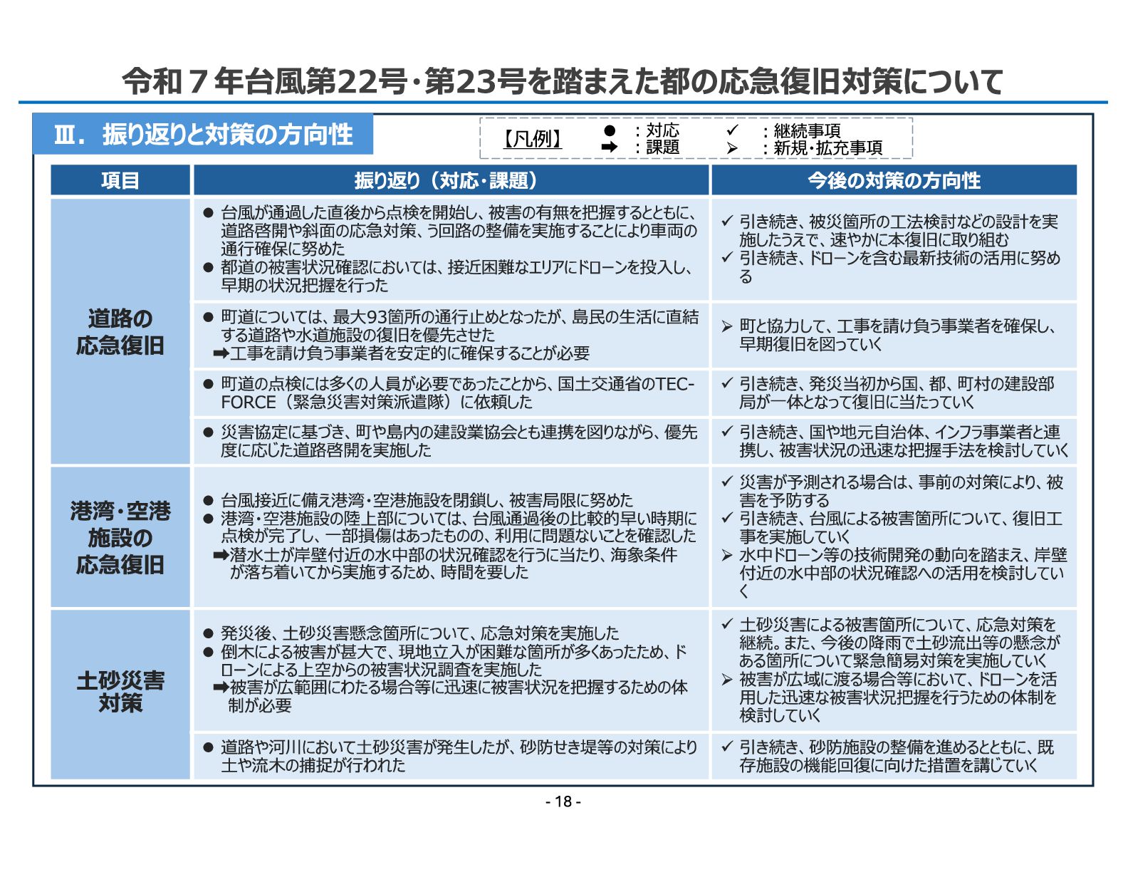 振り返り(対応・課題) 今後の対策の方向性 道路の 応急復旧 ⚫ 台風が通過した直後から点検を開始し、被害の有無を把握するとともに、 道路啓開や斜面の応急対策、う回路の整備を実施することにより車両の 通行確保に努めた ⚫ 都道の被害状況確認においては、接近困難なエリアにドローンを投入し、 早期の状況把握を行った ✓ 引き続き、被災箇所の工法検討などの設計を実 施したうえで、速やかに本復旧に取り組む ✓ 引き続き、ドローンを含む最新技術の活用に努め る ⚫ 町道については、最大93箇所の通行止めとなったが、島民の生活に直結 する道路や水道施設の復旧を優先させた 工事を請け負う事業者を安定的に確保することが必要 ➢町と協力して、工事を請け負う事業者を確保し、 早期復旧を図っていく ⚫ 町道の点検には多くの人員が必要であったことから、国土交通省のTEC- FORCE(緊急災害対策派遣隊)に依頼した ✓ 引き続き、発災当初から国、都、町村の建設部 局が一体となって復旧に当たっていく ⚫ 災害協定に基づき、町や島内の建設業協会とも連携を図りながら、優先 度に応じた道路啓開を実施した ✓ 引き続き、国や地元自治体、インフラ事業者と連 携し、被害状況の迅速な把握手法を検討していく 港湾・空港 施設の 応急復旧 ⚫ 台風接近に備え港湾・空港施設を閉鎖し、被害局限に努めた ⚫ 港湾・空港施設の陸上部については、台風通過後の比較的早い時期に 点検が完了し、一部損傷はあったものの、利用に問題ないことを確認した 潜水士が岸壁付近の水中部の状況確認を行うに当たり、海象条件 が落ち着いてから実施するため、時間を要した ✓ 災害が予測される場合は、事前の対策により、被 害を予防する ✓ 引き続き、台風による被害箇所について、復旧工 事を実施していく ➢水中ドローン等の技術開発の動向を踏まえ、岸壁 付近の水中部の状況確認への活用を検討してい く 土砂災害 対策 ⚫ 発災後、土砂災害懸念箇所について、応急対策を実施した ⚫ 倒木による被害が甚大で、現地立入が困難な箇所が多くあったため、ド ローンによる上空からの被害状況調査を実施した 被害が広範囲にわたる場合等に迅速に被害状況を把握するための体 制が必要 ✓ 土砂災害による被害箇所について、応急対策を 継続。また、今後の降雨で土砂流出等の懸念が ある箇所について緊急簡易対策を実施していく ➢被害が広域に渡る場合等において、ドローンを活 用した迅速な被害状況把握を行うための体制を 検討していく ⚫ 道路や河川において土砂災害が発生したが、砂防せき堤等の対策により 土や流木の捕捉が行われた ✓ 引き続き、砂防施設の整備を進めるとともに、既 存施設の機能回復に向けた措置を講じていく 【凡例】 ✓ ︓継続事項 ➢ ︓新規・拡充事項 • ︓対応 ︓課題