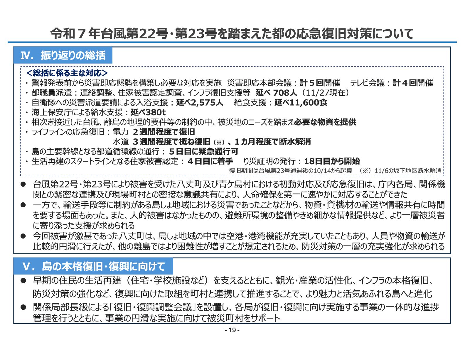 管理を行うとともに、事業の円滑な実施に向けて被災町村をサポート ⚫ 台風第22号・第23号により被害を受けた八丈町及び青ケ島村における初動対応及び応急復旧は、庁内各局、関係機 関との緊密な連携及び現場町村との密接な意識共有により、人命確保を第一に速やかに対応することができた ⚫ 一方で、輸送手段等に制約がある島しょ地域における災害であったことなどから、物資・資機材の輸送や情報共有に時間 を要する場面もあった。また、人的被害はなかったものの、避難所環境の整備やきめ細かな情報提供など、より一層被災者 に寄り添った支援が求められる ⚫ 今回被害が激甚であった八丈町は、島しょ地域の中では空港・港湾機能が充実していたこともあり、人員や物資の輸送が 比較的円滑に行えたが、他の離島ではより困難性が増すことが想定されるため、防災対策の一層の充実強化が求められる <総括に係る主な対応> ・ 警報発表前から災害即応態勢を構築し必要な対応を実施 災害即応本部会議︓計5回開催 テレビ会議︓計4回開催 ・ 都職員派遣︓連絡調整、住家被害認定調査、インフラ復旧支援等 延べ 708人(11/27現在) ・ 自衛隊への災害派遣要請による入浴支援︓延べ2,575人 給食支援︓延べ11,600食 ・ 海上保安庁による給水支援︓延べ380t ・ 相次ぎ接近した台風、離島の地理的要件等の制約の中、被災地のニーズを踏まえ必要な物資を提供 ・ ライフラインの応急復旧︓電力 2週間程度で復旧 水道 3週間程度で概ね復旧(※)、1カ月程度で断水解消 ・ 島の主要幹線となる都道循環線の通行︓5日目に緊急通行可 ・ 生活再建のスタートラインとなる住家被害認定︓4日目に着手 り災証明の発行︓18日目から開始 - 19 - 復旧期間は台風第23号通過後の10/14から起算 (※)11/6の坂下地区断水解消 Ⅳ.振り返りの総括 Ⅴ.島の本格復旧・復興に向けて