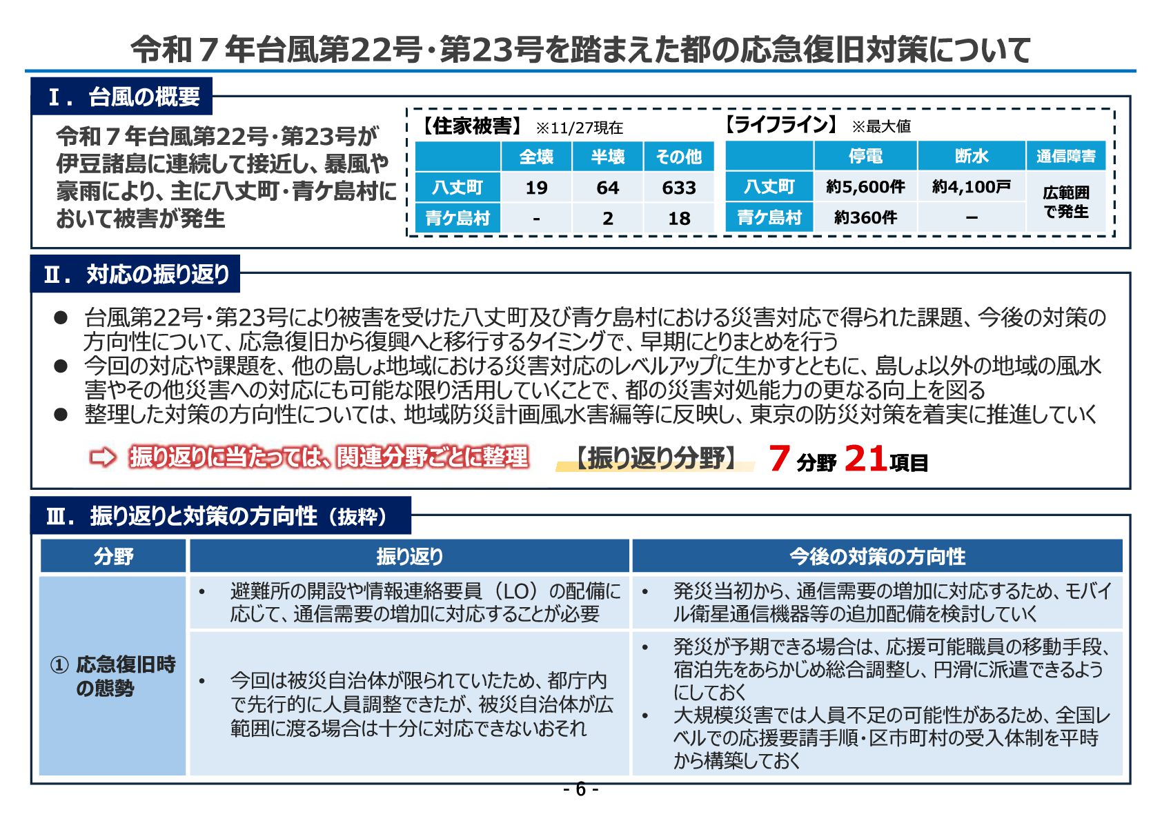 いて、応急復旧から復興へと移行するタイミングで、早期にとりまとめを行う 今回の対応や課題を、他の島しょ地域における災害対応のレベルアップに生かすとともに、島しょ以外の地域の風水 害やその他災害への対応にも可能な限り活用していくことで、都の災害対処能力の更なる向上を図る 整理した対策の方向性につ いては、地域防災計画風水害編等に反映し、東京の防災対策を着実に推進していく 7 分野 2 1 項目 7 分野 2 1 項目 振り返りに当たっては、関連分野ごとに整理 Ⅲ. 振り返りと対策の方向性( 抜粋) 今後の対策の方向性 振り返り 分野 • 発災当初から、通信需要の増加に対応するため、モバイ ル衛星通信機器等の追加配備を検討していく • 避難所の開設や情報連絡要員( LO) の配備に 応じて、通信需要の増加に対応することが必要 ① 応急復旧時 の態勢 • 発災が予期できる場合は、応援可能職員の移動手段、 宿泊先をあらかじめ総合調整し、円滑に派遣できるよう にしておく • 大規模災害では人員不足の可能性があるため、全国レ ベルでの応援要請手順・区市町村の受入体制を平時 から構築しておく • 今回は被災自治体が限られていたため、都庁内 で先行的に人員調整できたが、被災自治体が広 範囲に渡る場合は十分に対応できないおそれ 令和7 年台風第2 2 号・第2 3 号が 伊豆諸島に連続して接近し、暴風や 豪雨により、主に八丈町・青ケ島村に おいて被害が発生 その他 半壊 全壊 6 3 3 6 4 1 9 八丈町 1 8 2 - 青ケ島村 【住家被害】 ※11/27現在 通信障害 断水 停電 広範囲 で発生 約4 ,1 0 0 戸 約5 ,6 0 0 件 八丈町 ー 約3 6 0 件 青ケ島村 Ⅰ. 台風の概要 【ライフライン】 ※最大値 【振り返り分野】 - 6 -