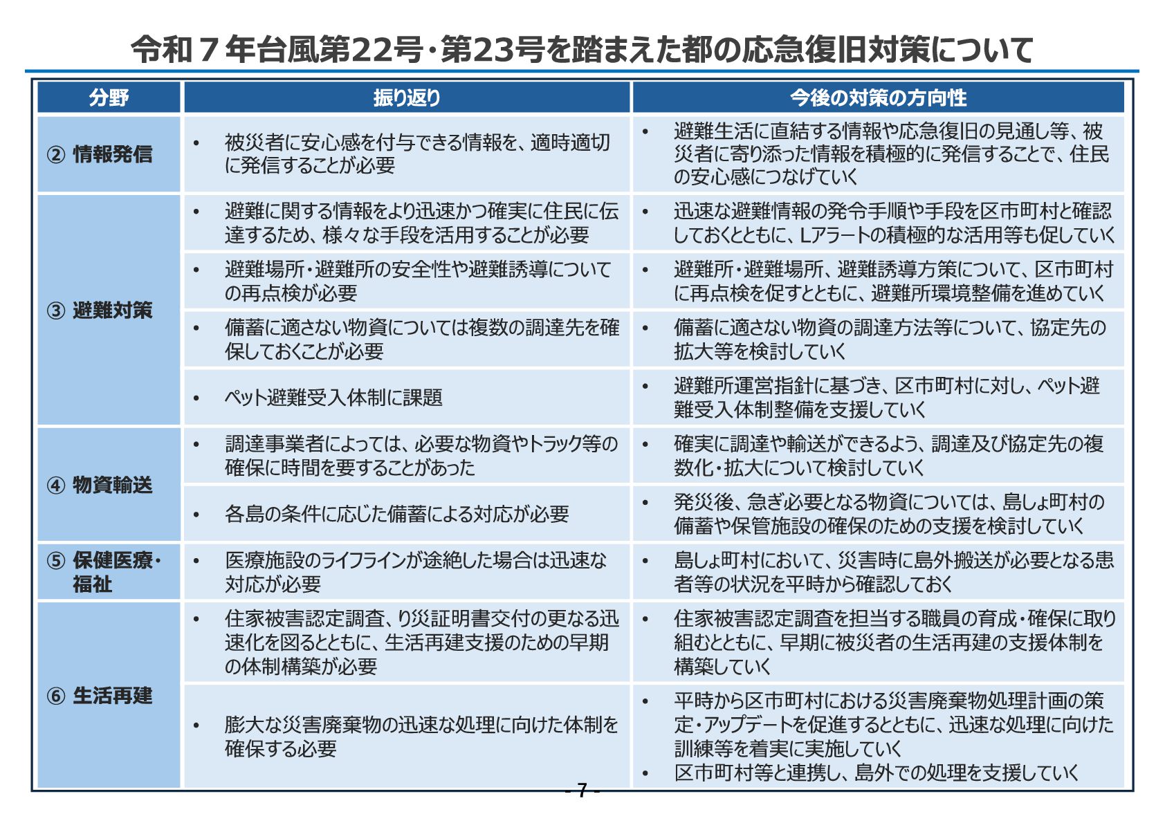 被災者に安心感を付与できる情報を、適時適切 に発信することが必要 ➁ 情報発信 • 迅速な避難情報の発令手順や手段を区市町村と確認 しておくとともに、Lアラートの積極的な活用等も促していく • 避難に関する情報をより迅速かつ 確実に住民に伝 達するため、様々な手段を活用することが必要 ➂ 避難対策 • 避難所・避難場所、避難誘導方策について、区市町村 に再点検を促すとともに、避難所環境整備を進めていく • 避難場所・避難所の安全性や避難誘導につ いて の再点検が必要 • 備蓄に適さない物資の調達方法等について、協定先の 拡大等を検討していく • 備蓄に適さない物資につ いては複数の調達先を確 保しておくことが必要 • 避難所運営指針に基づき、区市町村に対し、ペット避 難受入体制整備を支援していく • ペット避難受入体制に課題 • 確実に調達や輸送ができるよう、調達及び協定先の複 数化・拡大につ いて検討していく • 調達事業者によっ ては、必要な物資やトラック等の 確保に時間を要することがあっ た ④ 物資輸送 • 発災後、急ぎ必要となる物資につ いては、島しょ町村の 備蓄や保管施設の確保のための支援を検討していく • 各島の条件に応じた備蓄による対応が必要 • 島しょ町村において、災害時に島外搬送が必要となる患 者等の状況を平時から確認しておく • 医療施設のライフラインが途絶した場合は迅速な 対応が必要 ➄ 保健医療・ 福祉 • 住家被害認定調査を担当する職員の育成・確保に取り 組むとともに、早期に被災者の生活再建の支援体制を 構築していく • 住家被害認定調査、り災証明書交付の更なる迅 速化を図るとともに、生活再建支援のための早期 の体制構築が必要 ⑥ 生活再建 • 平時から区市町村における災害廃棄物処理計画の策 定・アップデートを促進するとともに、迅速な処理に向けた 訓練等を着実に実施していく • 区市町村等と連携し、島外での処理を支援していく • 膨大な災害廃棄物の迅速な処理に向けた体制を 確保する必要 令和7 年台風第2 2 号・第2 3 号を踏まえた都の応急復旧対策について - 7 -