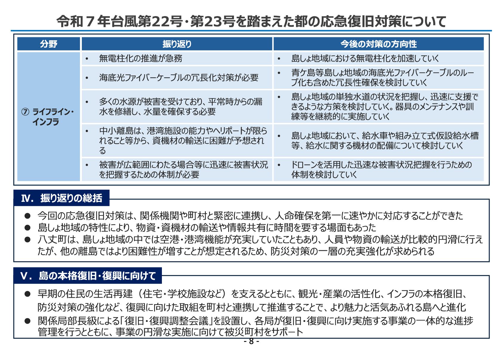 • 島しょ地域における無電柱化を加速していく • 無電柱化の推進が急務 ➆ ライフライン・ インフラ • 青ケ島等島しょ地域の海底光ファイバーケーブルのルー プ化も含めた冗長 性確保を検討していく • 海底光ファイバーケーブルの冗長 化対策が必要 • 島しょ地域の単独水道の状況を把握し、迅速に支援で きるような方策を検討していく。器具のメンテナンスや訓 練等を継続的に実施していく • 多くの水源が被害を受けており、平常時からの漏 水を修繕し、水量を確保する必要 • 島しょ地域において、給水車や組み立て式仮設給水槽 等、給水に関する機材の配備につ いて検討していく • 中小離島は、港湾施設の能力やヘリポートが限ら れること等から、資機材の輸送に困難が予想され る • ドローンを活用した迅速な被害状況把握を行うための 体制を検討していく • 被害が広範囲にわたる場合等に迅速に被害状況 を把握するための体制が必要 Ⅳ. 振り返りの総括 今回の応急復旧対策は、関係機関や町村と緊密に連携し、人命確保を第一に速やかに対応することができた 島しょ地域の特性により、物資・資機材の輸送や情報共有に時間を要する場面もあっ た 八丈町は、島しょ地域の中では空港・港湾機能が充実していたこともあり、人員や物資の輸送が比較的円滑に行え たが、他の離島ではより困難性が増すことが想定されるため、防災対策の一層の充実強化が求められる Ⅴ. 島の本格復旧・復興に向けて 令和7 年台風第2 2 号・第2 3 号を踏まえた都の応急復旧対策について - 8 -