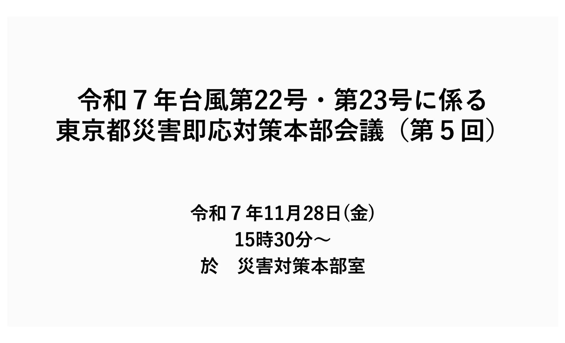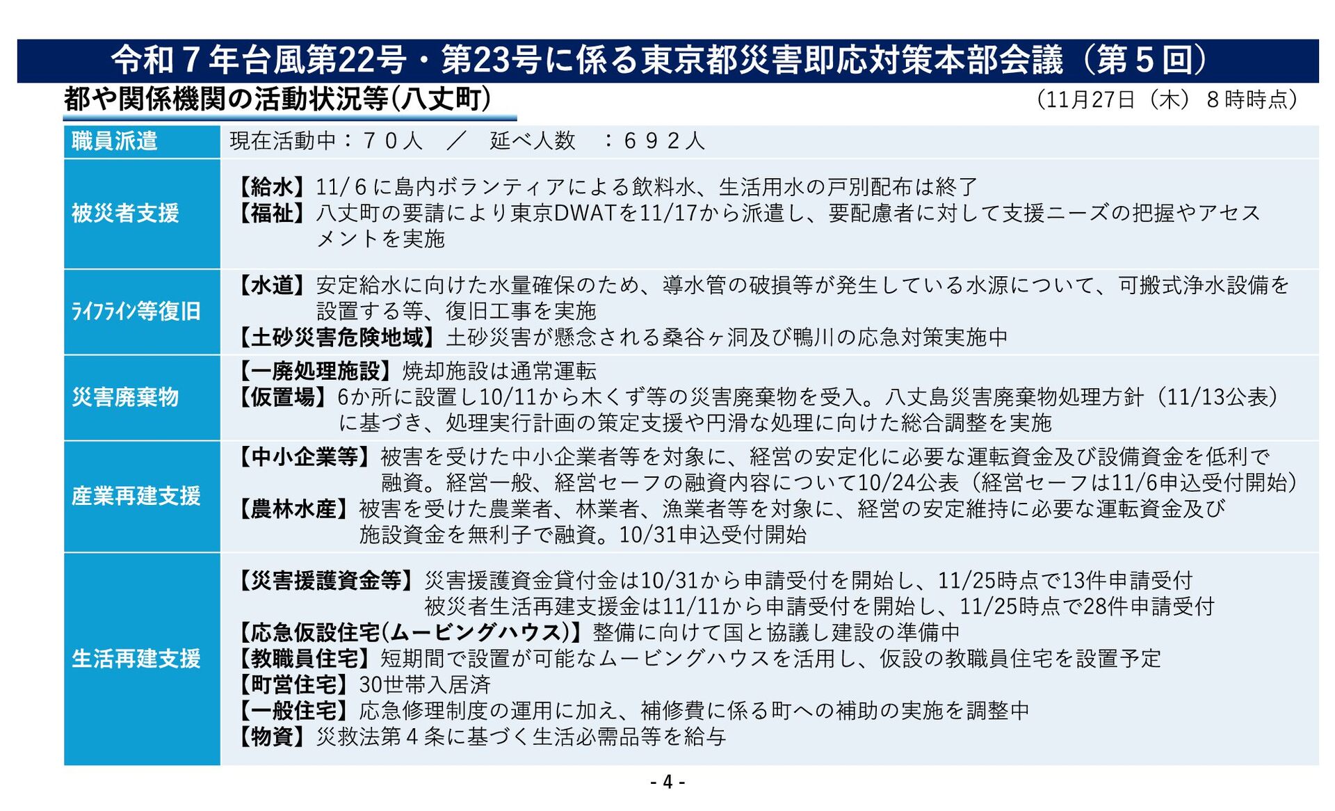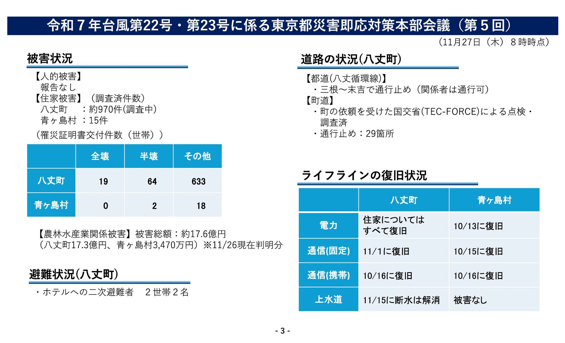 住家については すべて復旧 10/13に復旧 通信(固定) 11/1に復旧 10/15に復旧 通信(携帯) 10/16に復旧 10/16に復旧 上水道 11/15に断水は解消 被害なし 道路の状況(八丈町) ・ホテルへの二次避難者 2世帯2名 【都道(八丈循環線)】 ・三根〜末吉で通行止め(関係者は通行可) 【町道】 ・町の依頼を受けた国交省(TEC-FORCE)による点検・ 調査済 ・通行止め:29箇所 【農林水産業関係被害】被害総額:約17.6億円 (八丈町17.3億円、青ヶ島村3,470万円)※11/26現在判明分 【人的被害】 報告なし 【住家被害】(調査済件数) 八丈町 :約970件(調査中) 青ヶ島村 :15件 (罹災証明書交付件数(世帯)) 全壊 半壊 その他 八丈町 19 64 633 青ヶ島村 0 2 18 令和7年台風第22号・第23号に係る東京都災害即応対策本部会議(第5回) (11月27日(木)8時時点) - 3 -