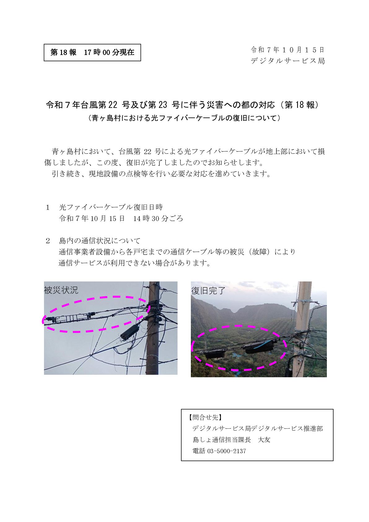 デジタルサービス局 令和7年台風第 22 号及び第 23 号に伴う災害への都の対応(第 18 報) (青ヶ島村における光ファイバーケーブルの復旧について) 青ヶ島村において、台風第 22 号による光ファイバーケーブルが地上部において損 傷しましたが、この度、復旧が完了しましたのでお知らせします。 引き続き、現地設備の点検等を行い必要な対応を進めていきます。 1 光ファイバーケーブル復旧日時 令和7年 10 月 15 日 14 時 30 分ごろ 2 島内の通信状況について 通信事業者設備から各戸宅までの通信ケーブル等の被災(故障)により 通信サービスが利用できない場合があります。 【問合せ先】 デジタルサービス局デジタルサービス推進部 島しょ通信担当課長 大友 電話 03-5000-2137 被災状況 復旧完了 第 18 報 17 時 00 分現在
