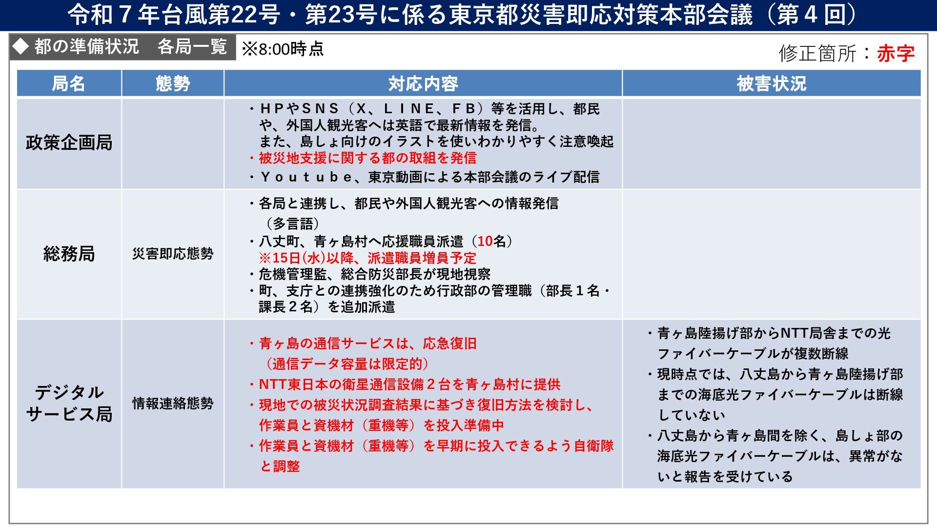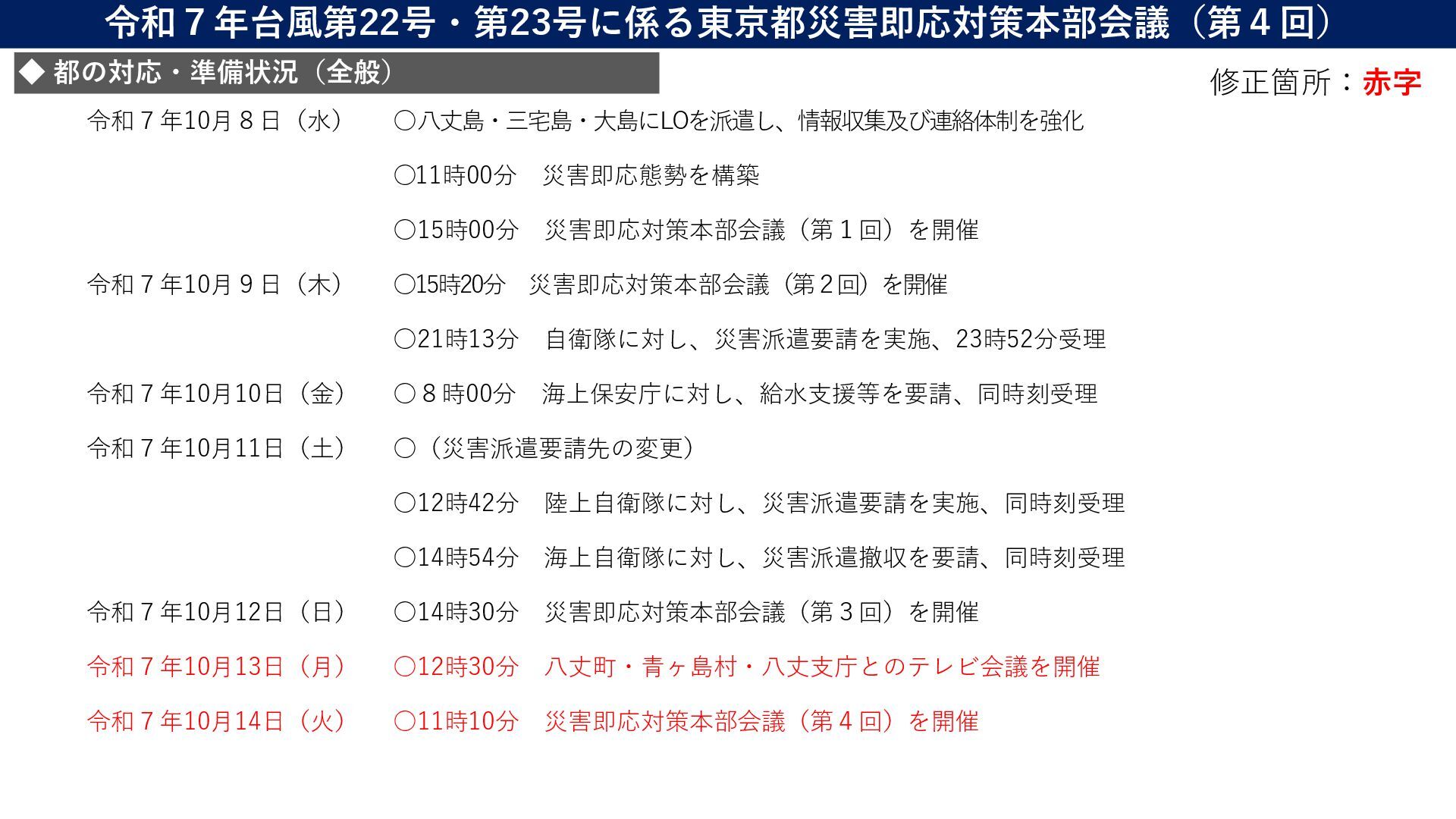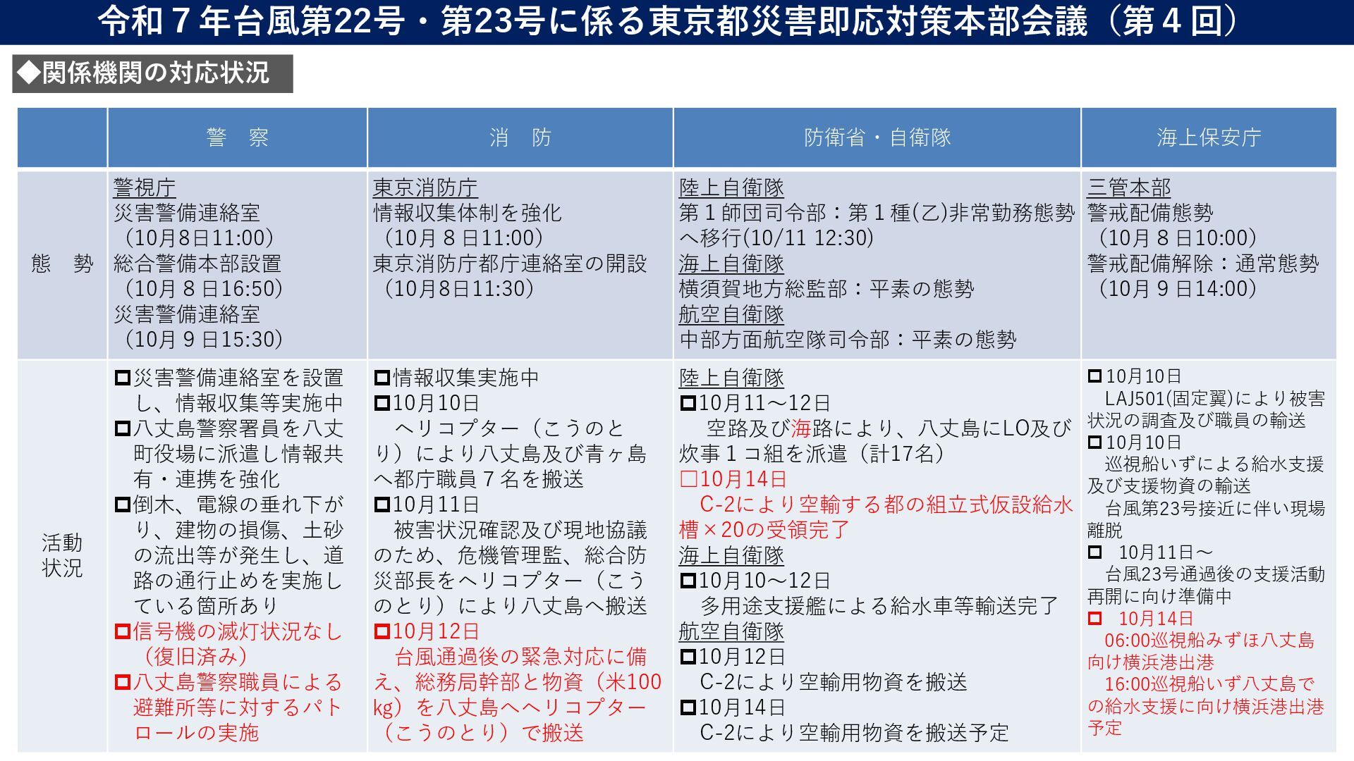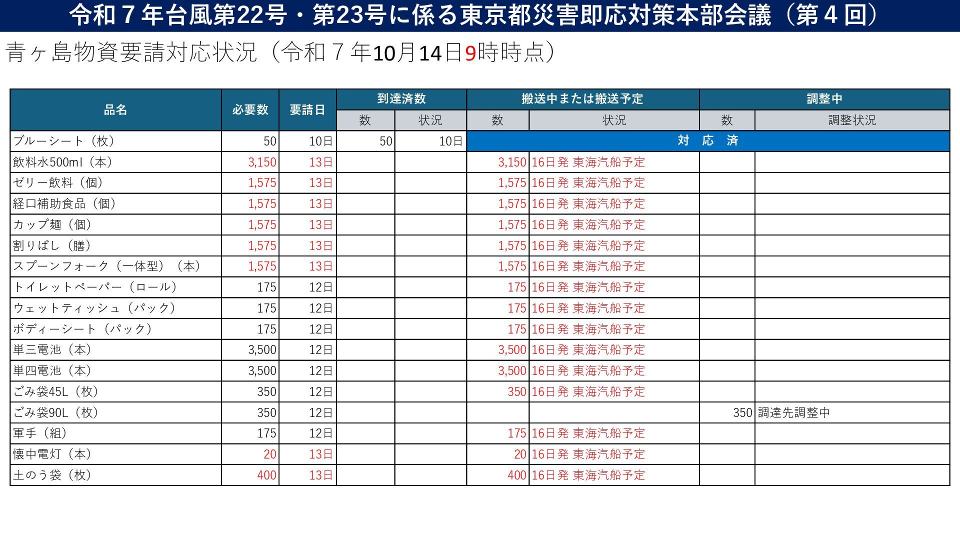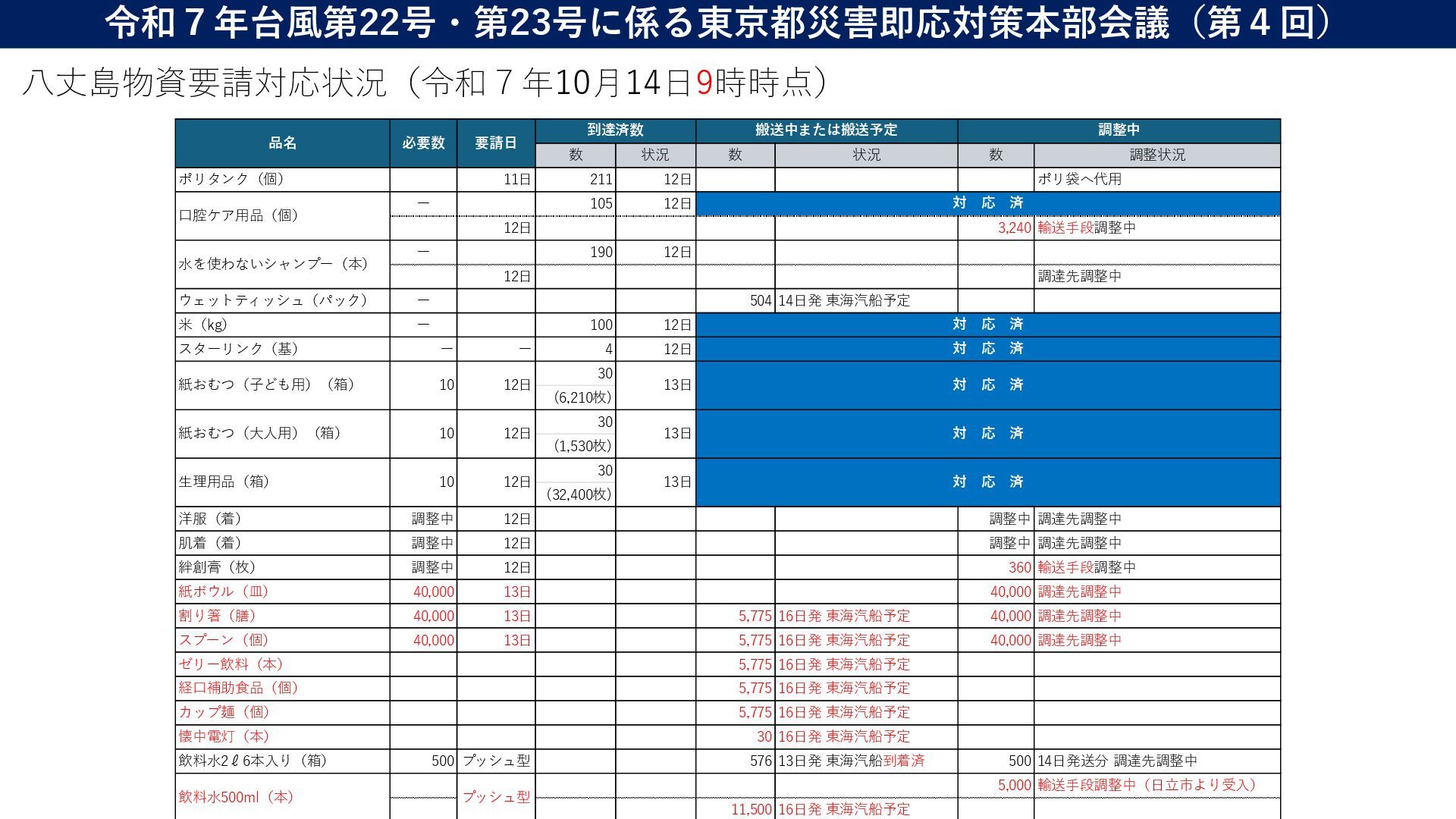 600 10日 1,000 9日 1,000 12日 1,000 12日 1,000 9日 37 11日 107 12日 200 12日 656 更に必要かどうか町役場に確認中 2,400 9日 2,400 11日 2,400 10日 2,400 12日 2,400 13日 2,400 9日 2,400 10日 4,000 12日 4,000 13日 500 10日 500 11日17時 ー ー 105 12日 ー ー 576 12日 720 10日 960 12日 756 13日発 東海汽船到着済 3,648 14日 ANA予定 3,600 14日発 東海汽船予定 アルコール 消毒液(個) 携帯トイレ(回分) 228,000 10日 228,800 12日 単三電池(本) 18,400 2,002 12日 18,400 14日発 東海汽船予定 単一電池(本) 5,000 885 12日 5,000 14日発 東海汽船予定 単二電池(本) 5,000 718 12日 5,000 14日発 東海汽船予定 ー 211 12日 12日 6,800 輸送手段調整中 調整中 品名 必要数 要請日 到達済数 搬送中または搬送予定 毛布(枚) 段ボールベッド(台) 飲料水500ml(本) 水運搬用ポリ袋6L(枚) 対 応 済 対 応 済 ブルーシート(枚) 2,880 11日 対 応 済 対 応 済 対 応 済 対 応 済 対 応 済 対 応 済 500 10日 200 12日 50 14日発 東海汽船予定 250 調達先調整中 対 応 済 対 応 済 対 応 済 対 応 済 対 応 済 対 応 済 対 応 済 対 応 済 トイレットペーパー(ロール) ボディーシート(パック) 令和7年台風第22号・第23号に係る東京都災害即応対策本部会議(第4回)