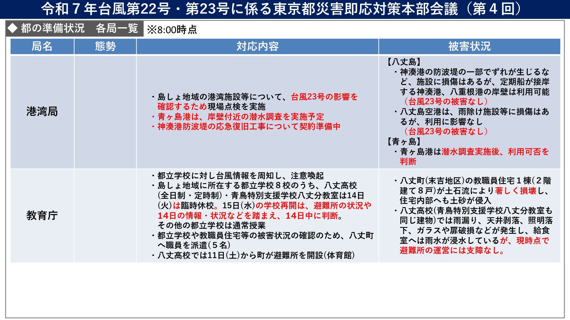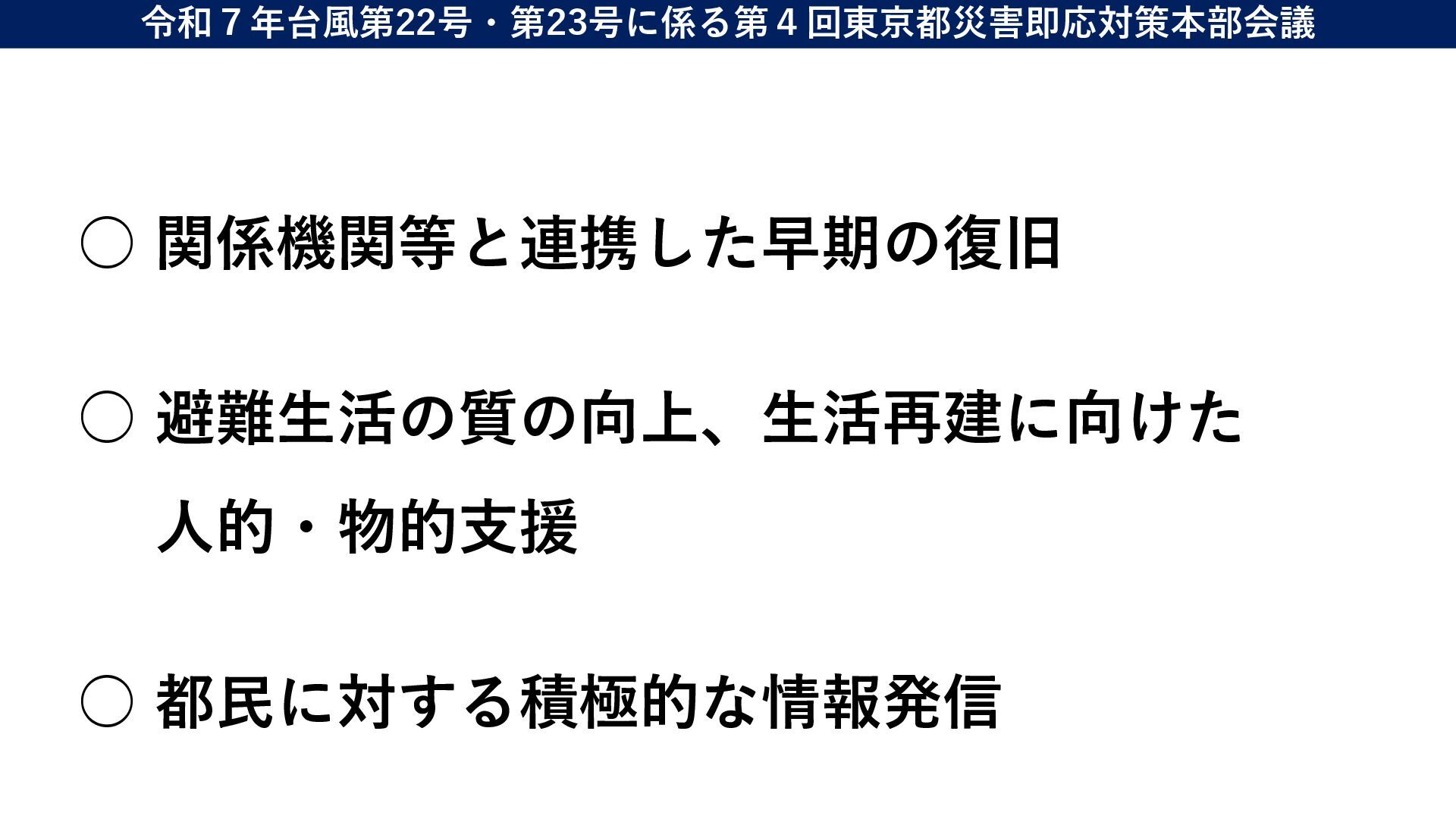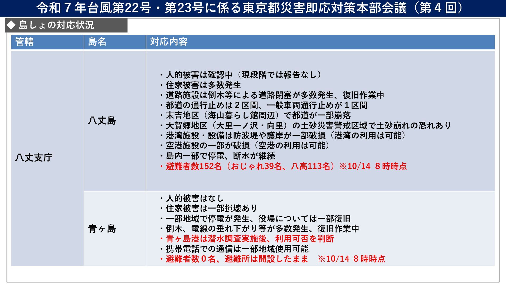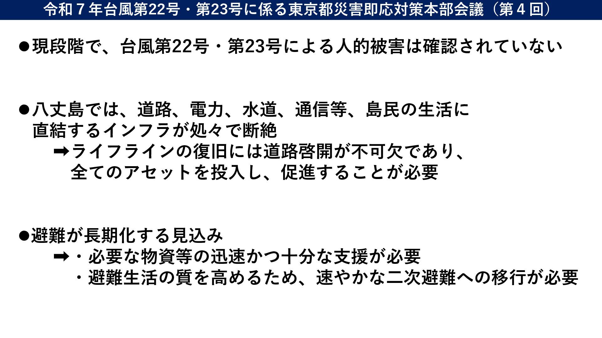 600 10日 1,000 9日 1,000 12日 1,000 12日 1,000 9日 37 11日 107 12日 200 12日 656 更に必要かどうか町役場に確認中 2,400 9日 2,400 11日 2,400 10日 2,400 12日 2,400 13日 2,400 9日 2,400 10日 4,000 12日 4,000 13日 500 10日 500 11日17時 ー ー 105 12日 ー ー 576 12日 720 10日 960 12日 756 13日発 東海汽船到着済 3,648 14日 ANA予定 3,600 14日発 東海汽船予定 アルコール 消毒液(個) 携帯トイレ(回分) 228,000 10日 228,800 12日 単三電池(本) 18,400 2,002 12日 18,400 14日発 東海汽船予定 単一電池(本) 5,000 885 12日 5,000 14日発 東海汽船予定 単二電池(本) 5,000 718 12日 5,000 14日発 東海汽船予定 ー 211 12日 12日 6,800 輸送手段調整中 調整中 品名 必要数 要請日 到達済数 搬送中または搬送予定 毛布(枚) 段ボールベッド(台) 飲料水500ml(本) 水運搬用ポリ袋6L(枚) 対 応 済 対 応 済 ブルーシート(枚) 2,880 11日 対 応 済 対 応 済 対 応 済 対 応 済 対 応 済 対 応 済 500 10日 200 12日 50 14日発 東海汽船予定 250 調達先調整中 対 応 済 対 応 済 対 応 済 対 応 済 対 応 済 対 応 済 対 応 済 対 応 済 トイレットペーパー(ロール) ボディーシート(パック) 令和7年台風第22号・第23号に係る東京都災害即応対策本部会議(第4回)