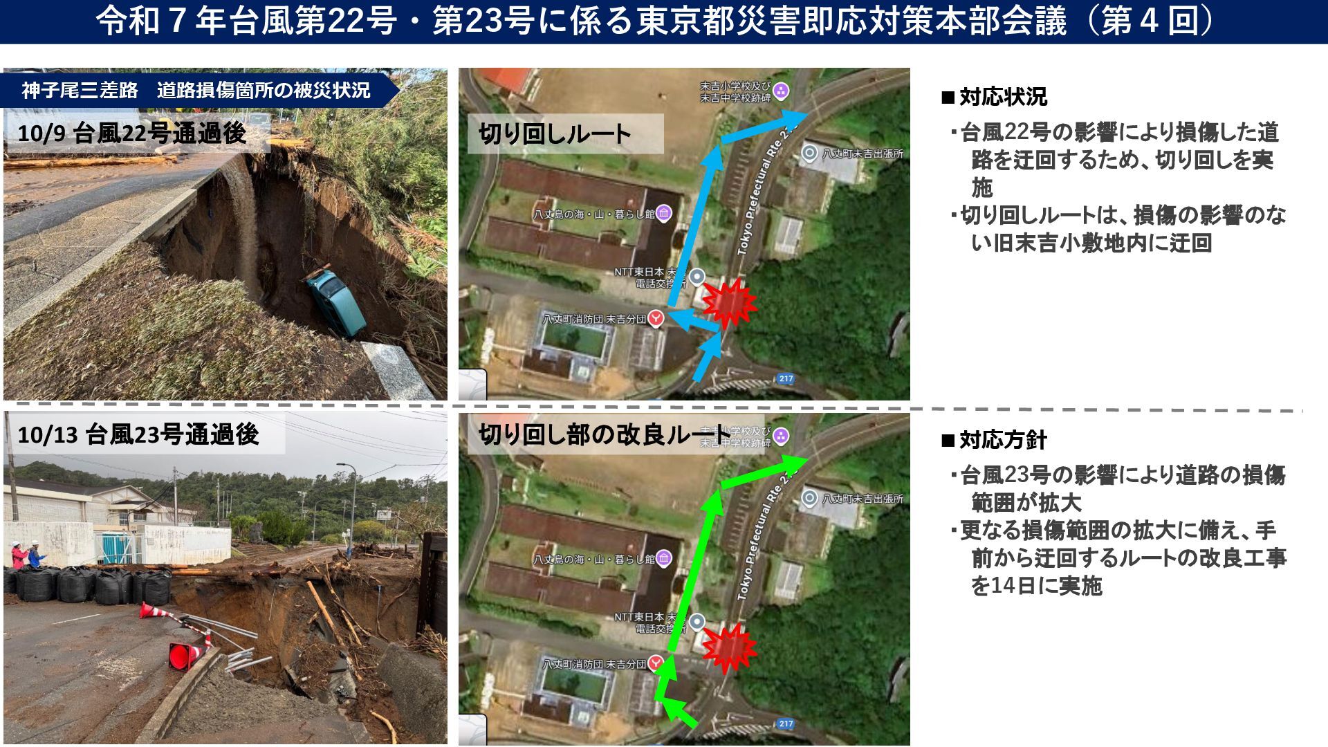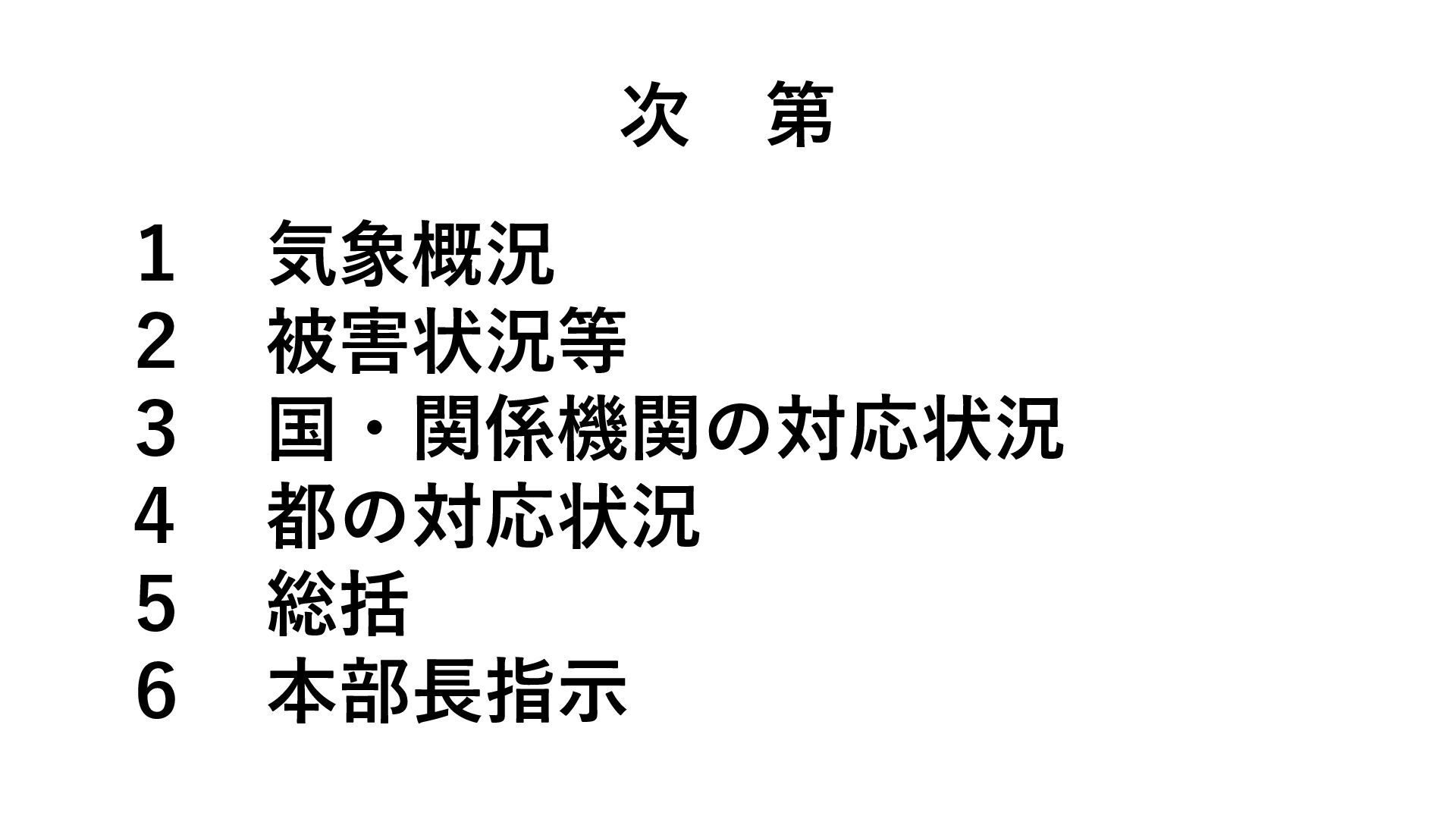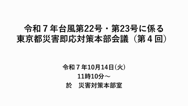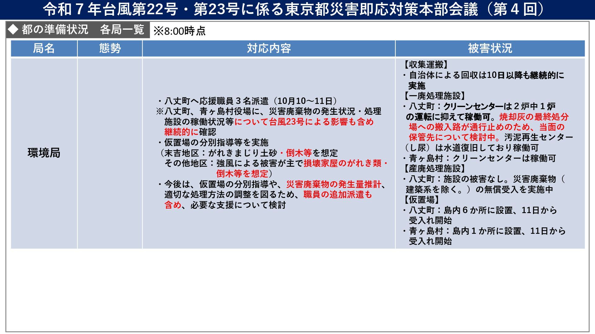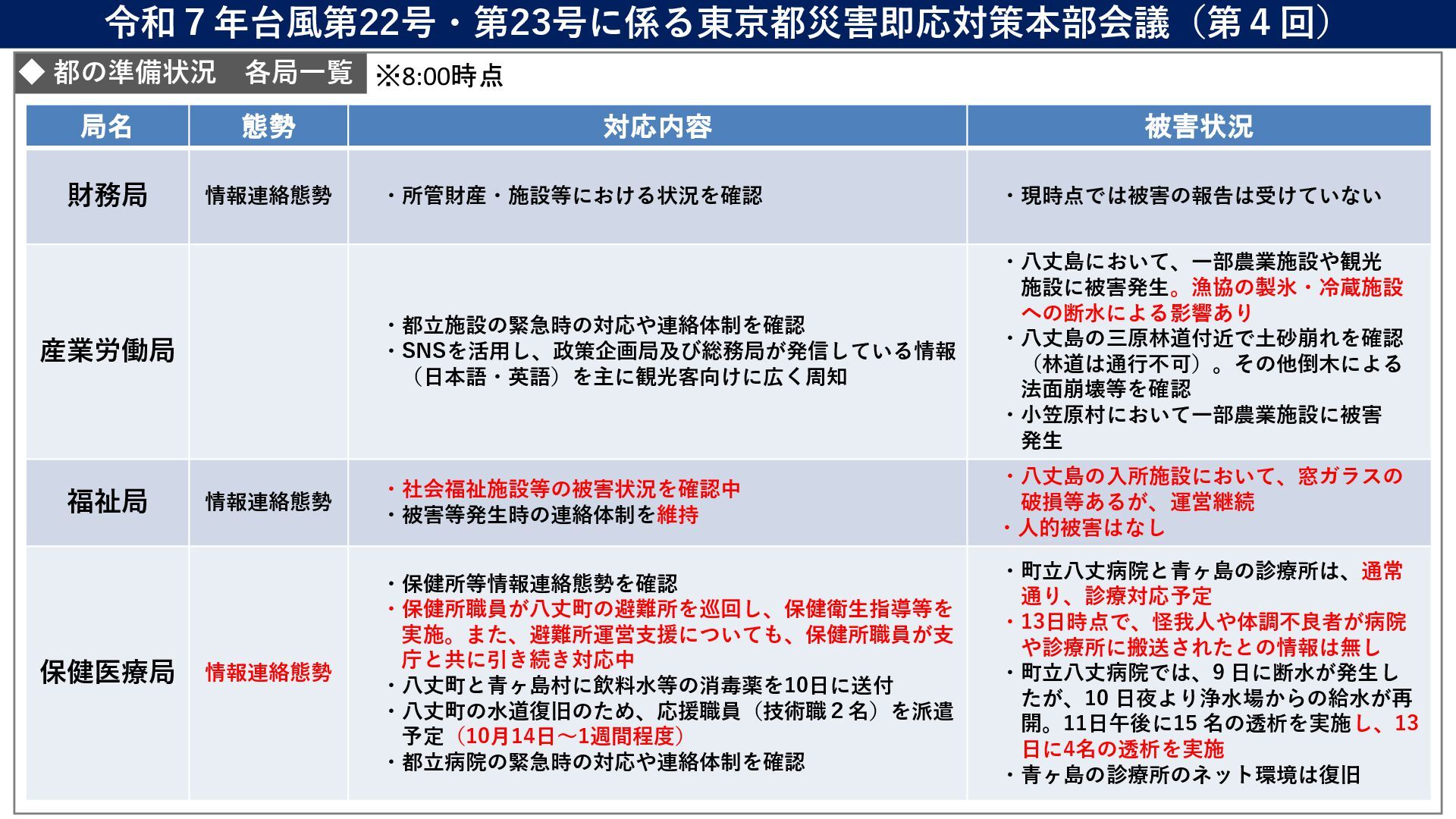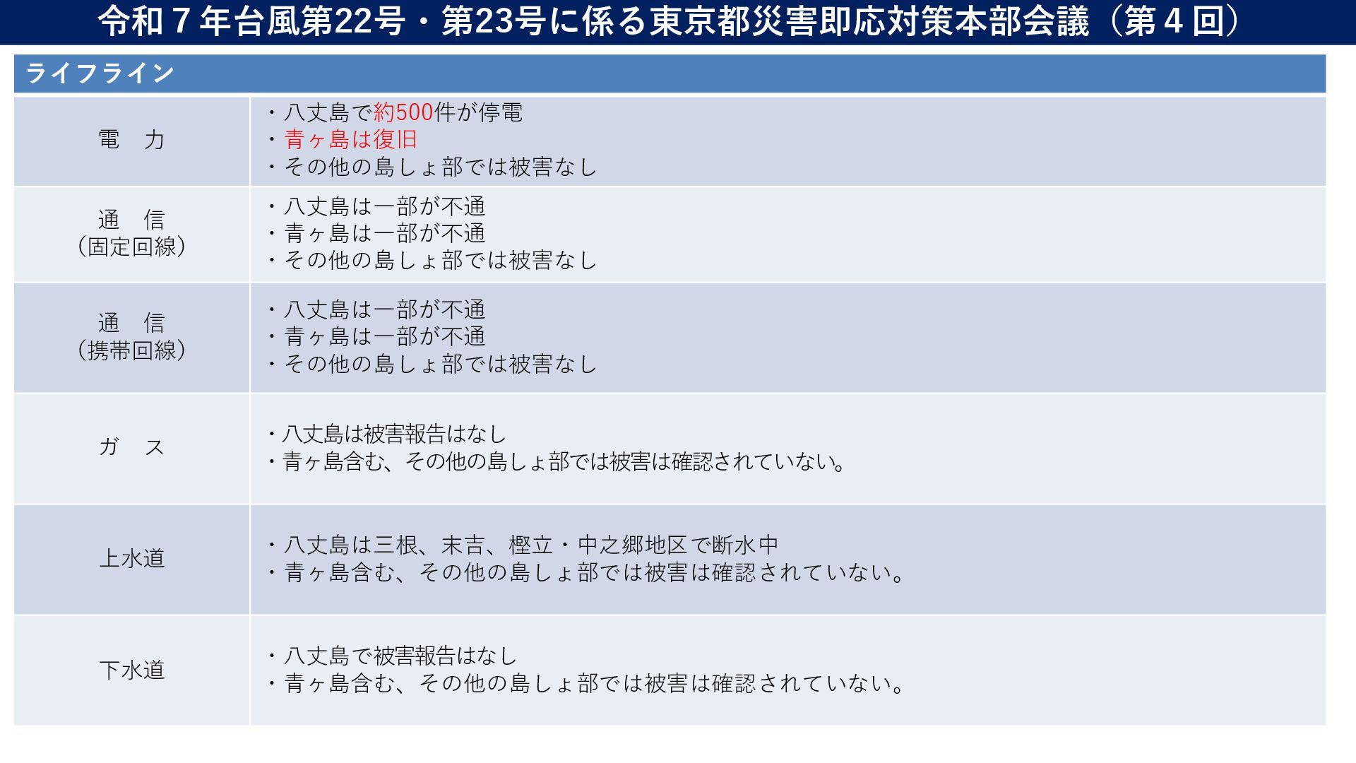600 10日 1,000 9日 1,000 12日 1,000 12日 1,000 9日 37 11日 107 12日 200 12日 656 更に必要かどうか町役場に確認中 2,400 9日 2,400 11日 2,400 10日 2,400 12日 2,400 13日 2,400 9日 2,400 10日 4,000 12日 4,000 13日 500 10日 500 11日17時 ー ー 105 12日 ー ー 576 12日 720 10日 960 12日 756 13日発 東海汽船到着済 3,648 14日 ANA予定 3,600 14日発 東海汽船予定 アルコール 消毒液(個) 携帯トイレ(回分) 228,000 10日 228,800 12日 単三電池(本) 18,400 2,002 12日 18,400 14日発 東海汽船予定 単一電池(本) 5,000 885 12日 5,000 14日発 東海汽船予定 単二電池(本) 5,000 718 12日 5,000 14日発 東海汽船予定 ー 211 12日 12日 6,800 輸送手段調整中 調整中 品名 必要数 要請日 到達済数 搬送中または搬送予定 毛布(枚) 段ボールベッド(台) 飲料水500ml(本) 水運搬用ポリ袋6L(枚) 対 応 済 対 応 済 ブルーシート(枚) 2,880 11日 対 応 済 対 応 済 対 応 済 対 応 済 対 応 済 対 応 済 500 10日 200 12日 50 14日発 東海汽船予定 250 調達先調整中 対 応 済 対 応 済 対 応 済 対 応 済 対 応 済 対 応 済 対 応 済 対 応 済 トイレットペーパー(ロール) ボディーシート(パック) 令和7年台風第22号・第23号に係る東京都災害即応対策本部会議(第4回)