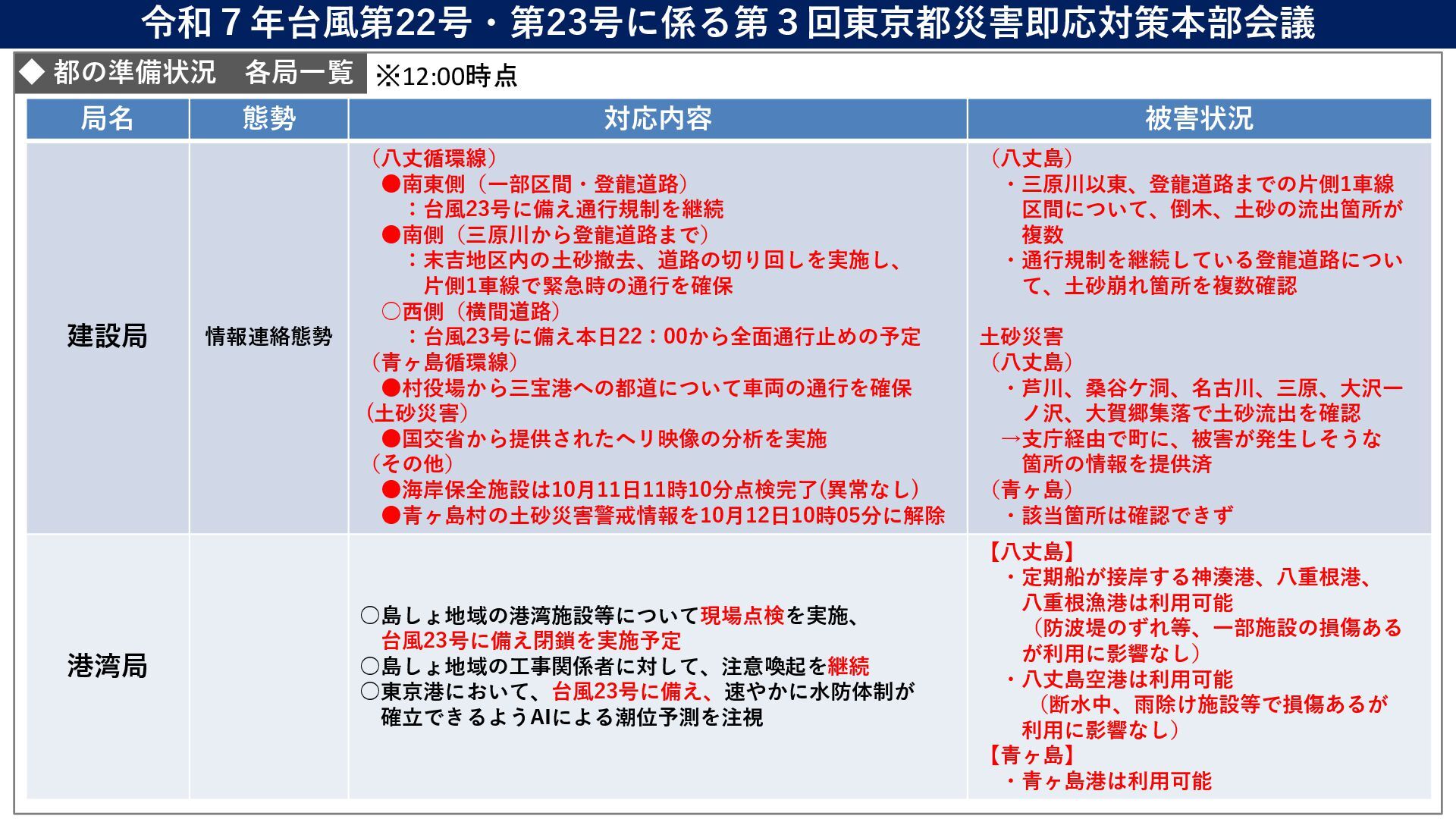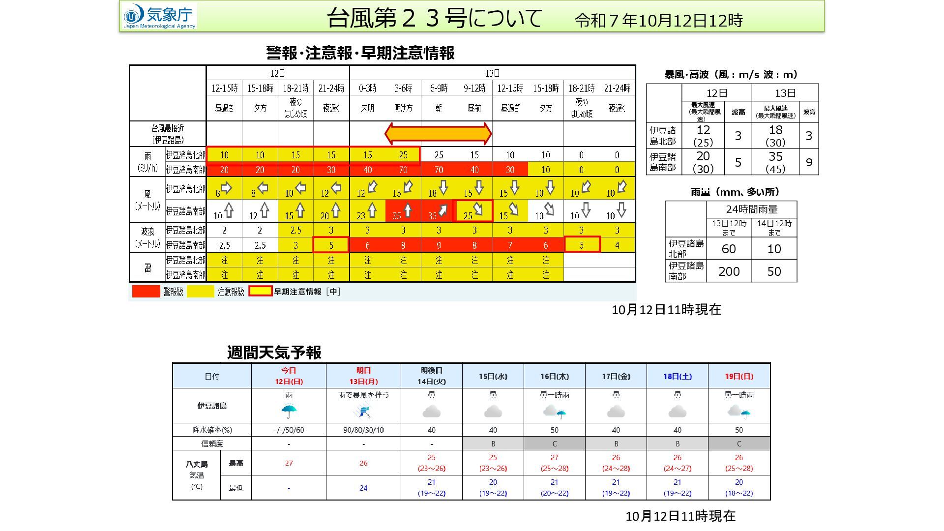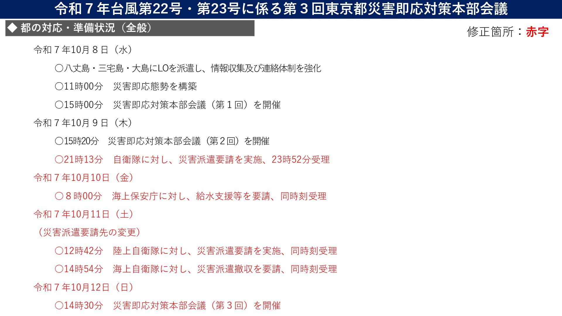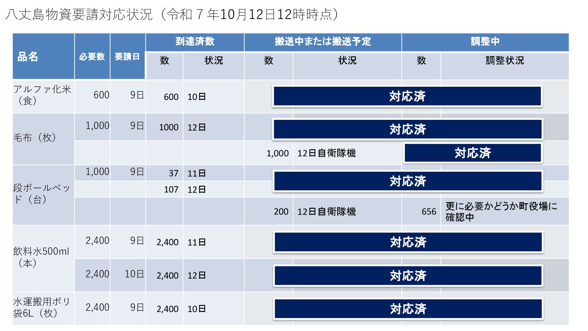 数 調整状況 単三電池 (本) 18,400 2,002 12日自衛隊機 18,400 輸送手段調整中 単一電池 (本) 5,000 885 12日自衛隊機 5,000 輸送手段調整中 単二電池 (本) 5,000 718 12日自衛隊機 5,000 輸送手段調整中 ボディーシー ト(パック) ー 211 12日自衛隊機 ポリタンク (個) 11日 211 12日自衛隊機 八丈町に必要数を確認中 口腔ケア用品 (個) ー 105 12日自衛隊機 水を使わない シャンプー (本) ー 190 12日自衛隊機 ウェットティッ シュ(パッ ク) ー 500 輸送手段調整中 対応済 対応済 対応済 八丈島物資要請対応状況(令和7年10月12日12時時点)