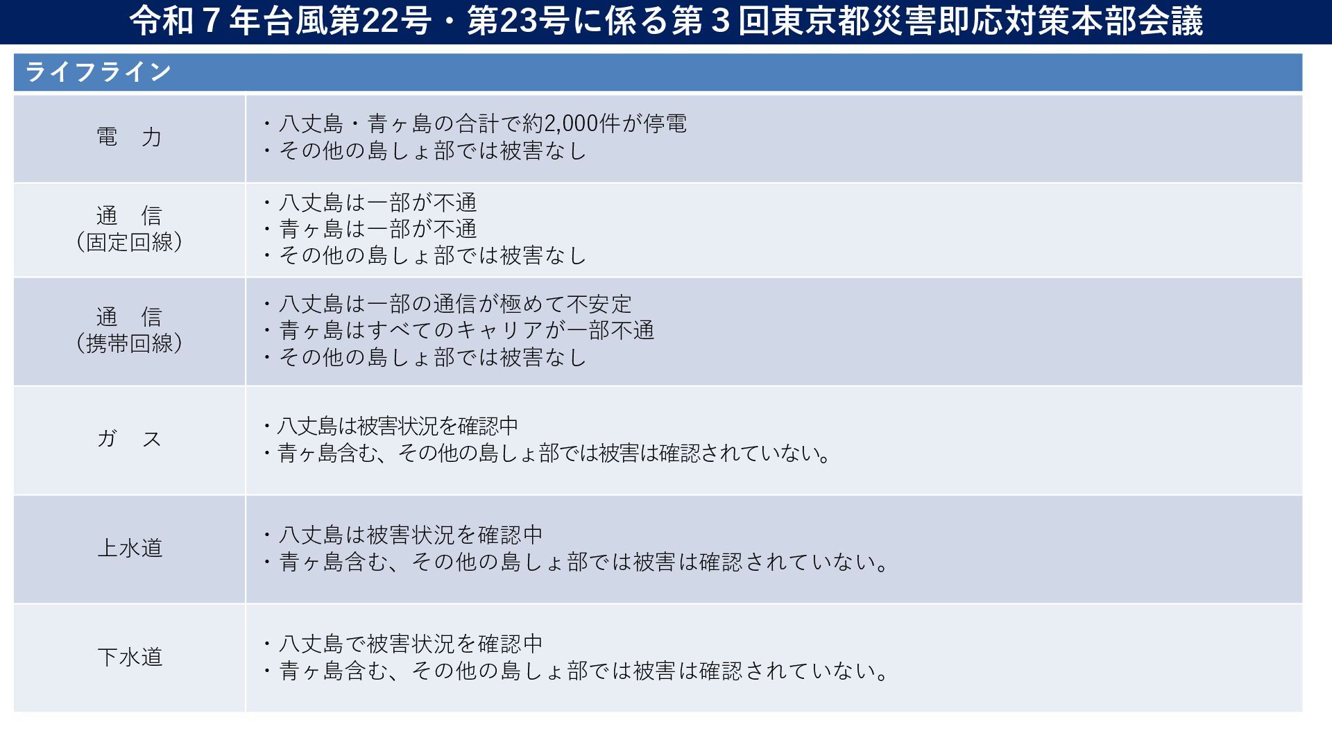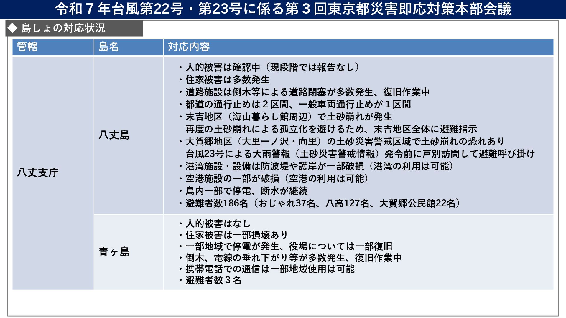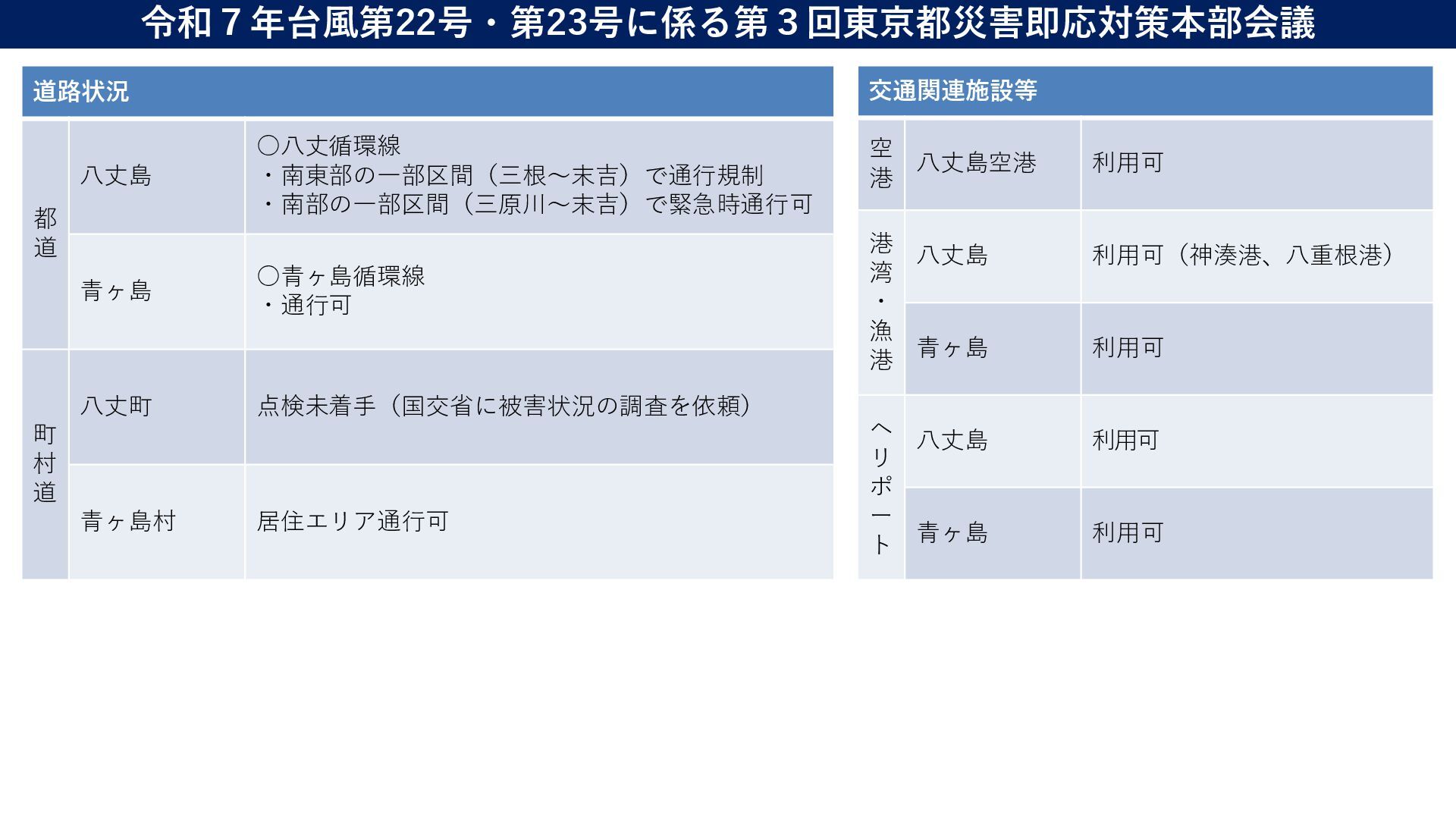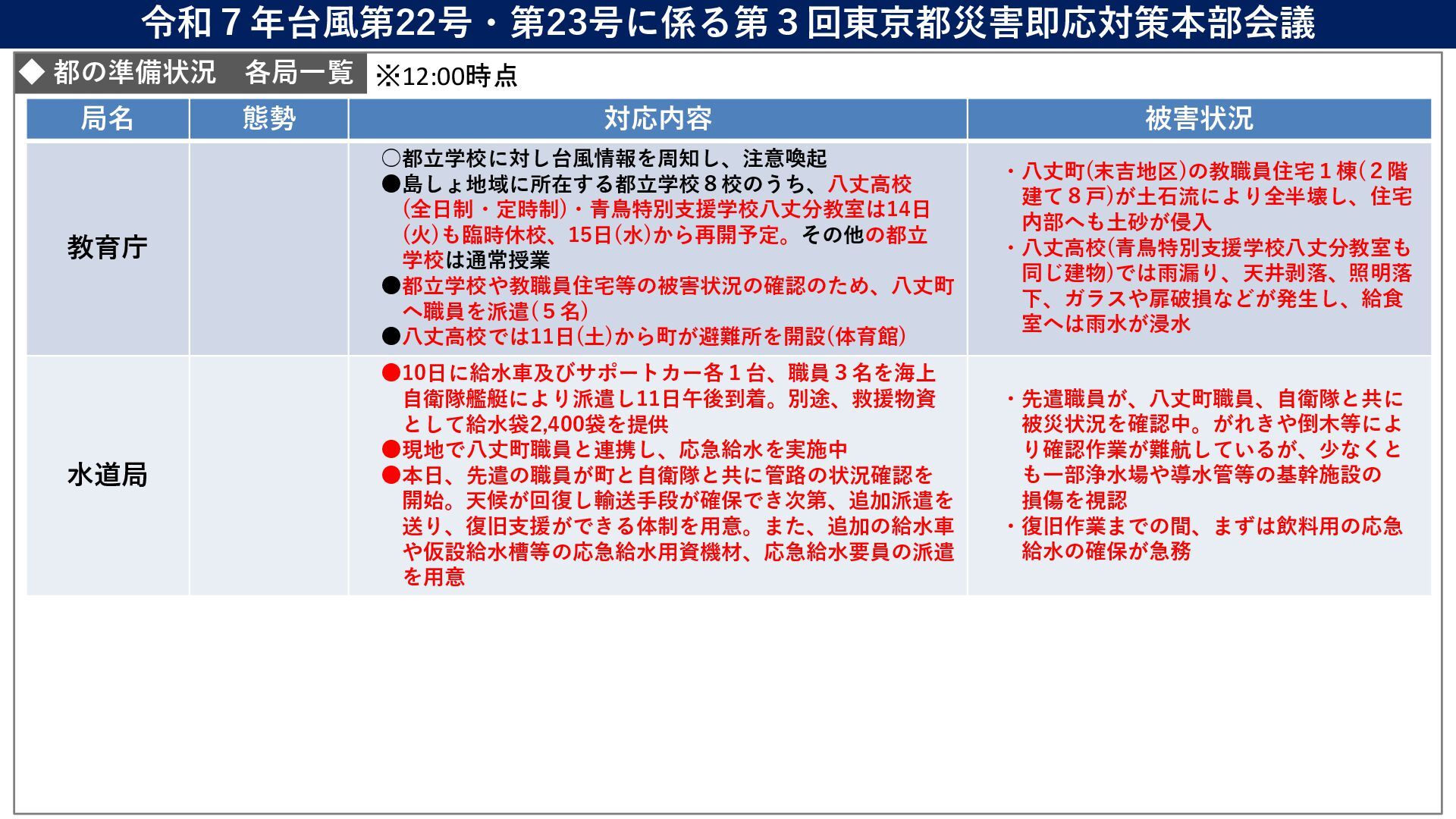 数 調整状況 単三電池 (本) 18,400 2,002 12日自衛隊機 18,400 輸送手段調整中 単一電池 (本) 5,000 885 12日自衛隊機 5,000 輸送手段調整中 単二電池 (本) 5,000 718 12日自衛隊機 5,000 輸送手段調整中 ボディーシー ト(パック) ー 211 12日自衛隊機 ポリタンク (個) 11日 211 12日自衛隊機 八丈町に必要数を確認中 口腔ケア用品 (個) ー 105 12日自衛隊機 水を使わない シャンプー (本) ー 190 12日自衛隊機 ウェットティッ シュ(パッ ク) ー 500 輸送手段調整中 対応済 対応済 対応済 八丈島物資要請対応状況(令和7年10月12日12時時点)