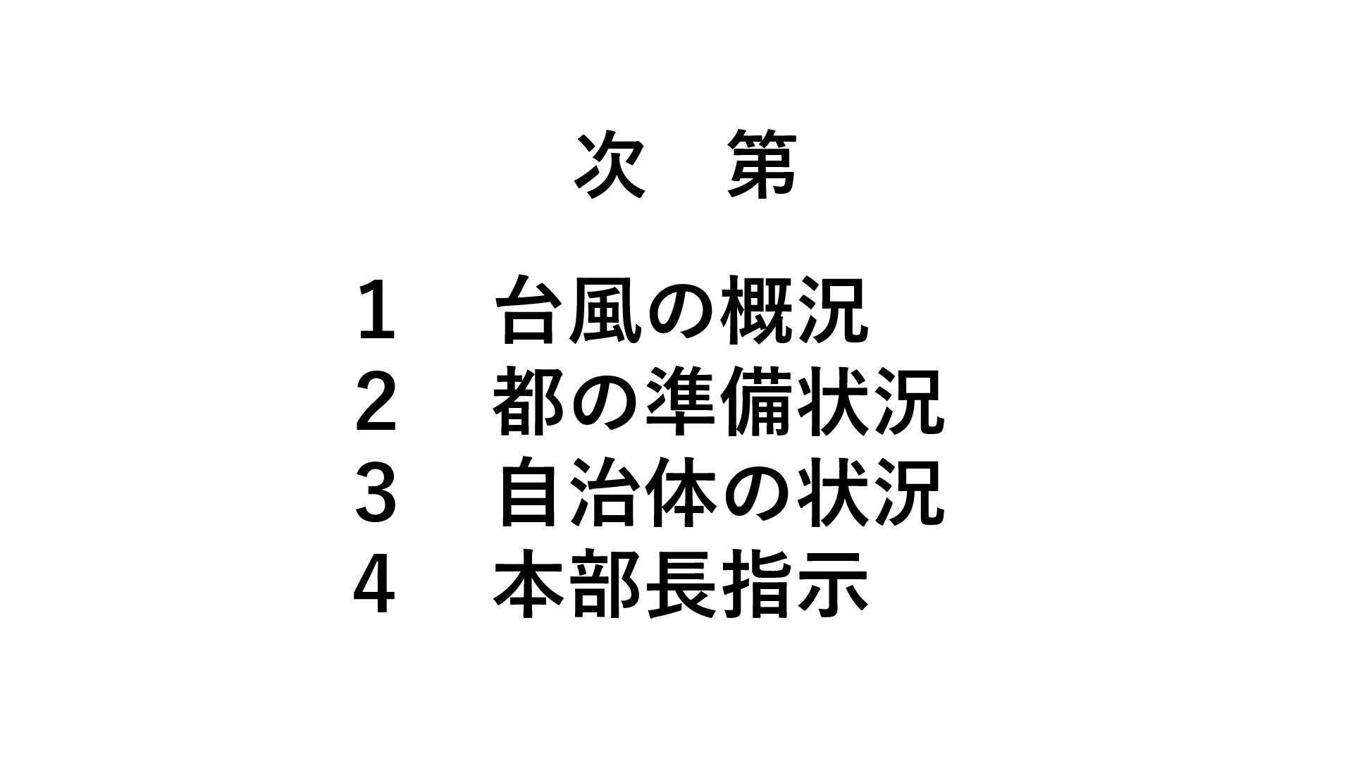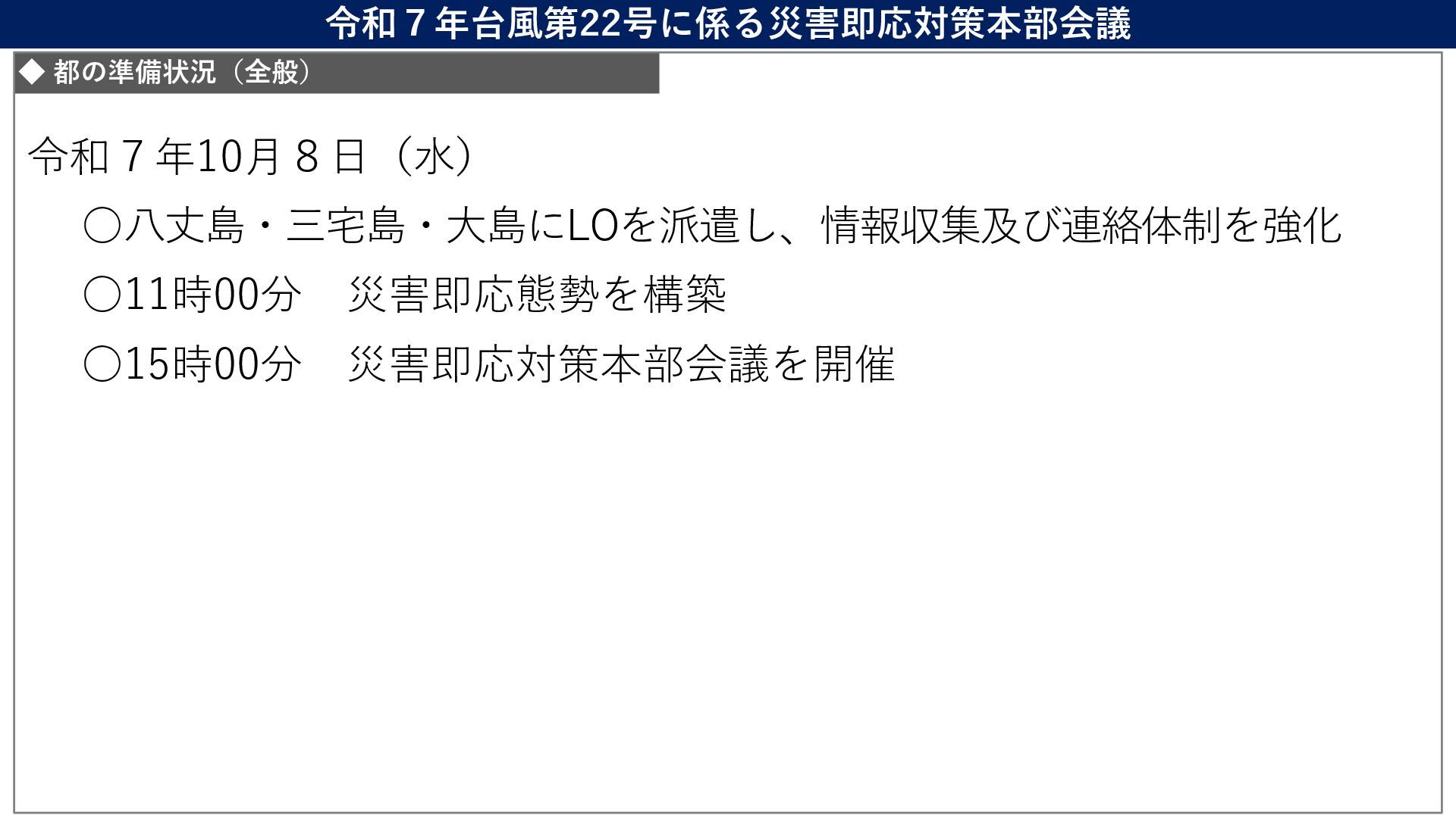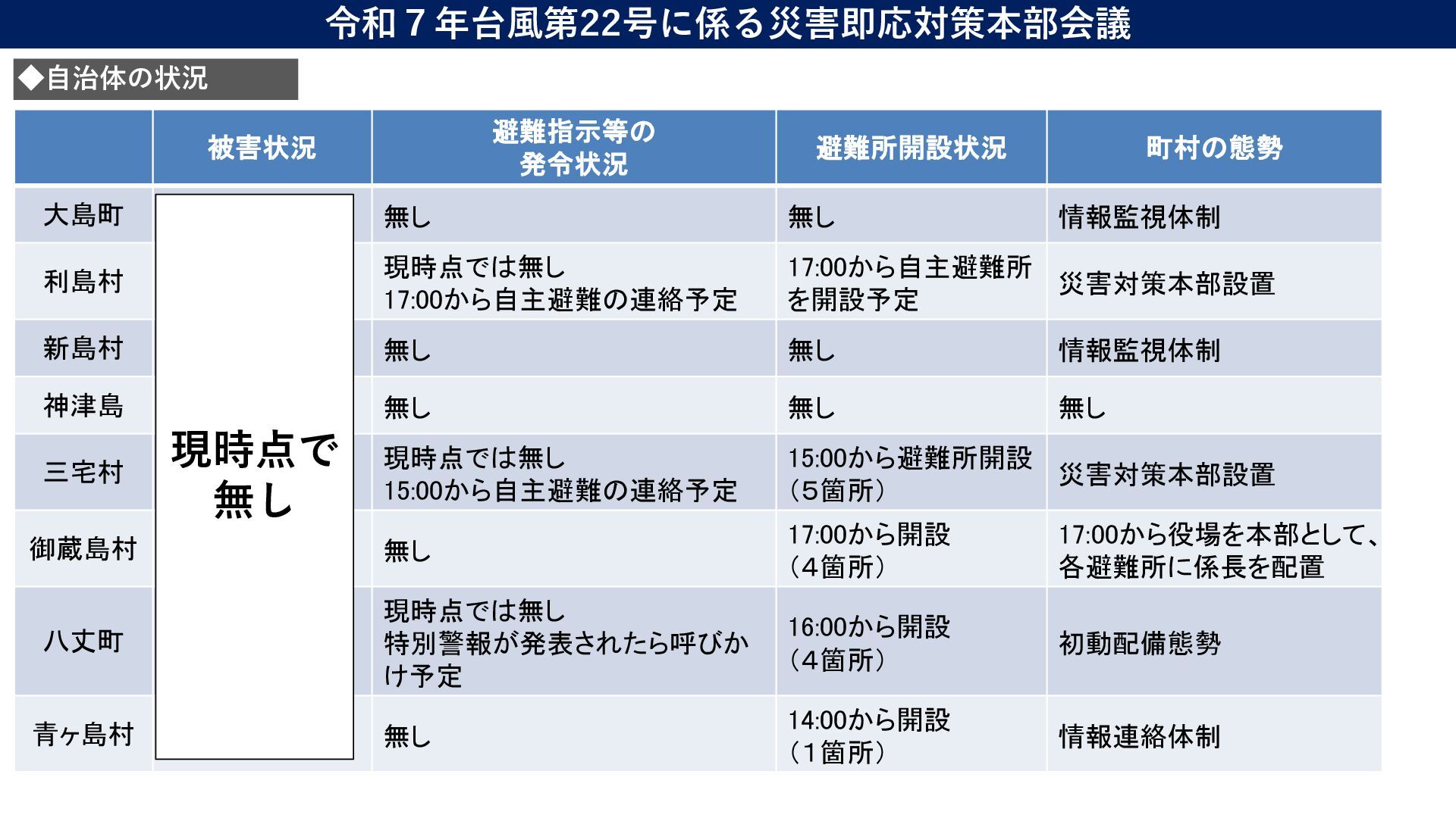 情報監視体制 利島村 現時点では無し 17:00から自主避難の連絡予定 17:00から自主避難所 を開設予定 災害対策本部設置 新島村 無し 無し 情報監視体制 神津島 無し 無し 無し 三宅村 現時点では無し 15:00から自主避難の連絡予定 15:00から避難所開設 (5箇所) 災害対策本部設置 御蔵島村 無し 17:00から開設 (4箇所) 17:00から役場を本部として、 各避難所に係長を配置 八丈町 現時点では無し 特別警報が発表されたら呼びか け予定 16:00から開設 (4箇所) 初動配備態勢 青ヶ島村 無し 14:00から開設 (1箇所) 情報連絡体制 現時点で 無し