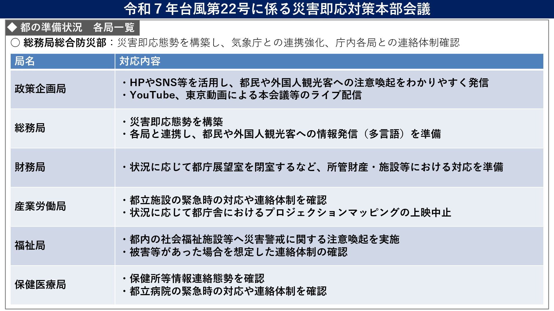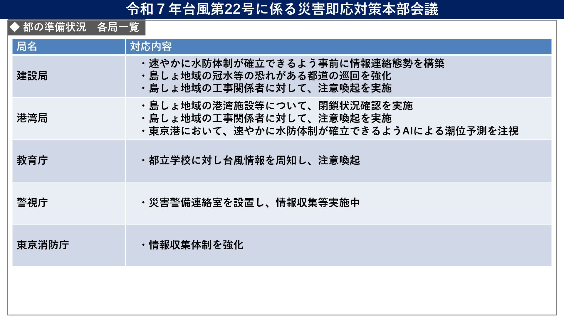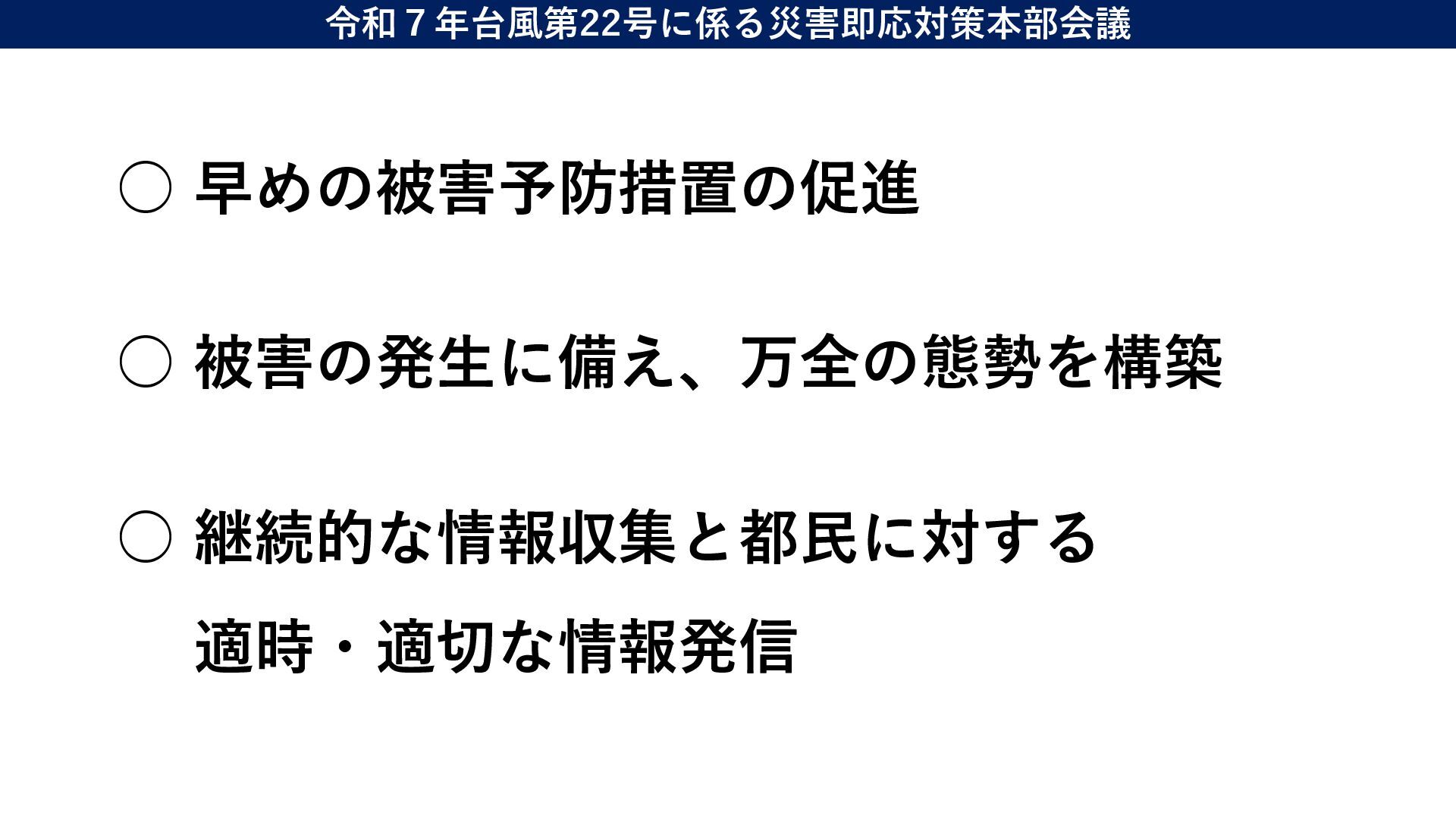 情報監視体制 利島村 現時点では無し 17:00から自主避難の連絡予定 17:00から自主避難所 を開設予定 災害対策本部設置 新島村 無し 無し 情報監視体制 神津島 無し 無し 無し 三宅村 現時点では無し 15:00から自主避難の連絡予定 15:00から避難所開設 (5箇所) 災害対策本部設置 御蔵島村 無し 17:00から開設 (4箇所) 17:00から役場を本部として、 各避難所に係長を配置 八丈町 現時点では無し 特別警報が発表されたら呼びか け予定 16:00から開設 (4箇所) 初動配備態勢 青ヶ島村 無し 14:00から開設 (1箇所) 情報連絡体制 現時点で 無し