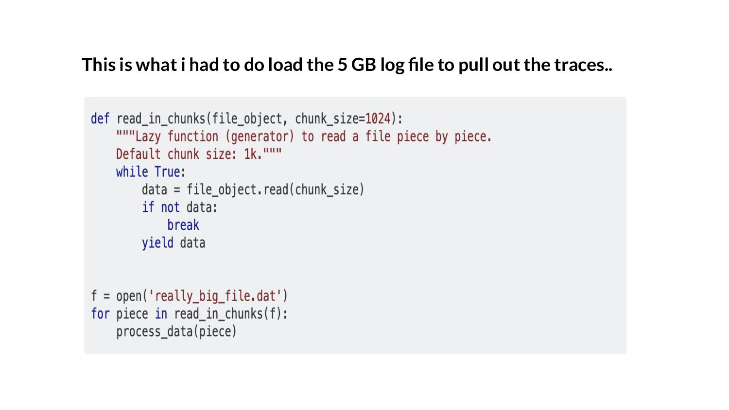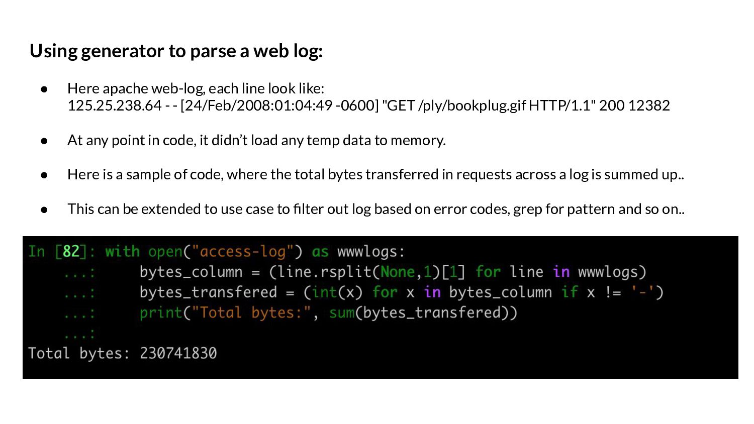web-log, each line look like: 125.25.238.64 - - [24/Feb/2008:01:04:49 -0600] "GET /ply/bookplug.gif HTTP/1.1" 200 12382 • At any point in code, it didn’t load any temp data to memory. • Here is a sample of code, where the total bytes transferred in requests across a log is summed up.. • This can be extended to use case to filter out log based on error codes, grep for pattern and so on..