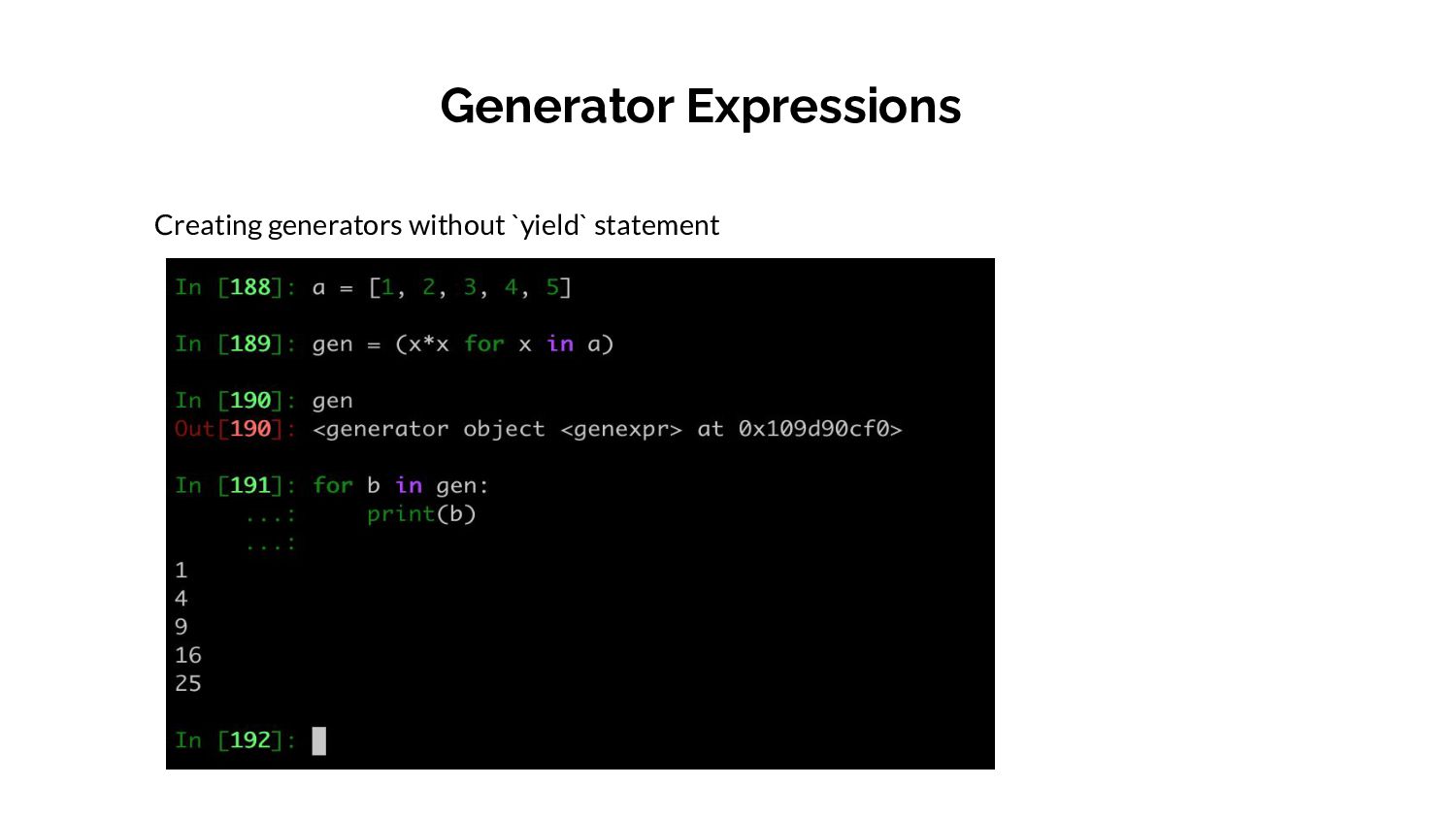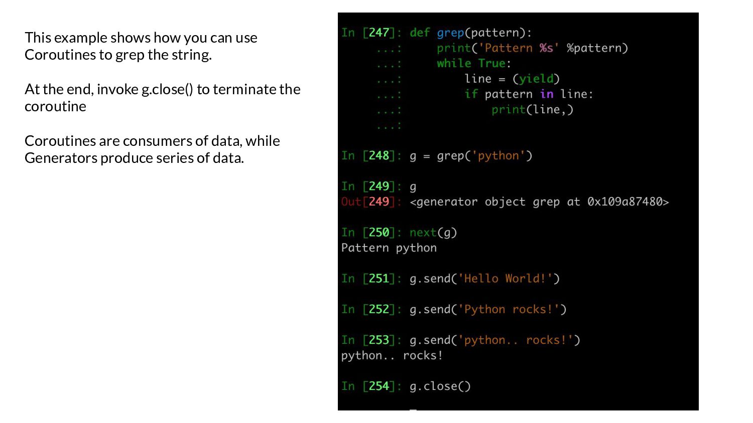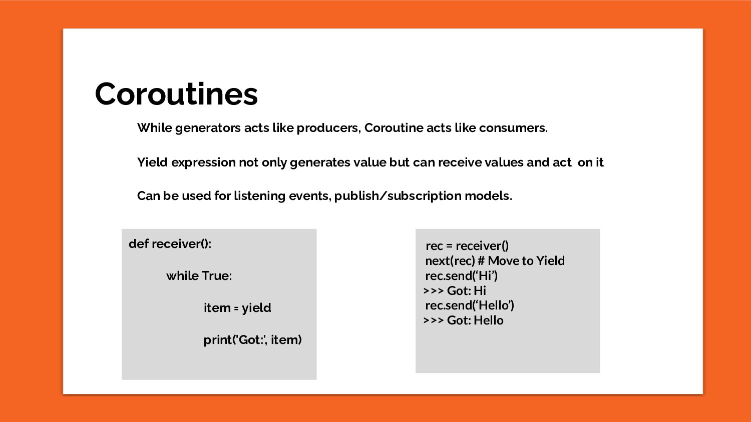 Yield expression not only generates value but can receive values and act on it Can be used for listening events, publish/subscription models. def receiver(): while True: item = yield print('Got:', item) rec = receiver() next(rec) # Move to Yield rec.send(‘Hi’) >>> Got: Hi rec.send(‘Hello’) >>> Got: Hello