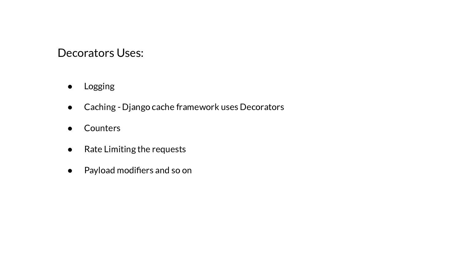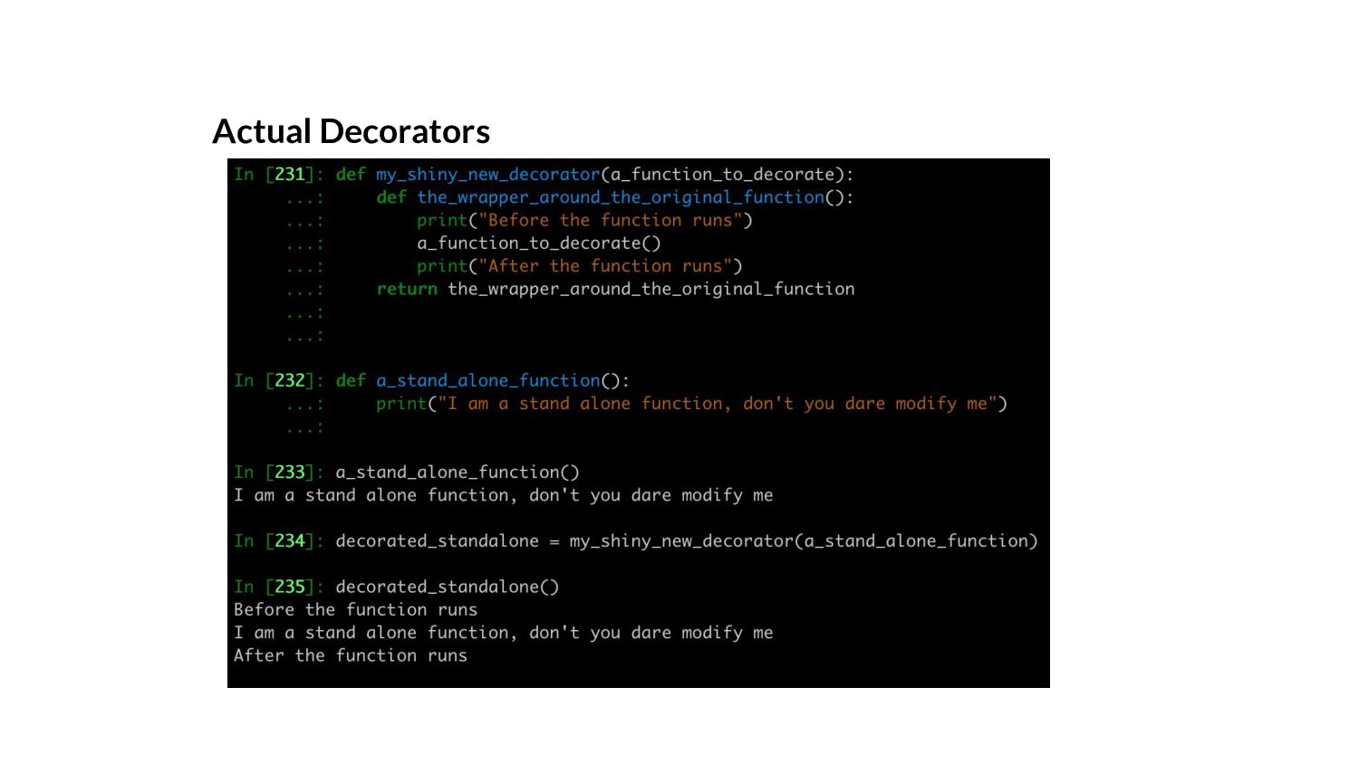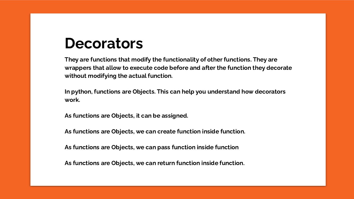 functions. They are wrappers that allow to execute code before and after the function they decorate without modifying the actual function. In python, functions are Objects. This can help you understand how decorators work. As functions are Objects, it can be assigned. As functions are Objects, we can create function inside function. As functions are Objects, we can pass function inside function As functions are Objects, we can return function inside function.