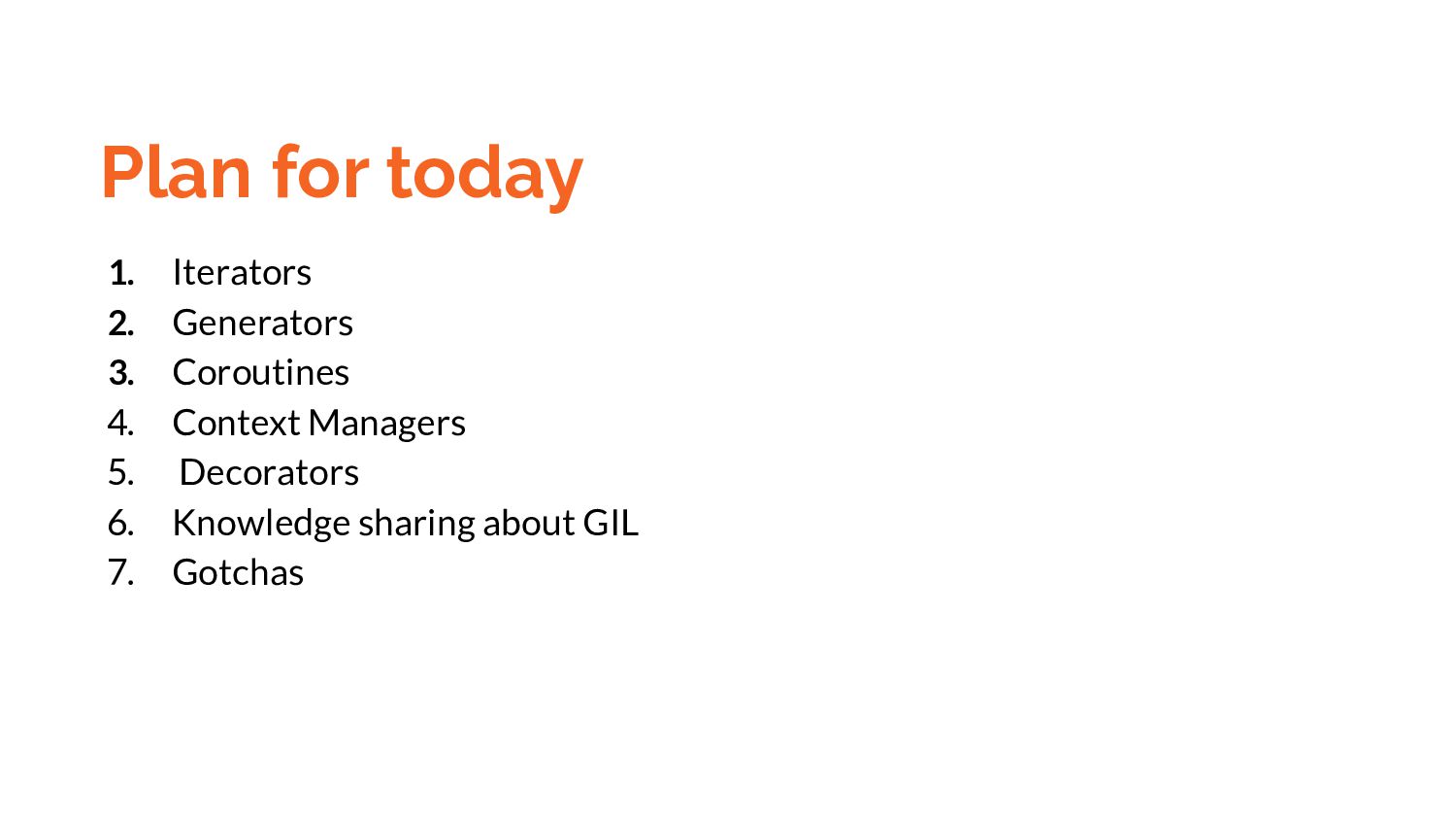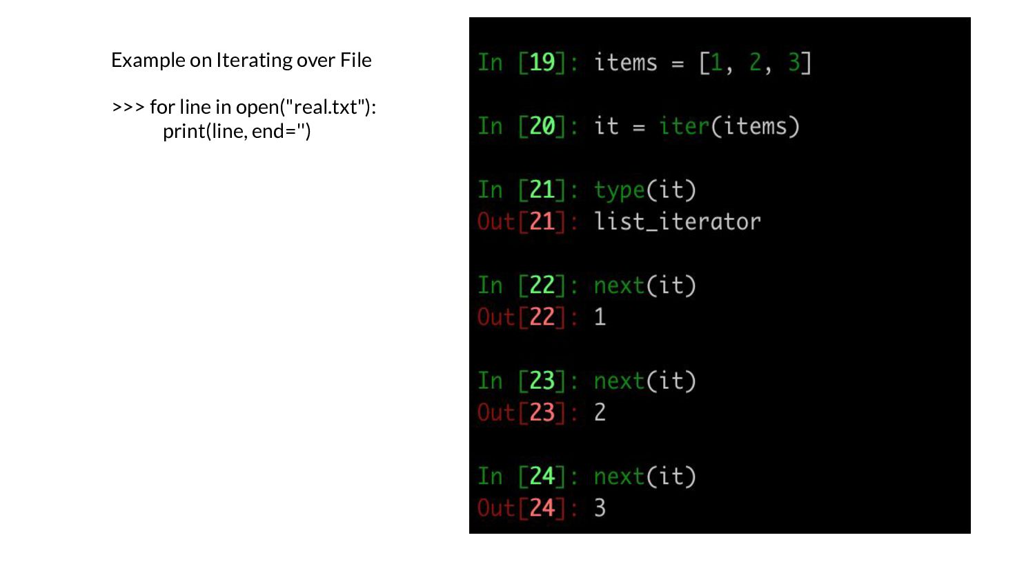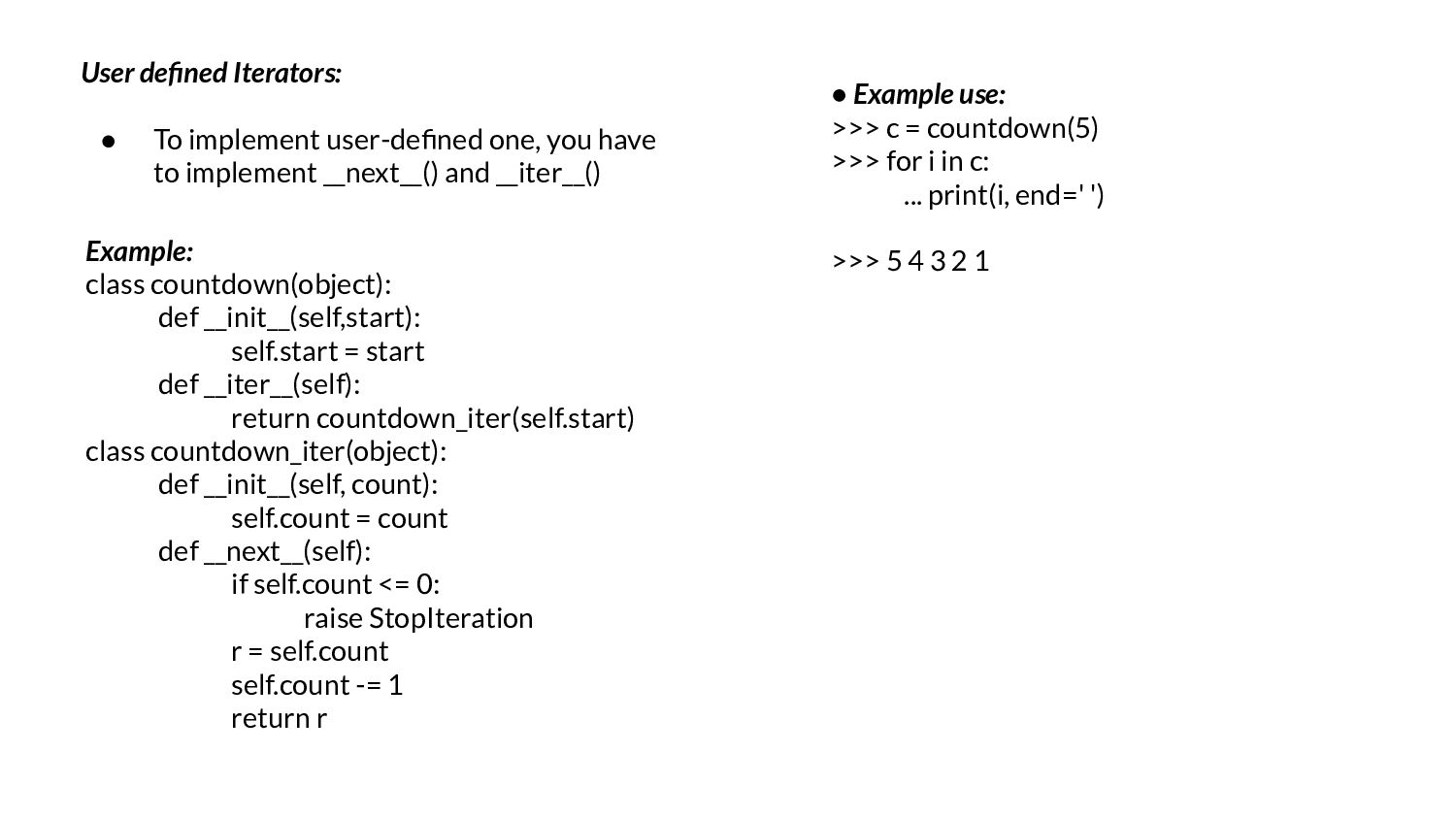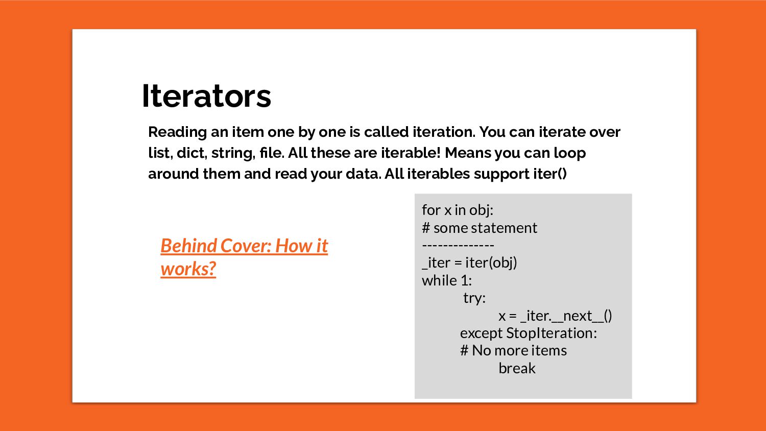 You can iterate over list, dict, string, file. All these are iterable! Means you can loop around them and read your data. All iterables support iter() for x in obj: # some statement -------------- _iter = iter(obj) while 1: try: x = _iter.__next__() except StopIteration: # No more items break Behind Cover: How it works?