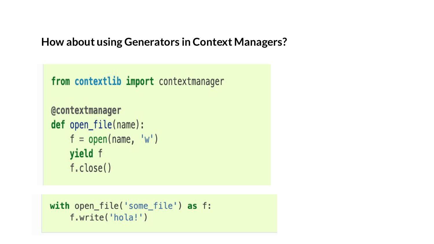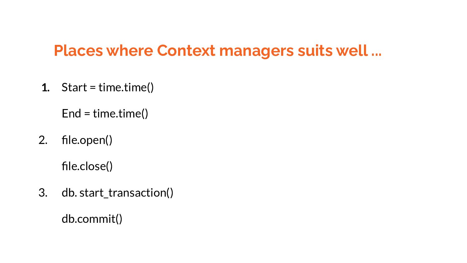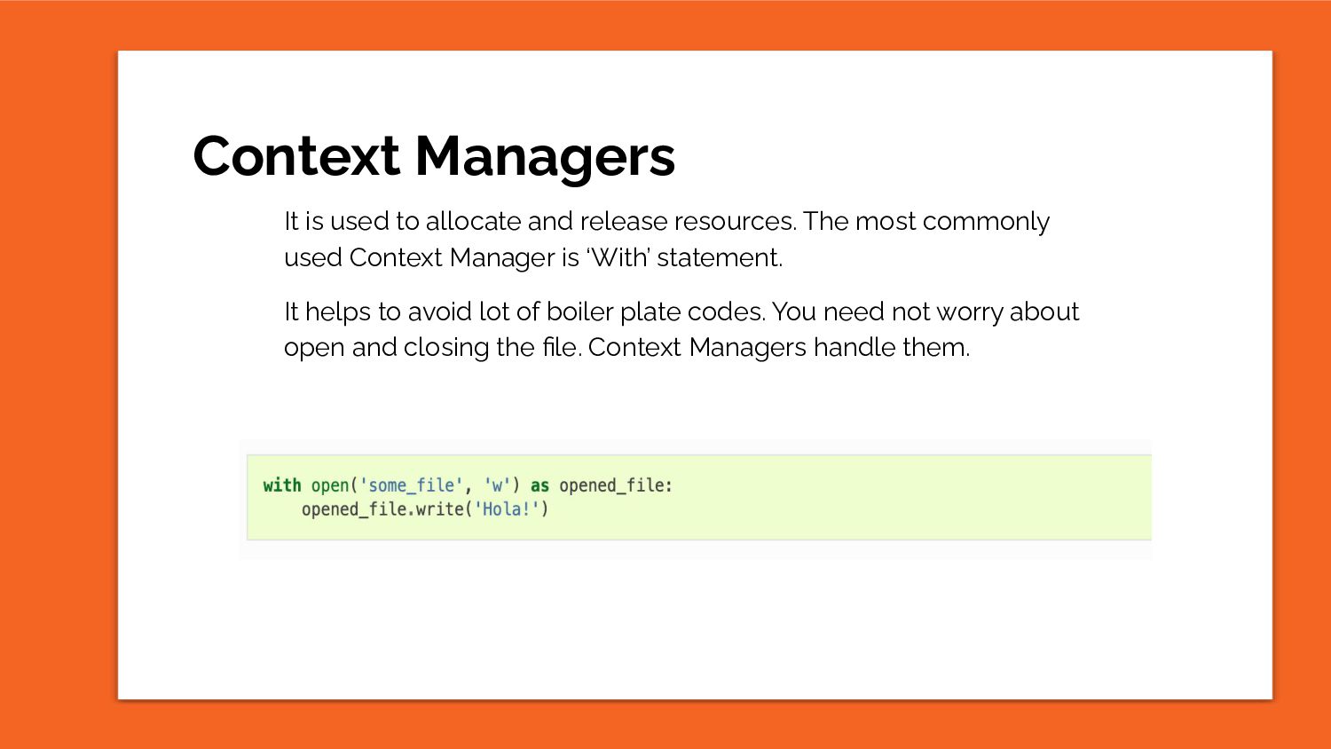 The most commonly used Context Manager is ‘With’ statement. It helps to avoid lot of boiler plate codes. You need not worry about open and closing the file. Context Managers handle them.